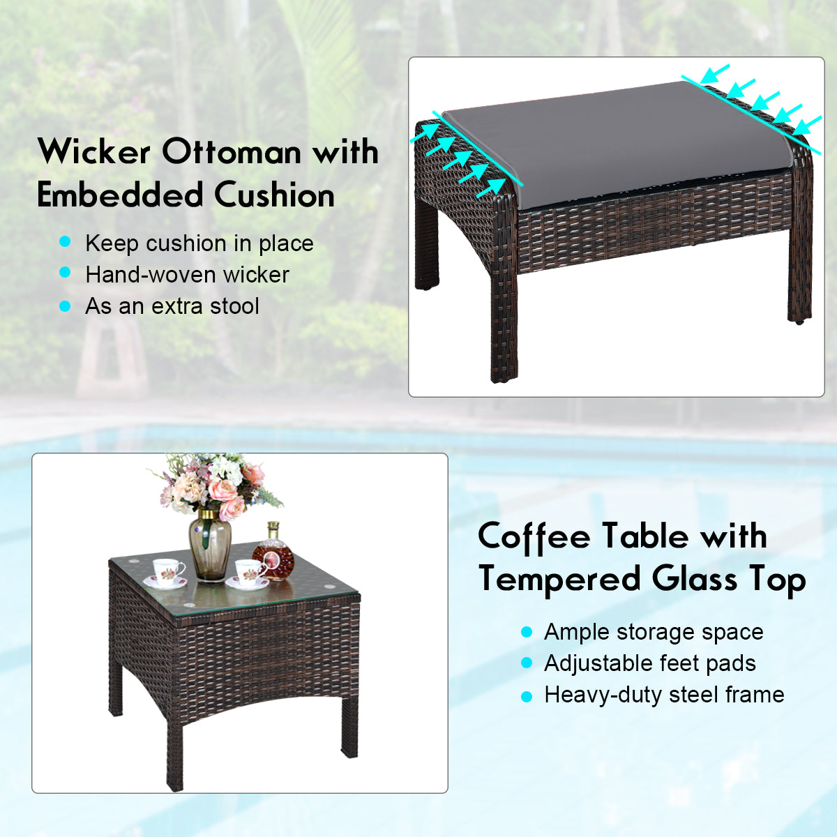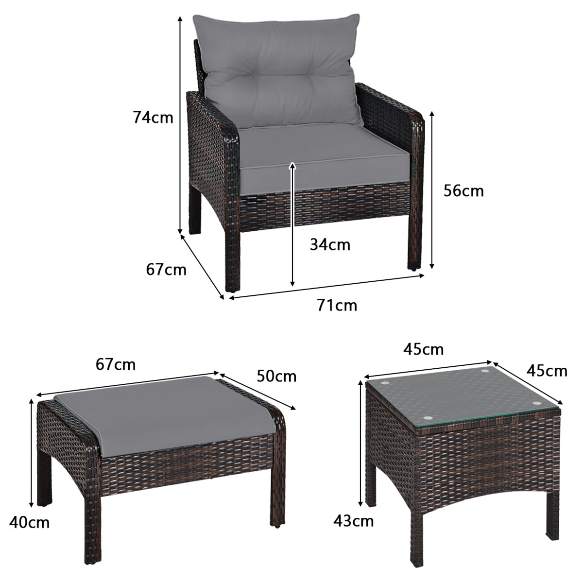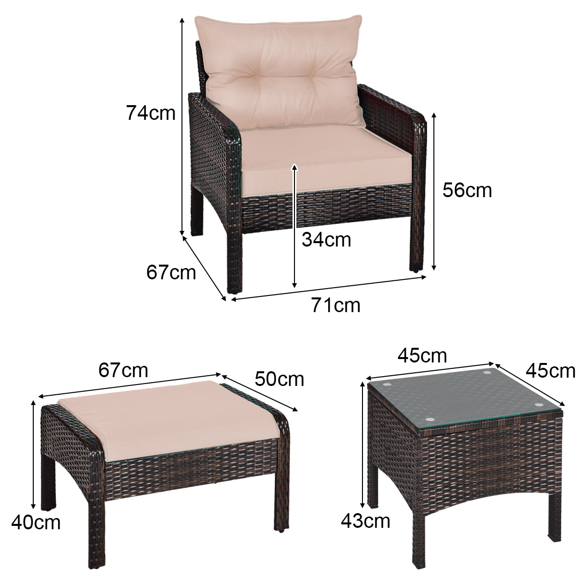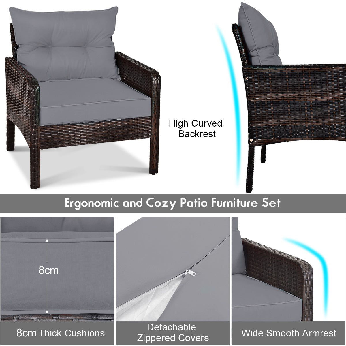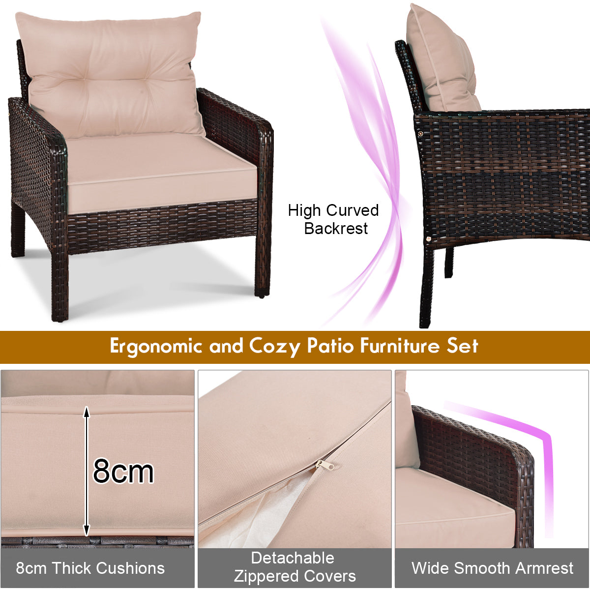 The rattan chair set adds more natural color to your yard with bright cushion and espresso brown rattan. This outdoor furniture set is crafted of weather-resistant hand-woven rattan and sturdy steel frame with powder-coated finish, which is durable enough to withstand rain and wind for long time use. Its thick sponge padded cushions and ergonomic back double the comfort for you to totally relax yourself. Cushion covers with quick zipper are removable for cleaning. This patio sofa set will let you enjoy fun with family and friends while also taking in the view and fresh air. Good choice for patio, porch, backyard, balcony, poolside, garden and other suitable space in your home.