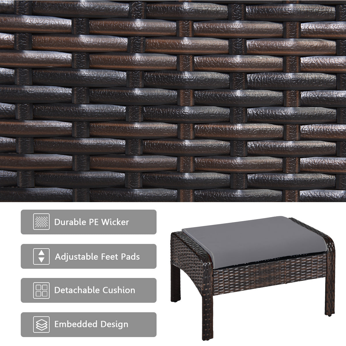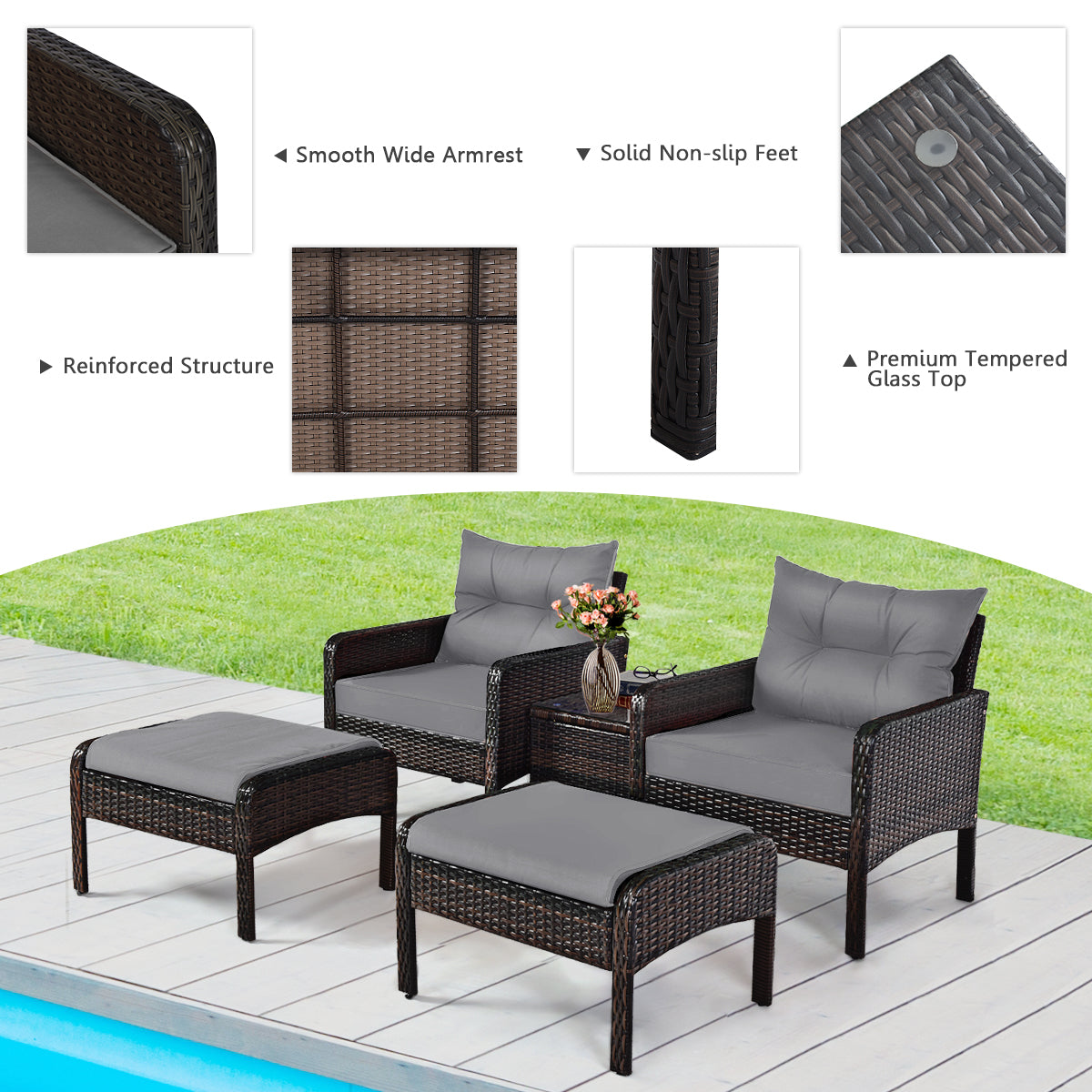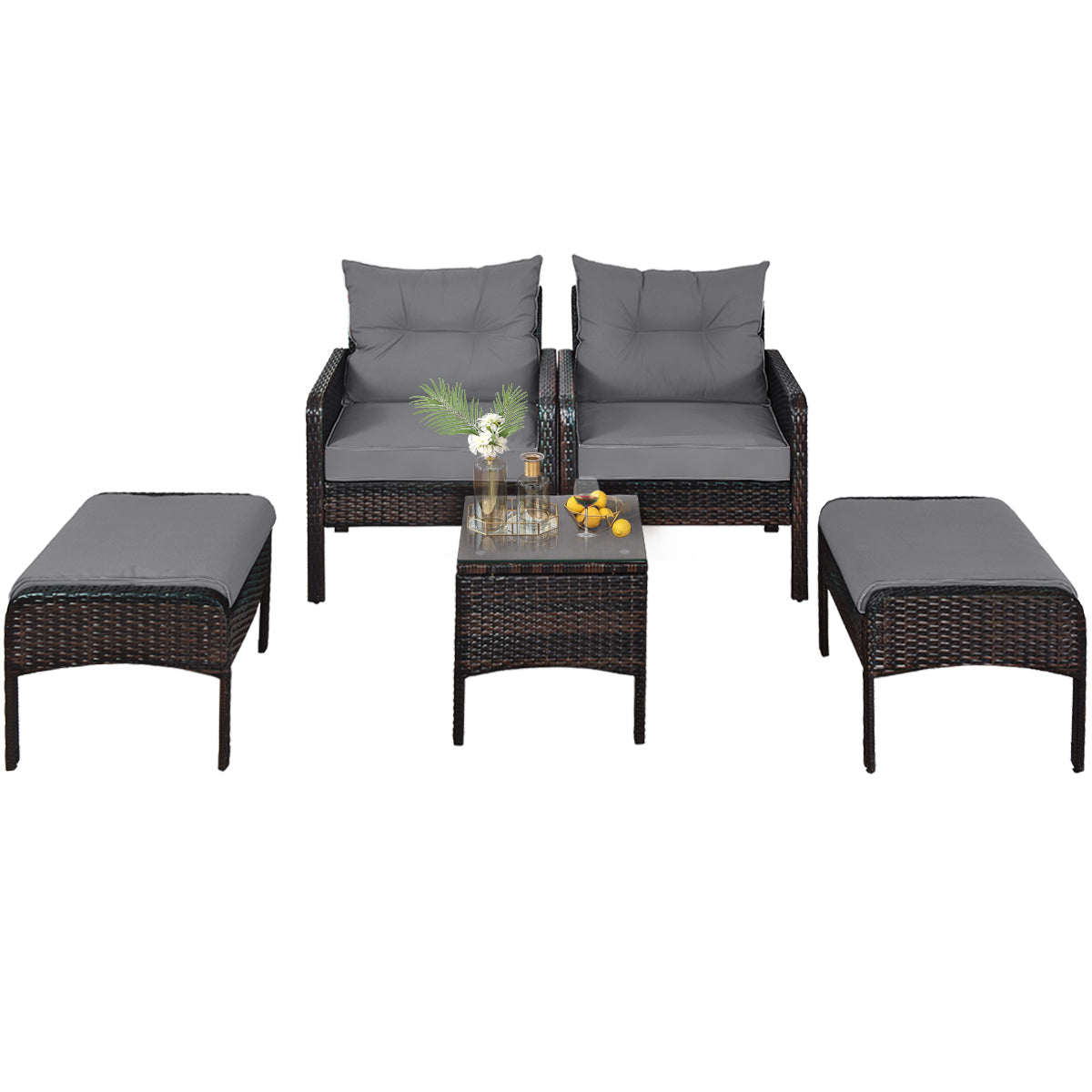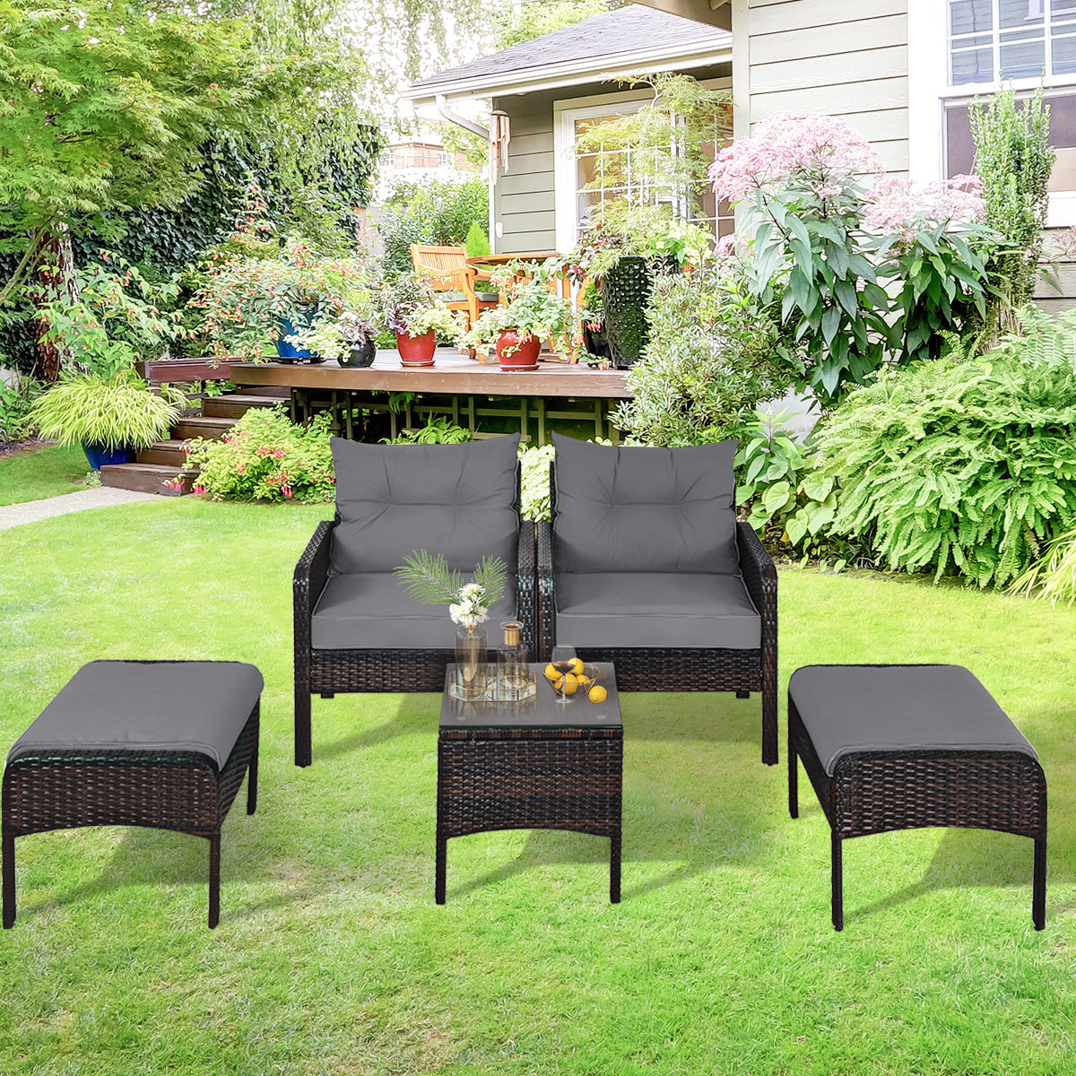 The rattan chair set adds more natural color to your yard with bright cushion and espresso brown rattan. This outdoor furniture set is crafted of weather-resistant hand-woven rattan and sturdy steel frame with powder-coated finish, which is durable enough to withstand rain and wind for long time use. Its thick sponge padded cushions and ergonomic back double the comfort for you to totally relax yourself. Cushion covers with quick zipper are removable for cleaning. This patio sofa set will let you enjoy fun with family and friends while also taking in the view and fresh air. Good choice for patio, porch, backyard, balcony, poolside, garden and other suitable space in your home.