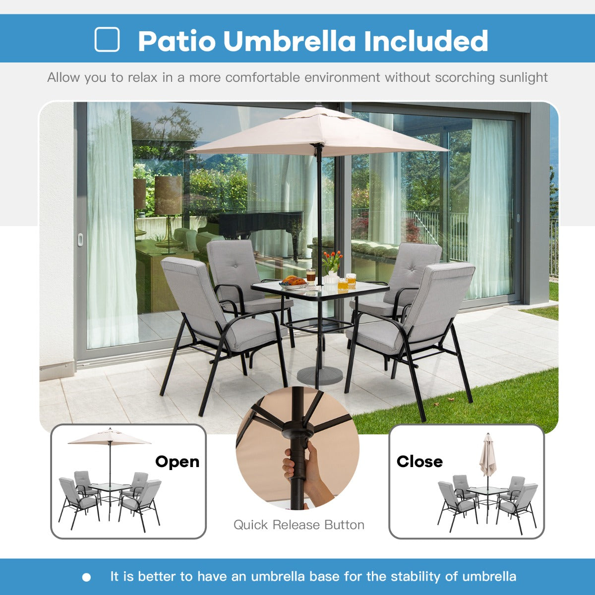 Create a comfortable space in outdoor space with our 6-piece patio dining set! Soft padded cushions, curved backrests and ergonomic armrests will keep you stay comfortable. The sun-protective umbrella with wide coverage allows you and your family to enjoy a cool and cozy outdoor meal or tea time. To ensure stability, non-slip foot pads are fitted under the table's and chairs' legs. Moreover, this outdoor furniture set features a rustproof steel frame, tempered glass tabletop and waterproof polyester fabric for the umbrella, which supports long service life for outdoor use.