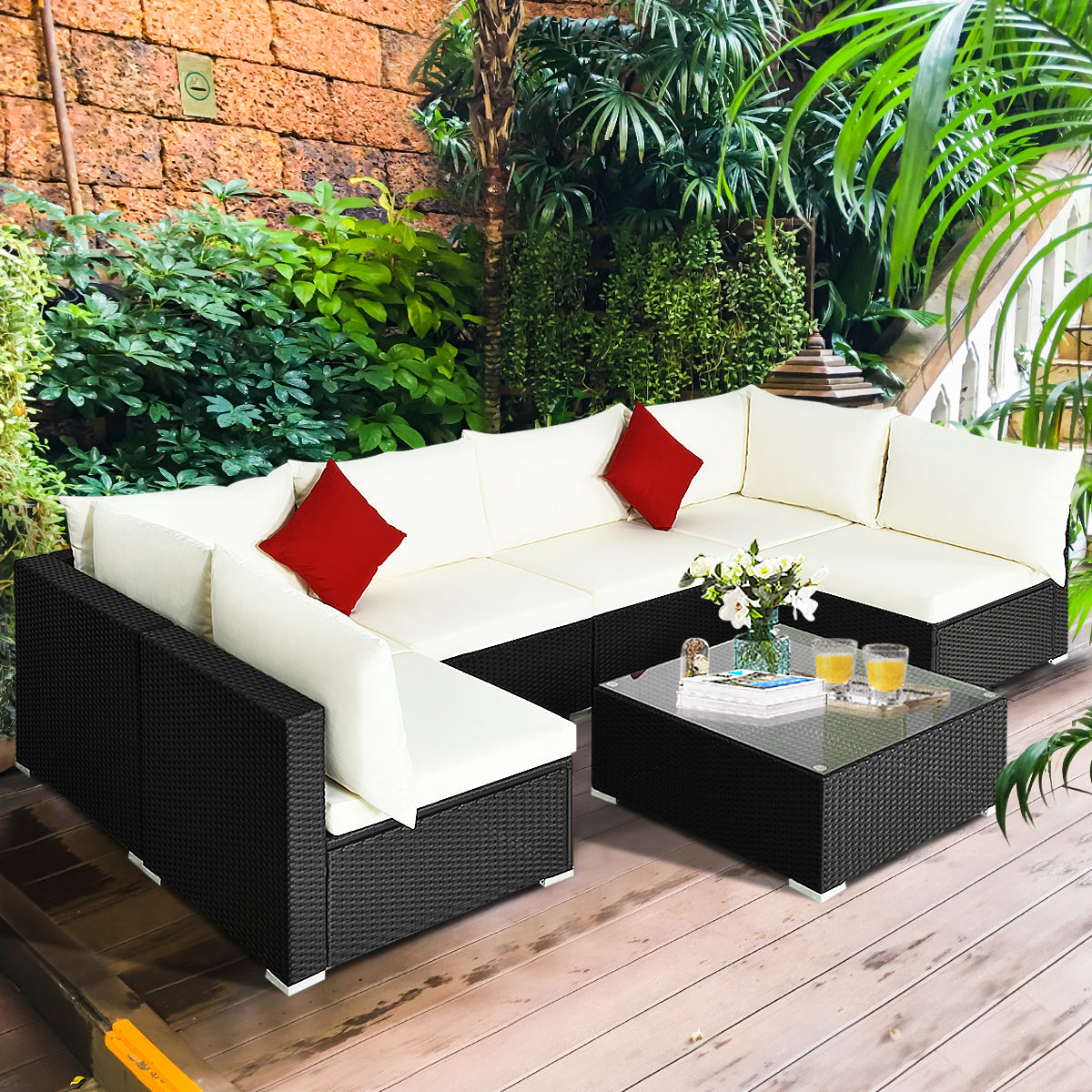 Aussies Market 7 Pieces Outdoor Wicker Sofa Set with Tempered Glass Top Coffee Table