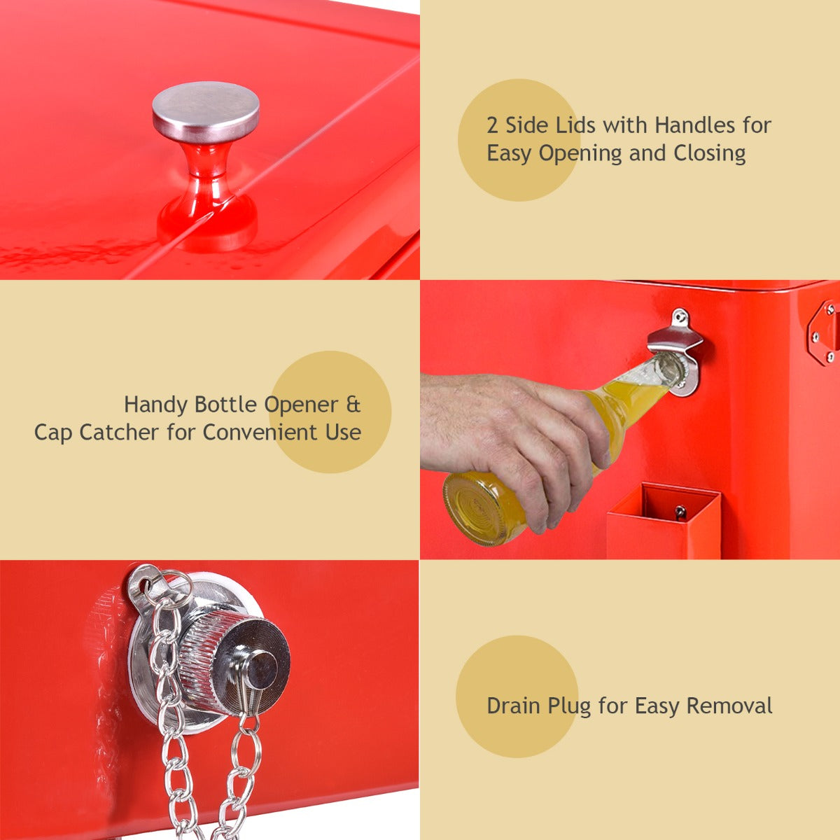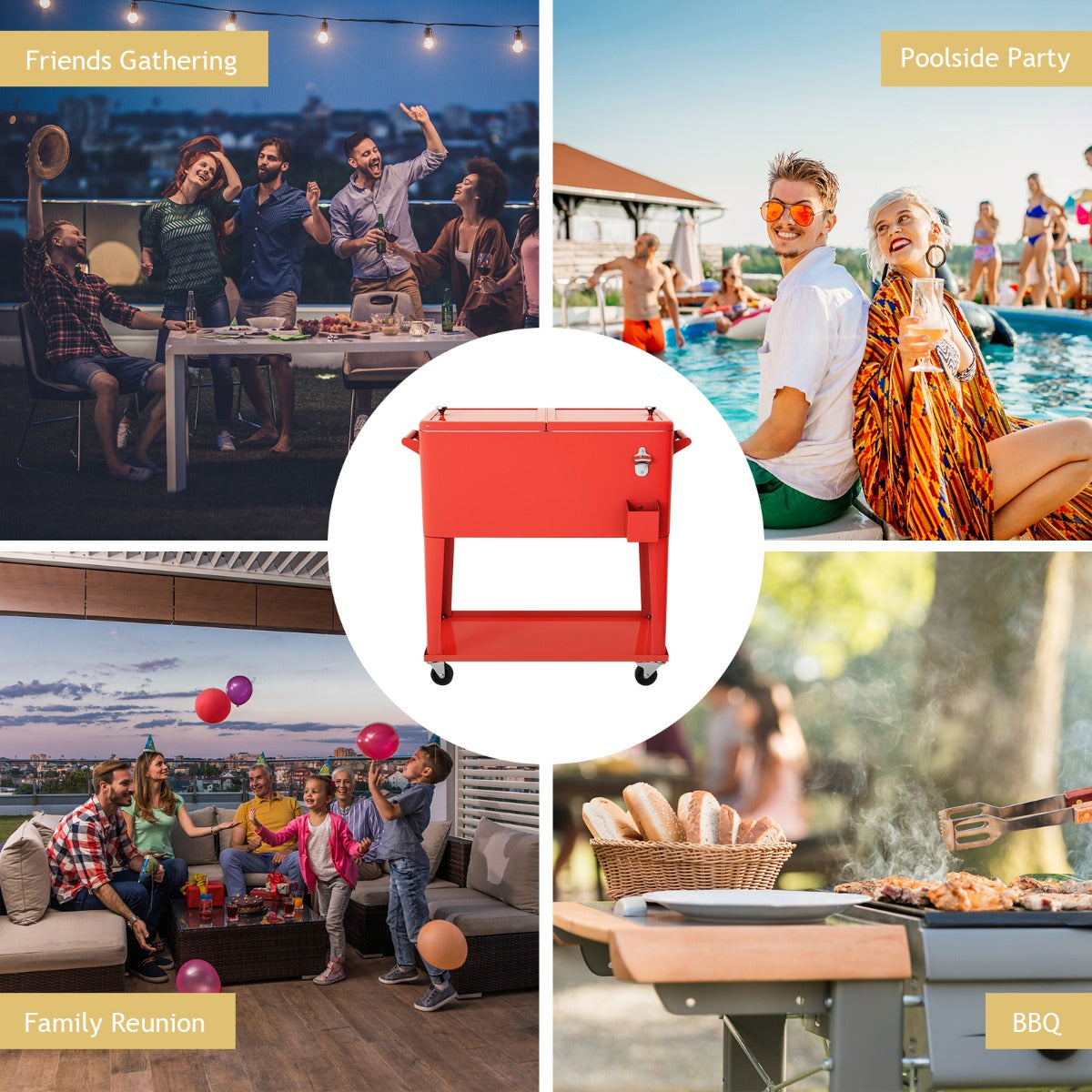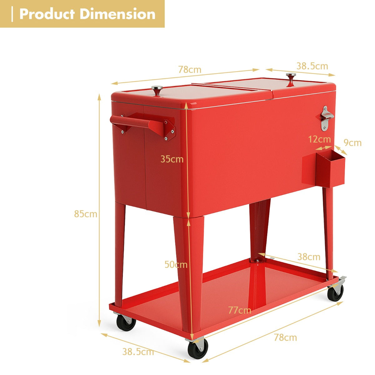 Our portable rolling cooler cart can bring a lot more drinks fun to the party where ever you going. Made of durable steel with red color finish, it's the perfect companion to any outdoor activity. This 76L cooler has two openings so you can easily access both sides and features convenient handles on each side as well. A drainage hole located on the back lets you quickly remove excess water while a convenient bottle opener with cap catcher is attached to the front. It features four wheels which allow you to bring this cooler with you anywhere you go and then keep it in place with two locking wheels. The attached bottom shelf can be used to hold additional accessories such as mixers or cups. Get your hot outdoor activity started right with this versatile rolling cooler and add more drinks fun.
