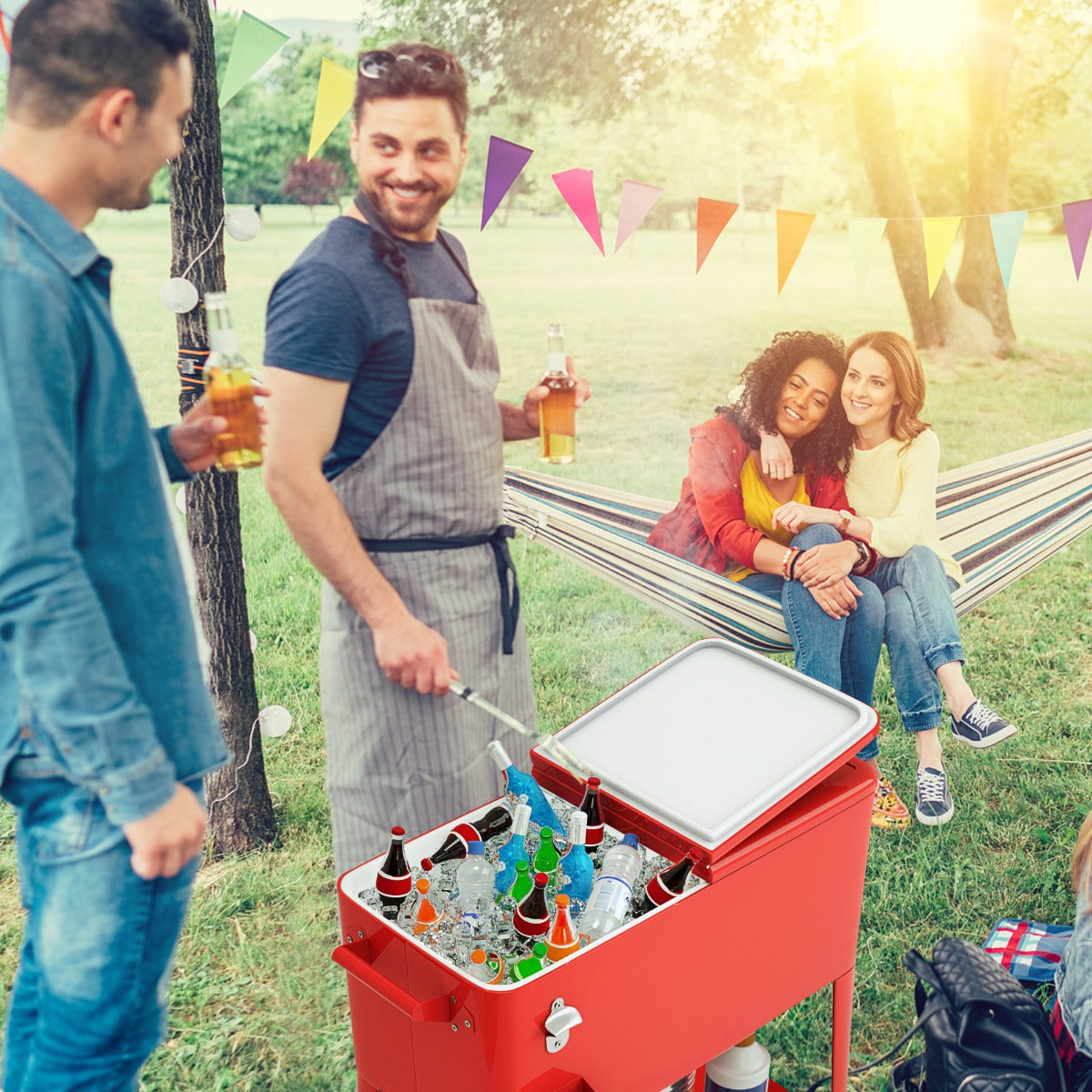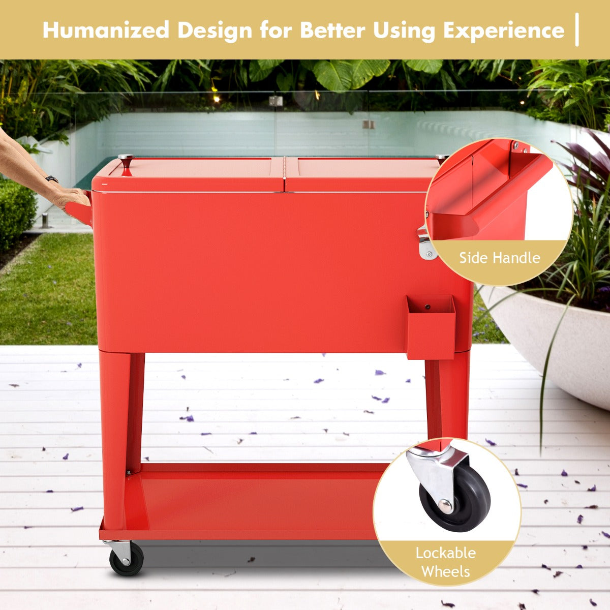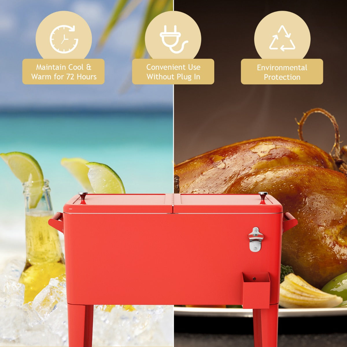 Our portable rolling cooler cart can bring a lot more drinks fun to the party where ever you going. Made of durable steel with red color finish, it's the perfect companion to any outdoor activity. This 76L cooler has two openings so you can easily access both sides and features convenient handles on each side as well. A drainage hole located on the back lets you quickly remove excess water while a convenient bottle opener with cap catcher is attached to the front. It features four wheels which allow you to bring this cooler with you anywhere you go and then keep it in place with two locking wheels. The attached bottom shelf can be used to hold additional accessories such as mixers or cups. Get your hot outdoor activity started right with this versatile rolling cooler and add more drinks fun.