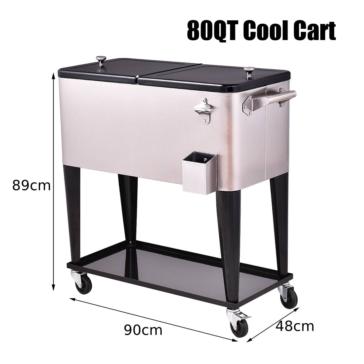 Convenient Design: Dual top with two lid handles is made for easy opening and closing. Attached bottle opener and cap catch bin for more convenience. And drain plug on back helps make draining and cleaning easily. These useful details can help you apply the cooler cart without worry and effort.