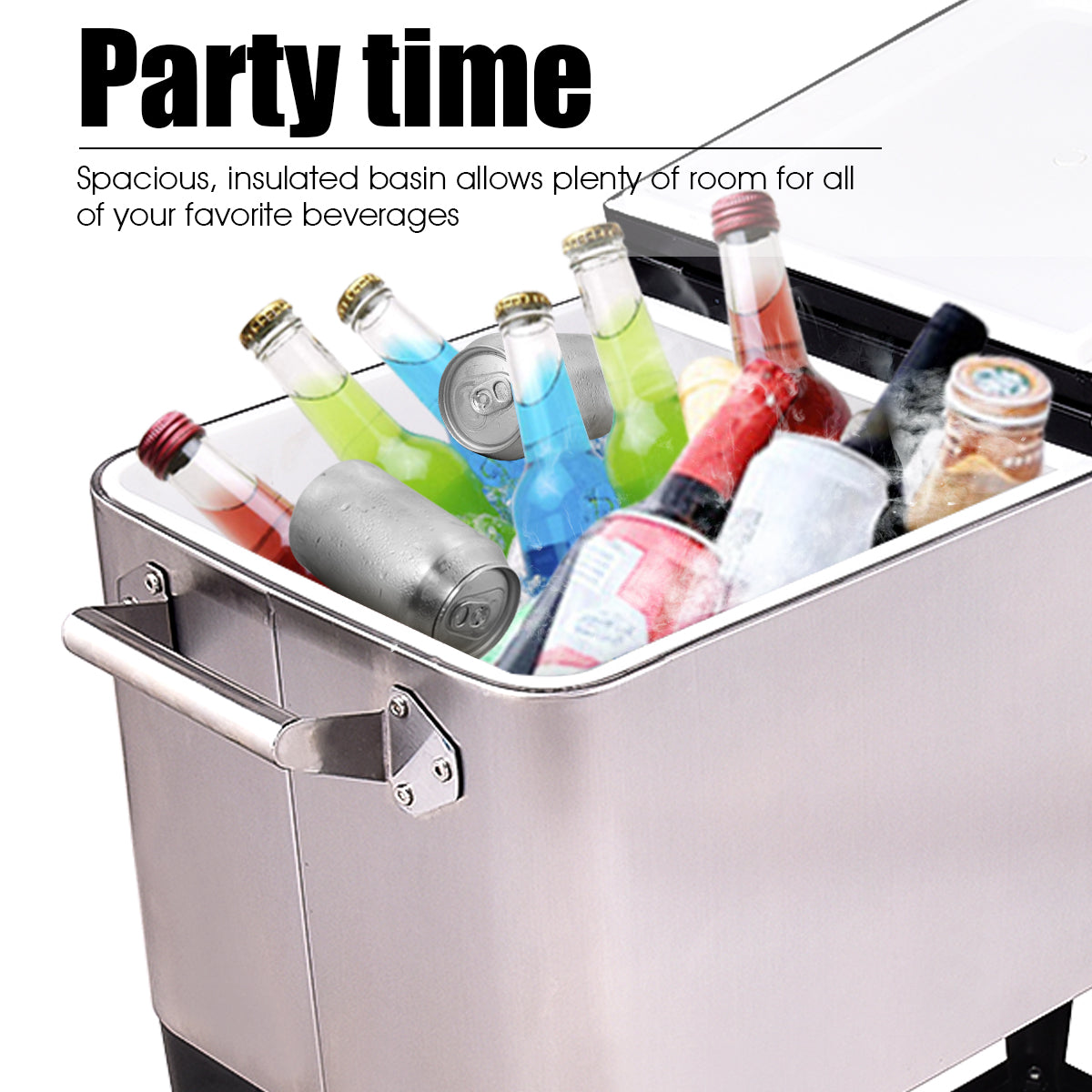 Enjoy the coolness all summer! No worry of rotting, rusting or denting, our new rolling cooler cart adopts high quality stainless steel, which is durable to be exposed to the sun and rain. The cooler box features imported foam layer and high-pressure foaming technology filled with polyurethane, guaranteeing excellent insulation performance of 72 hours long. Other details that cannot be ignored, such as bottle opener, bottle cap box, handles on both sides and universal wheels, provide convenient service experience. Whether you go camping, barbecue, party or other outdoor activities, our rolling cooler can be your good helper and let you enjoy your leisure time.