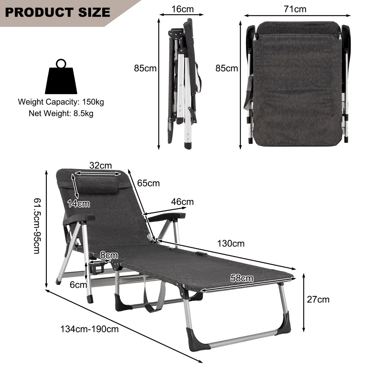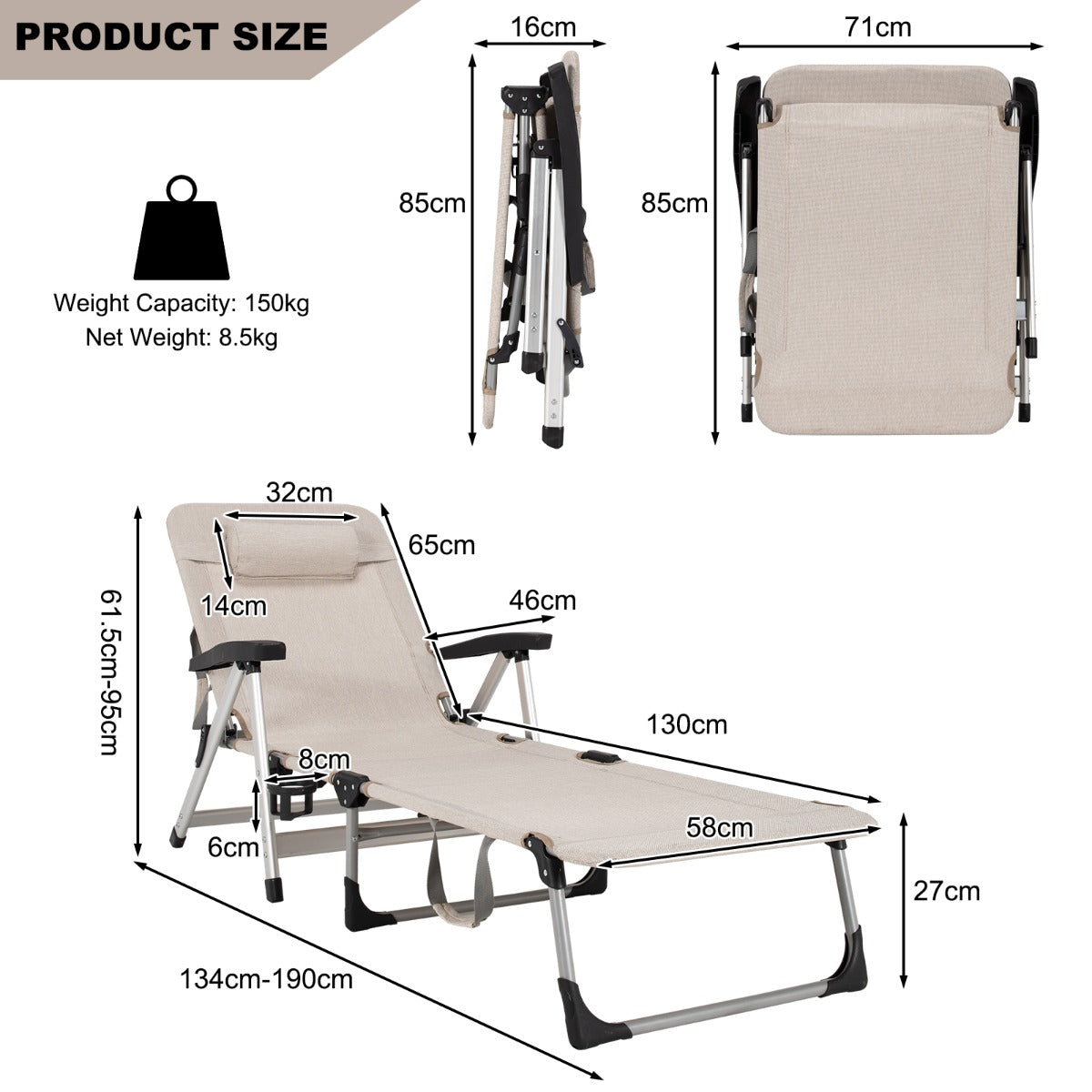 This is the portable folding camping cot designed for both indoor and outdoor use. With its convenient foldable design, you can carry it with side straps for easy transportation and stored it in narrow spaces. Just enjoy comfortable leisure time on this lounge chair! You can adjust the backrest into 7 positions by simply moving the armrests back and forth, thus finding the most comfortable angle of backrest. Moreover, you can relax your head and neck on the thick padded sponge headrest. Putting your water bottle in the rotatable cup holder for easy access. The surface of the sleeping recliner is made of high density fabric, which is featured by its excellent waterproof and breathable ability. Our lounger with flat aluminum frame has stronger loading capacity up to 150 kg.