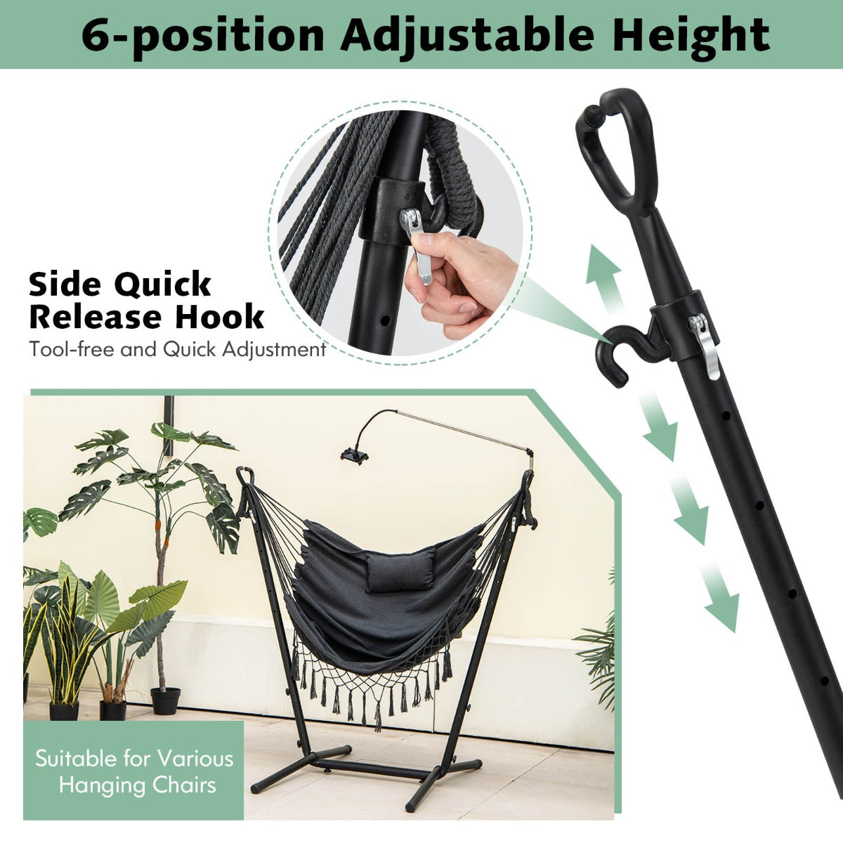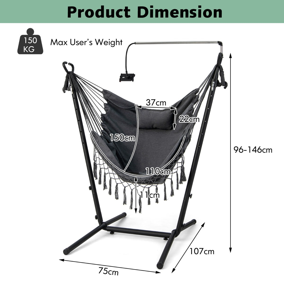 Relax yourself totally with this hammock chair with stand! The U-shaped stand is more steady and comfortable than those A-shaped or C-shaped ones. Thus, you can sit and swing on the hanging chair freely. The high quality material with a...View More