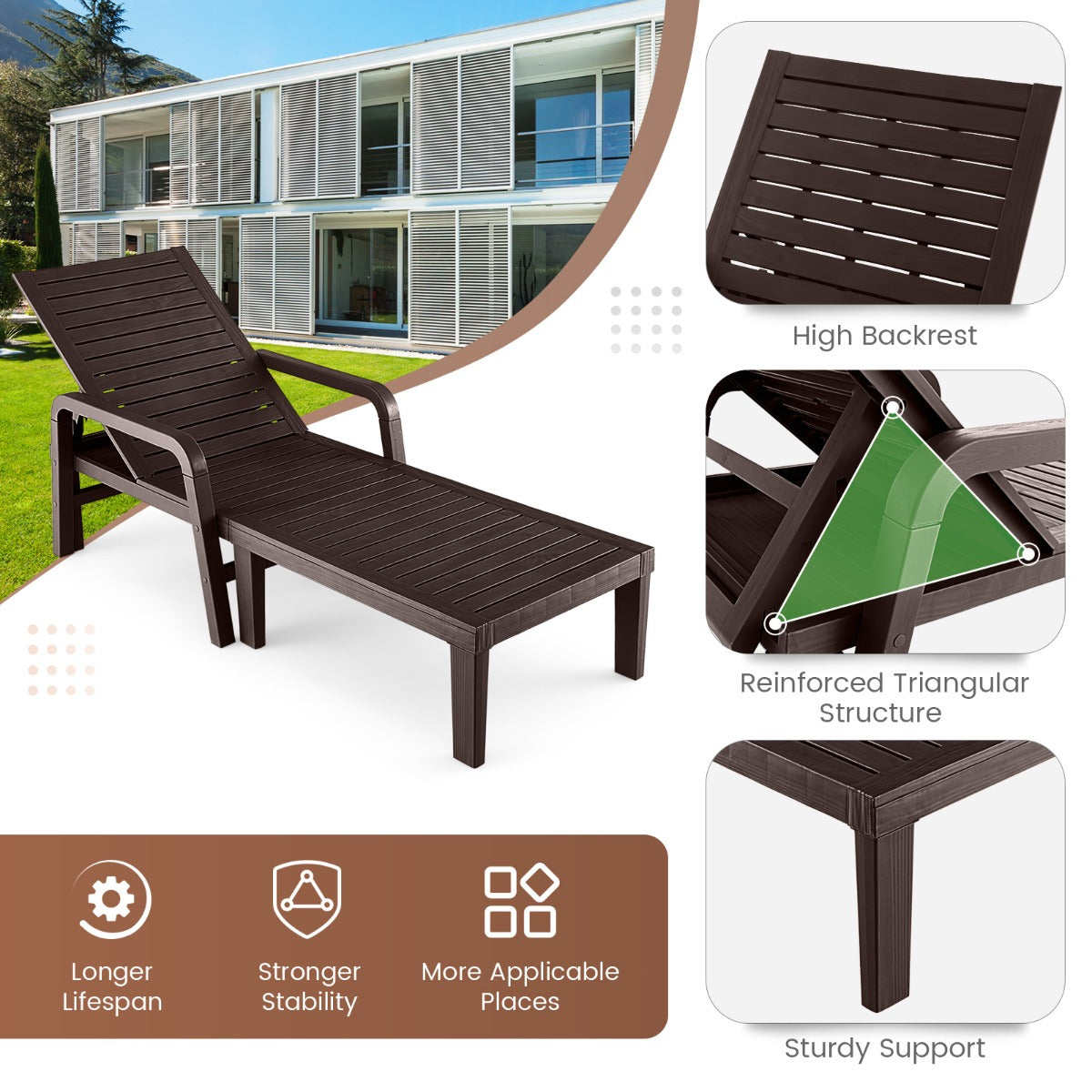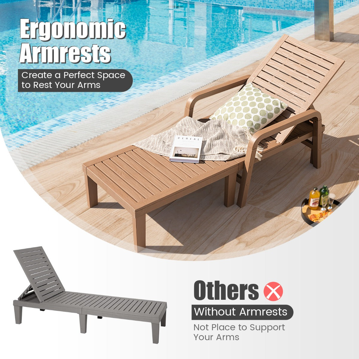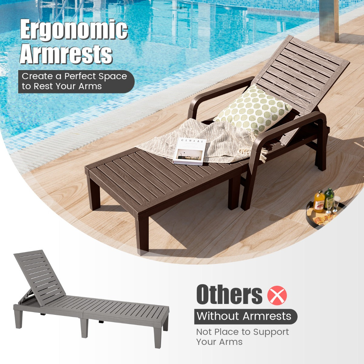 Wide Range of Applications: The simple but elegant appearance makes the chaise lounge fit varied places well. It's suitable for different outdoor occasions, such as poolside, backyard, deck and garden.