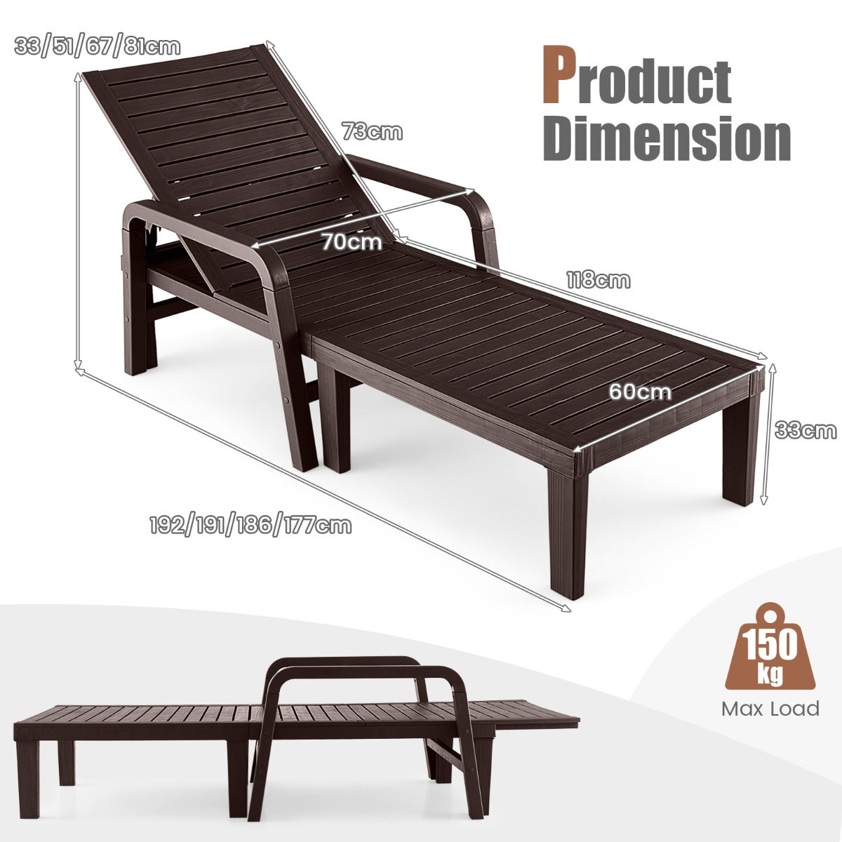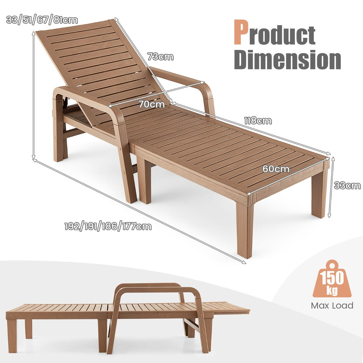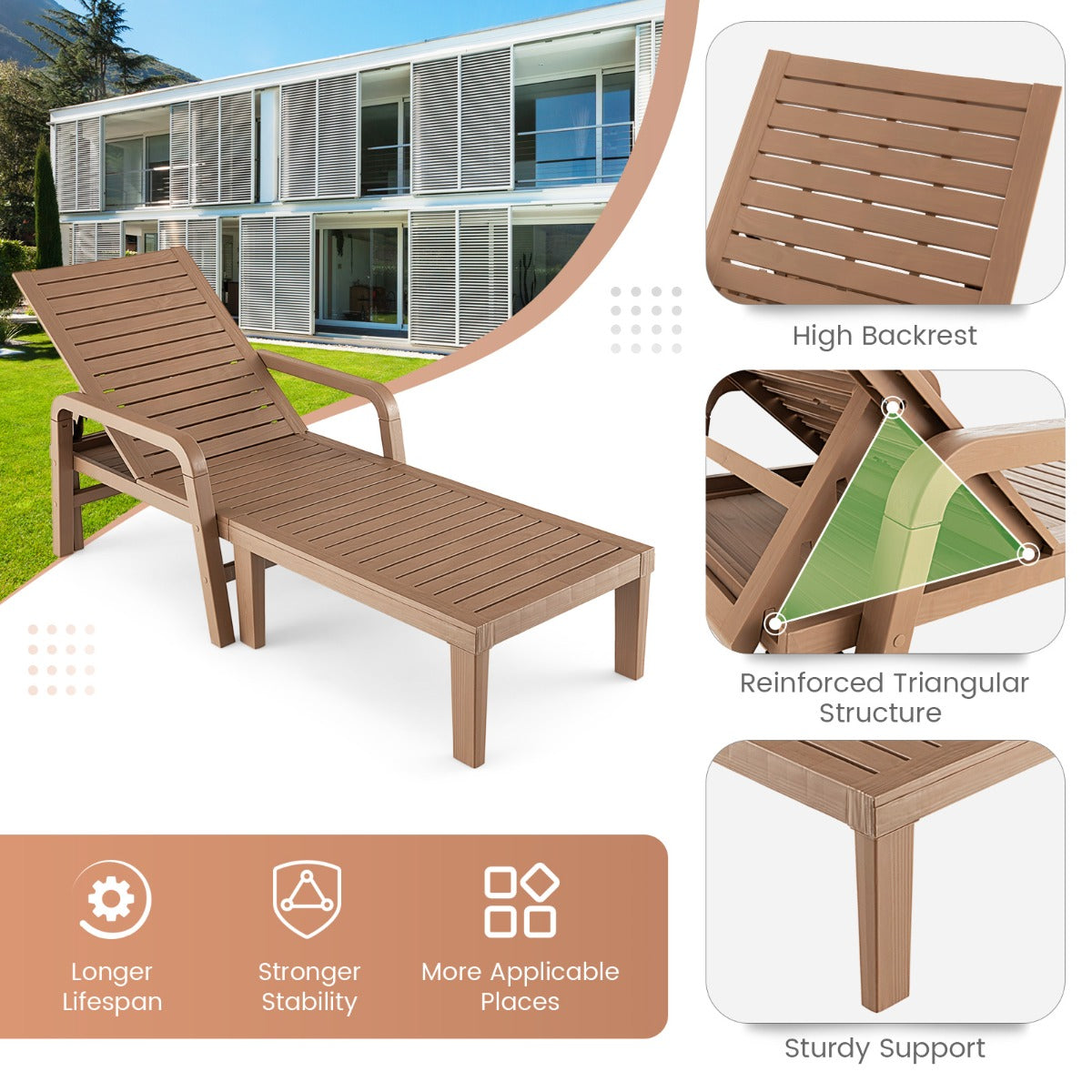 Top-Grade PP Material: Made of premium PP material, the lounge chair can withstand long-time outdoor use. This PP patio chaise lounge chair is not only super sturdy, but also waterproof, sunproof, anti-fading and easy to maintain. Plus, the 6 supporting feet are easy to install and enhance overall stability.
