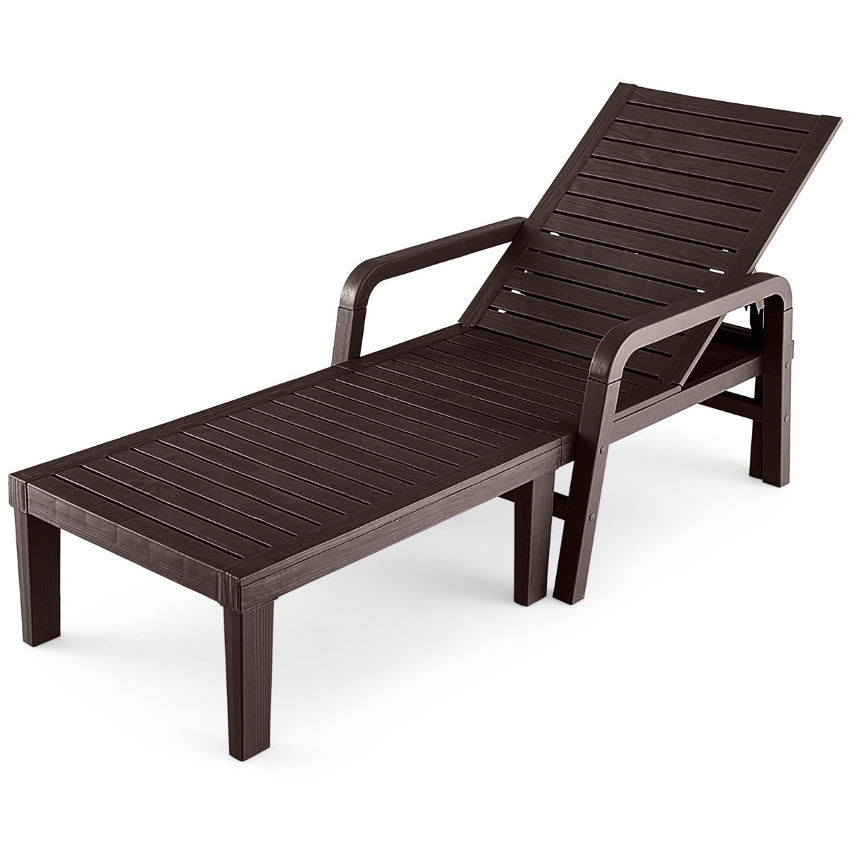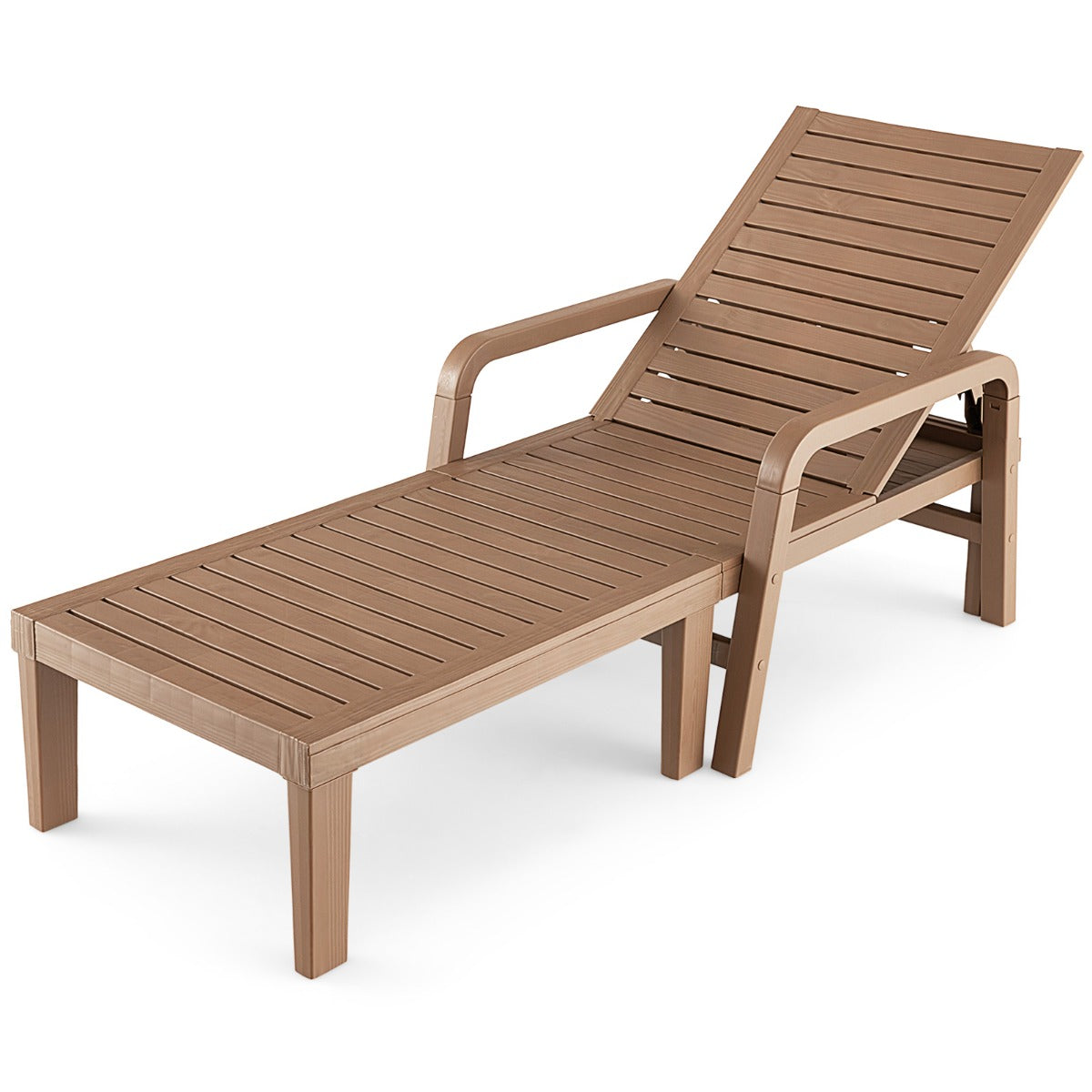 This outdoor PP chaise lounge chair allows you to enjoy comfort in outdoor occasions. Made of high-grade PP, the chaise lounge is of high stability and features smooth and waterproof surface. It will also offer you endless coziness with curved armrests and high backrest. Moreover, the backrest can be adjusted into 4 positions, meeting your different relaxing demands. And you can even lie flat to have a good sleep. Whether in the backyard, poolside, garden or deck, this patio chaise lounge chair will always be an awesome addition.