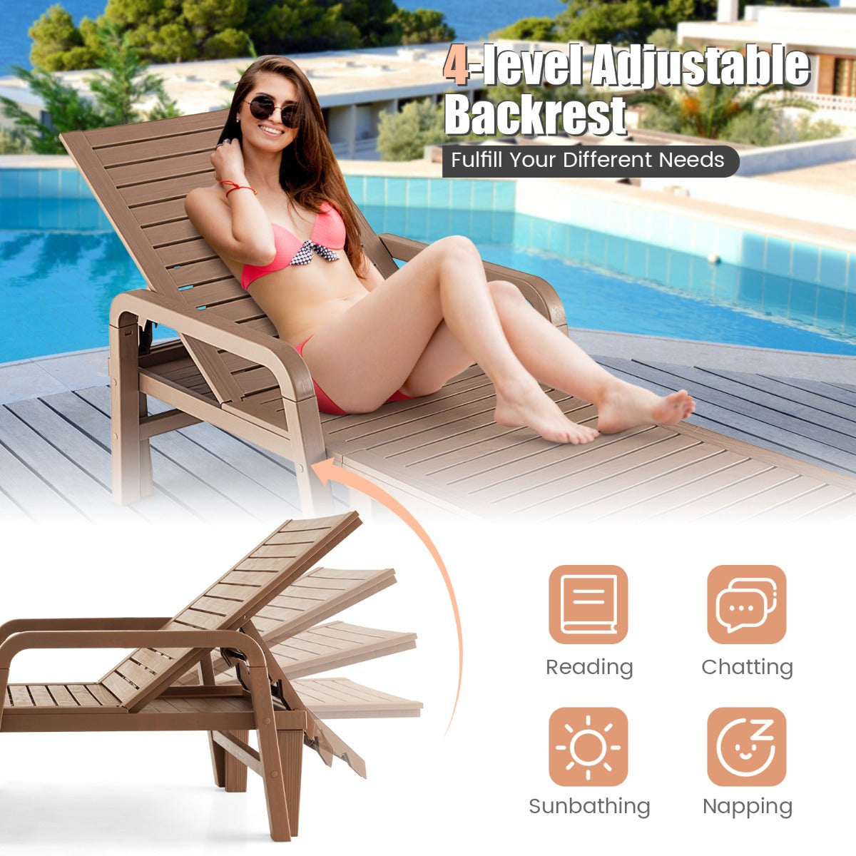 4-Level Adjustable Backrest: This chaise lounge chair features 4-position backrest including flat position, satisfying your multiple demands for outdoor relaxing. Therefore, you can sit to read, recline to take a sunbath and lie down to sleep.