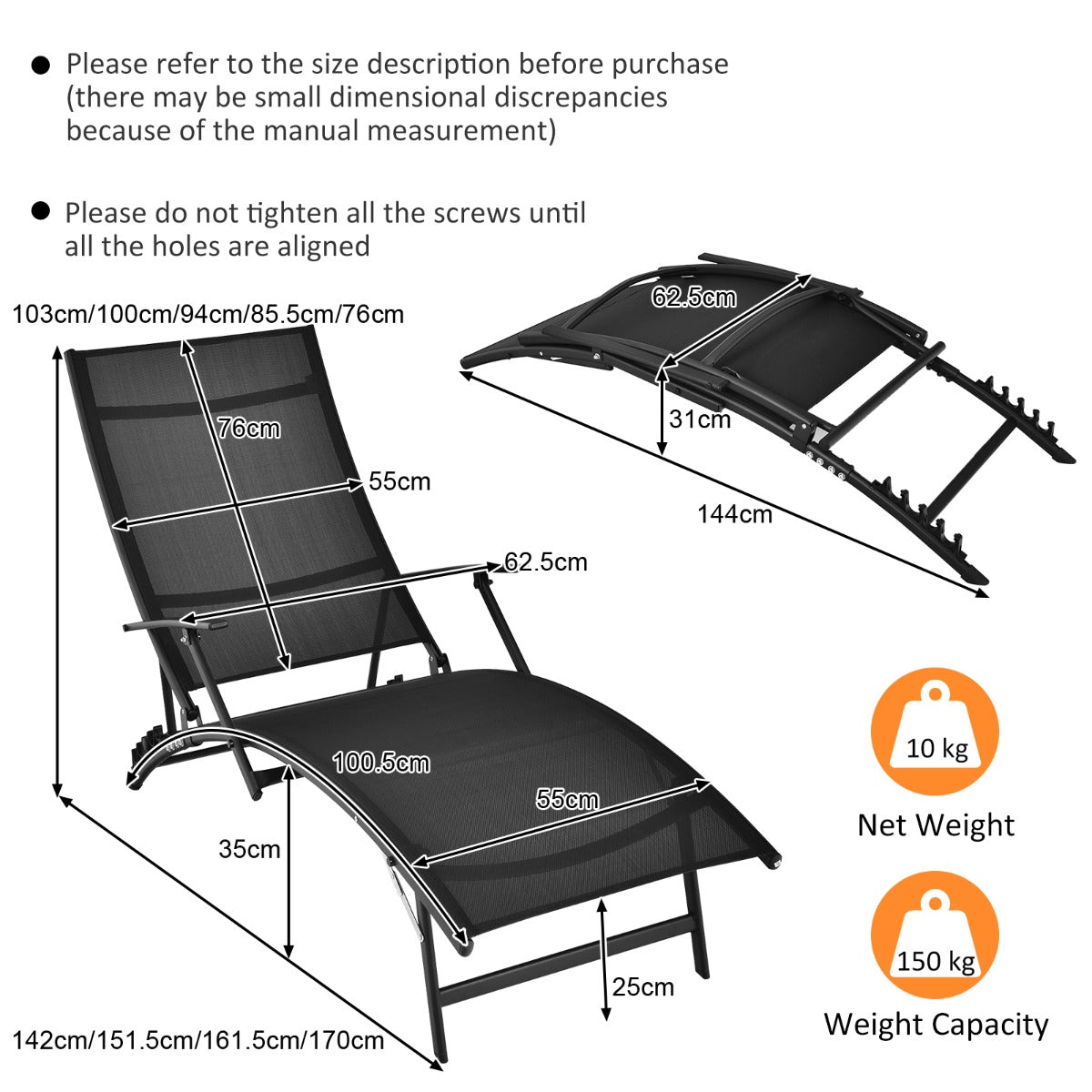 Simple to Set up: Please don't worry about the installation because of most parts are pre-assembled to save your precious time. Please do not tighten all the screws until all the holes are aligned. Unfolding dimension of each lounge chair: 142/151.5/161.5/170cm x 62.5cm x 103/100/94/85.5/76 cm (L x W x H), folding dimension of each lounge chair: 144 x 62.5 x 31 cm (L x W x H). Please refer to the size description before purchase (there may be small dimensional discrepancies because of the manual measurement).