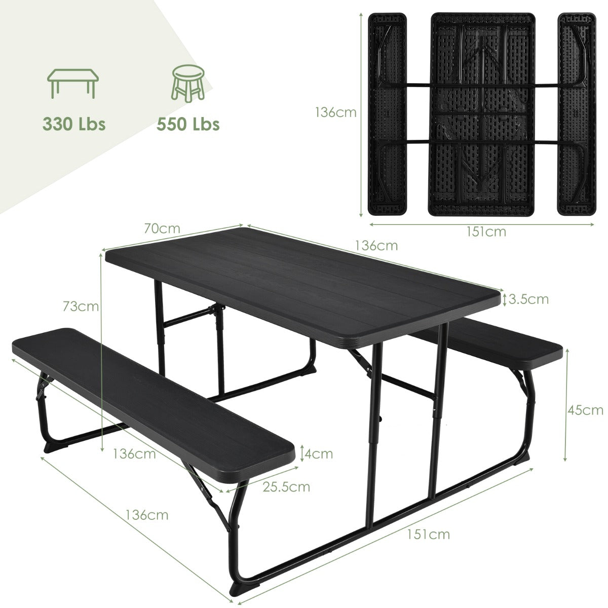 Large Picnic Table Set for Whole Family: Measuring 136.5cm x 70cm x 72cm(L x W x H), the spacious table has provided large room to support all kinds of snacks, fruits and dishes needed for picnic. And there are 2 long benches measuring 136.5cm x 25.5cm x 44cm(L x W x H) which can comfortably seat up to 4 people, making it an ideal choice for family camping.