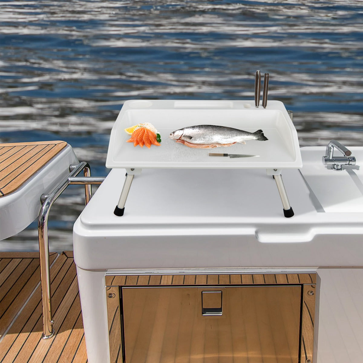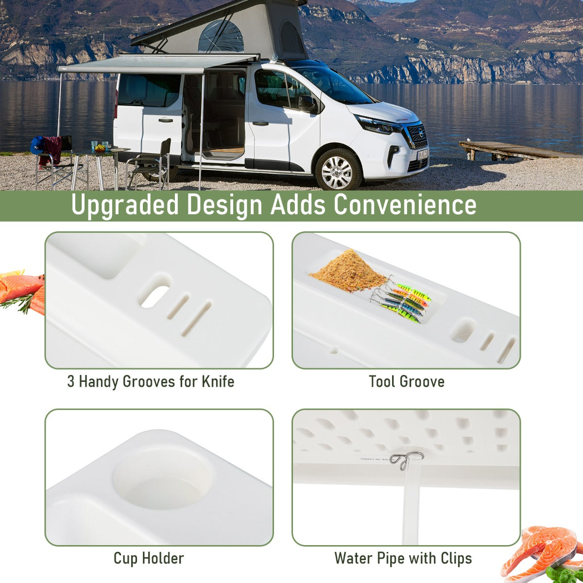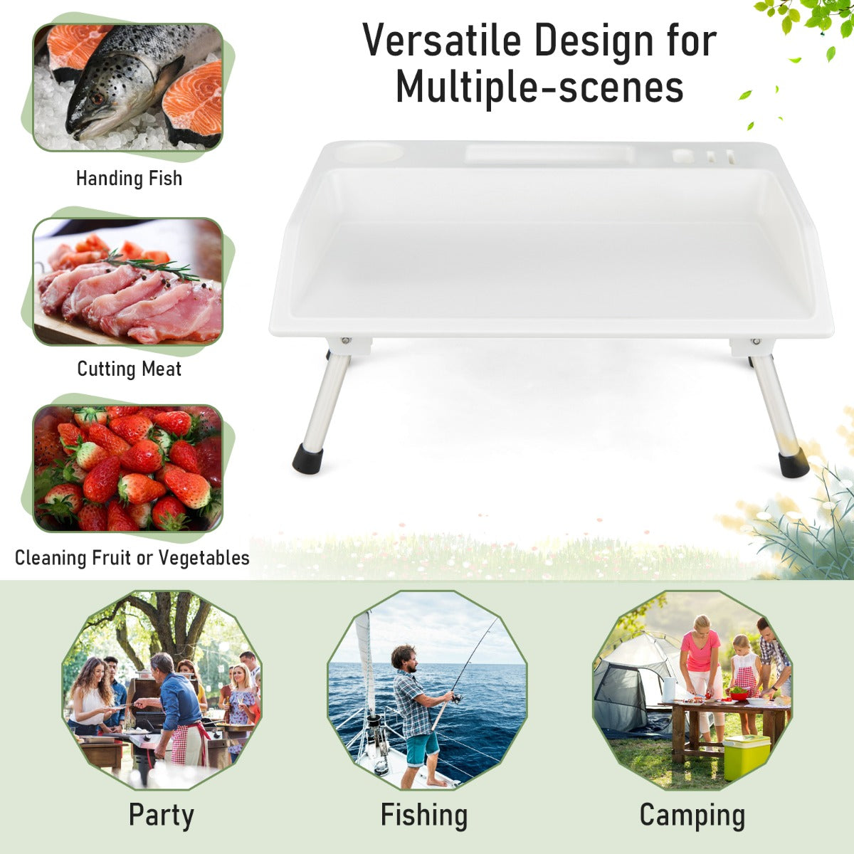 Versatile Use for Multiple Occasions: The multi-purpose design of our 55 cm x 45 cm x 24 cm fish cleaning table will meet your different needs for handling fish, cutting meat and cleaning fruit. Whether you're fishing from your boat, grilling on your lawn, camping in your van, or having a party in your backyard, our folding fish cleaning station is an ideal choice.
