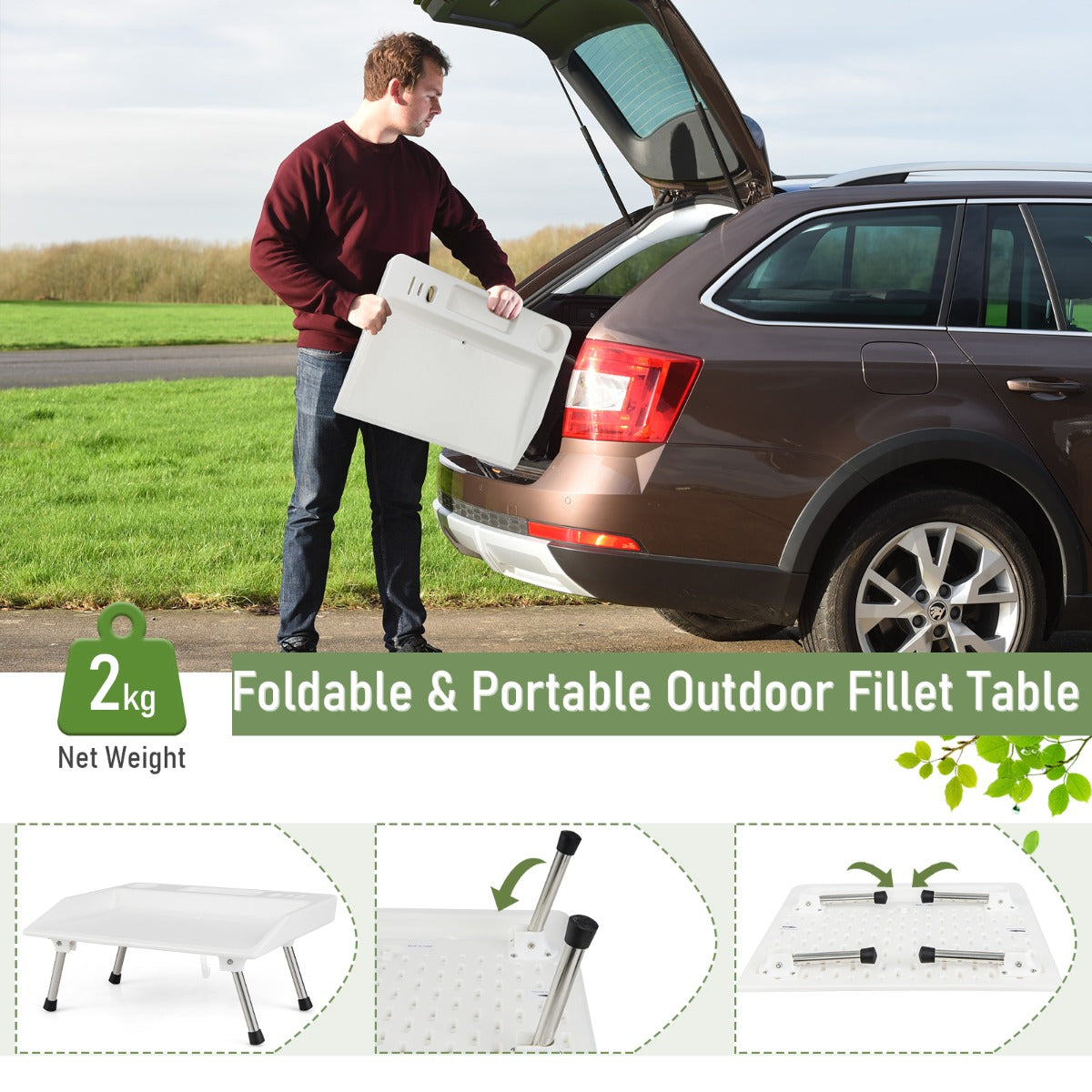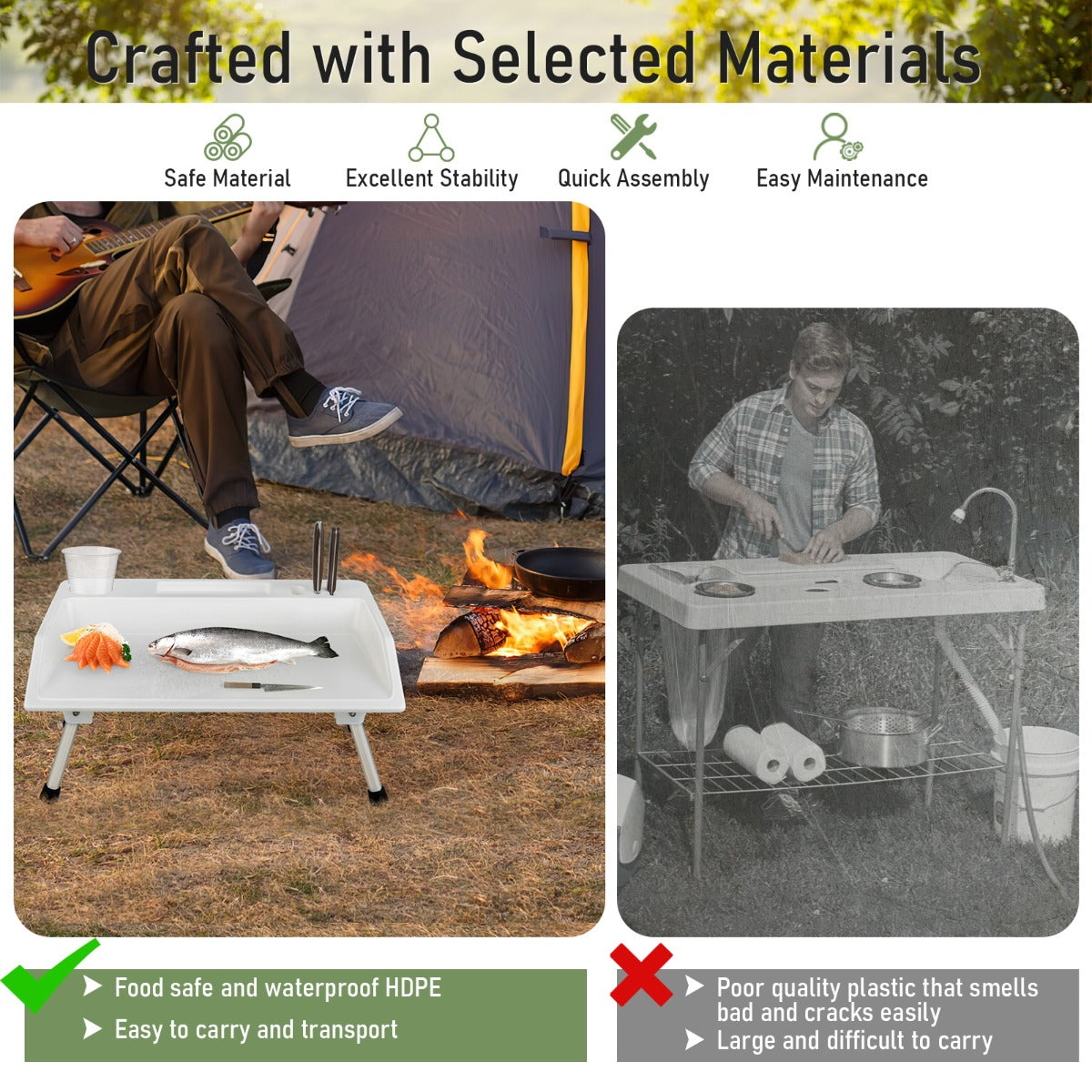 Durable Material & Safe Details: Crafted with food-grade HDPE material, the tabletop is no-odour and crack-resistant to ensure longer service life. Besides, the protective round corner will effectively avoid accidental bumping or scratching. And our portable fish fillet table is approved by FDA for safe use.