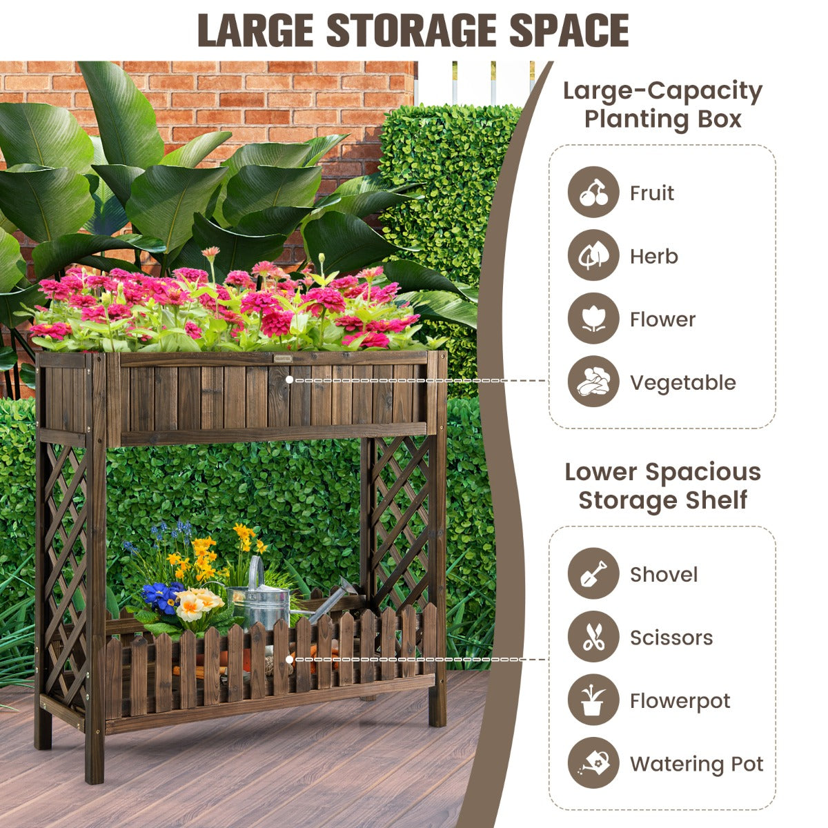 Our wooden raised garden bed comes with a deep planting box and a bottom storage shelf, which not only provides large space for cultivating different plants but also allows you to store gardening tools within reach, bringing convenience to your gardening work. More than that, the planter box stand is made of 100% natural fir wood with high-temperature carbonized treatment, increasing its resistance to fire, moisture, and insects. And there exist 4 drainage holes for keeping the soil fresh and letting plants grow healthily. Besides, thanks to the 90cm ergonomic height design, you would not feel tired or have back pains after long-time gardening. Combing with the retro color and clear lines, the elevated garden bed can be a perfect addition to your garden, balcony, backyard, or greenhouse.