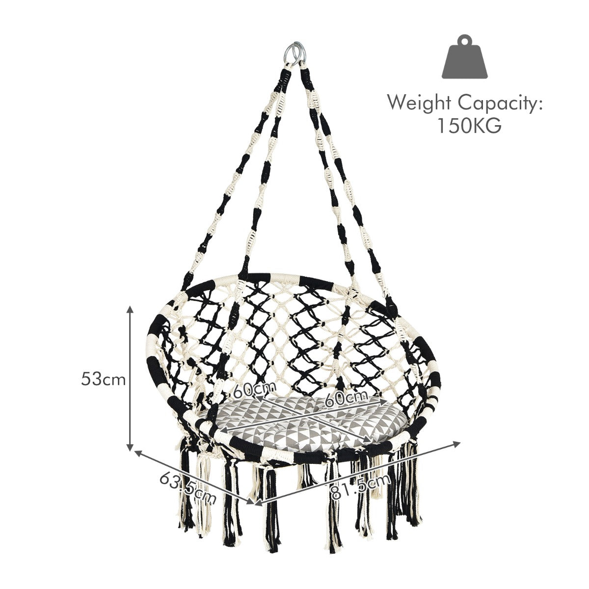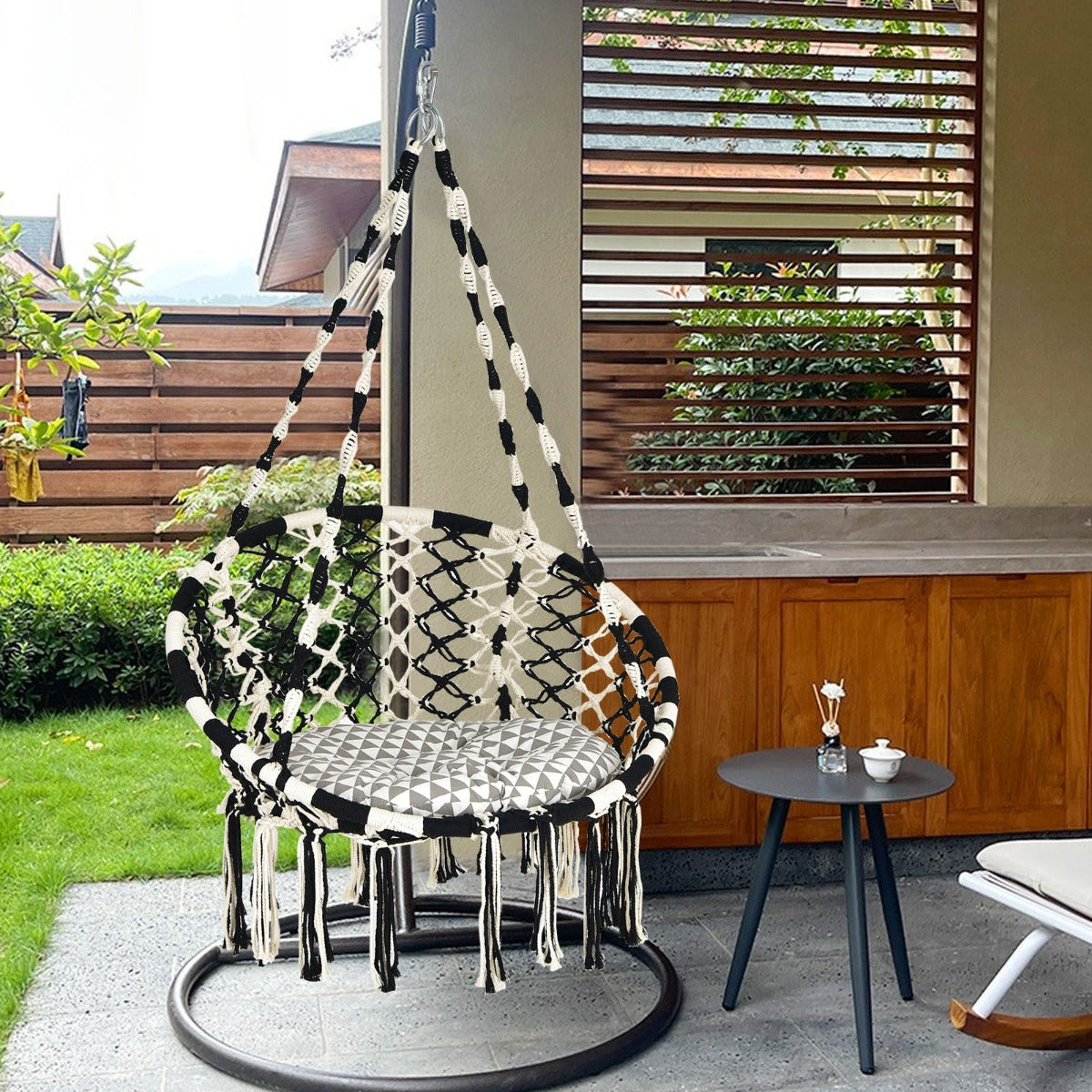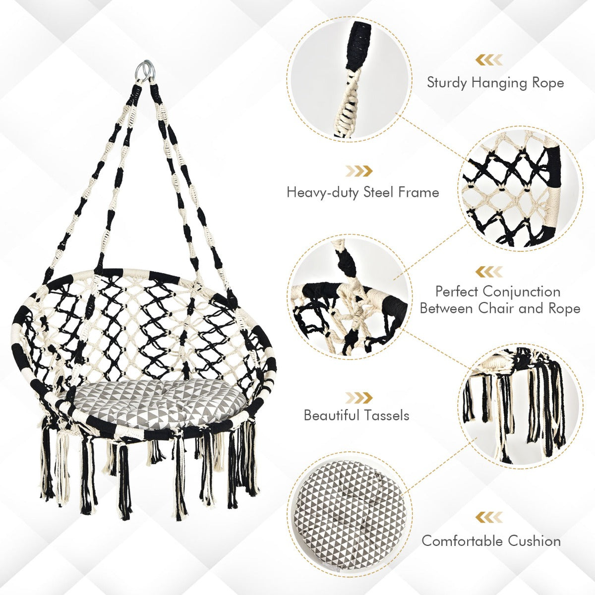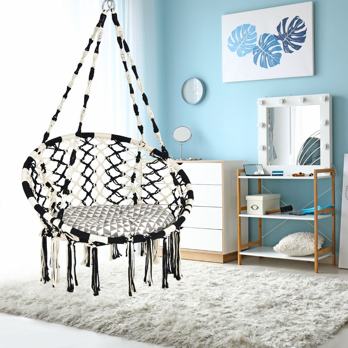 Bohemia Style for Wide Application: This hammock chair combines bohemian style with macrame net chair pattern, surely will bring your home a unique flavour. Besides, the black and white colour combination makes stylish sense much richer. It's an appealing decoration for the living room, kid's room, backyard, balcony, patio, etc.