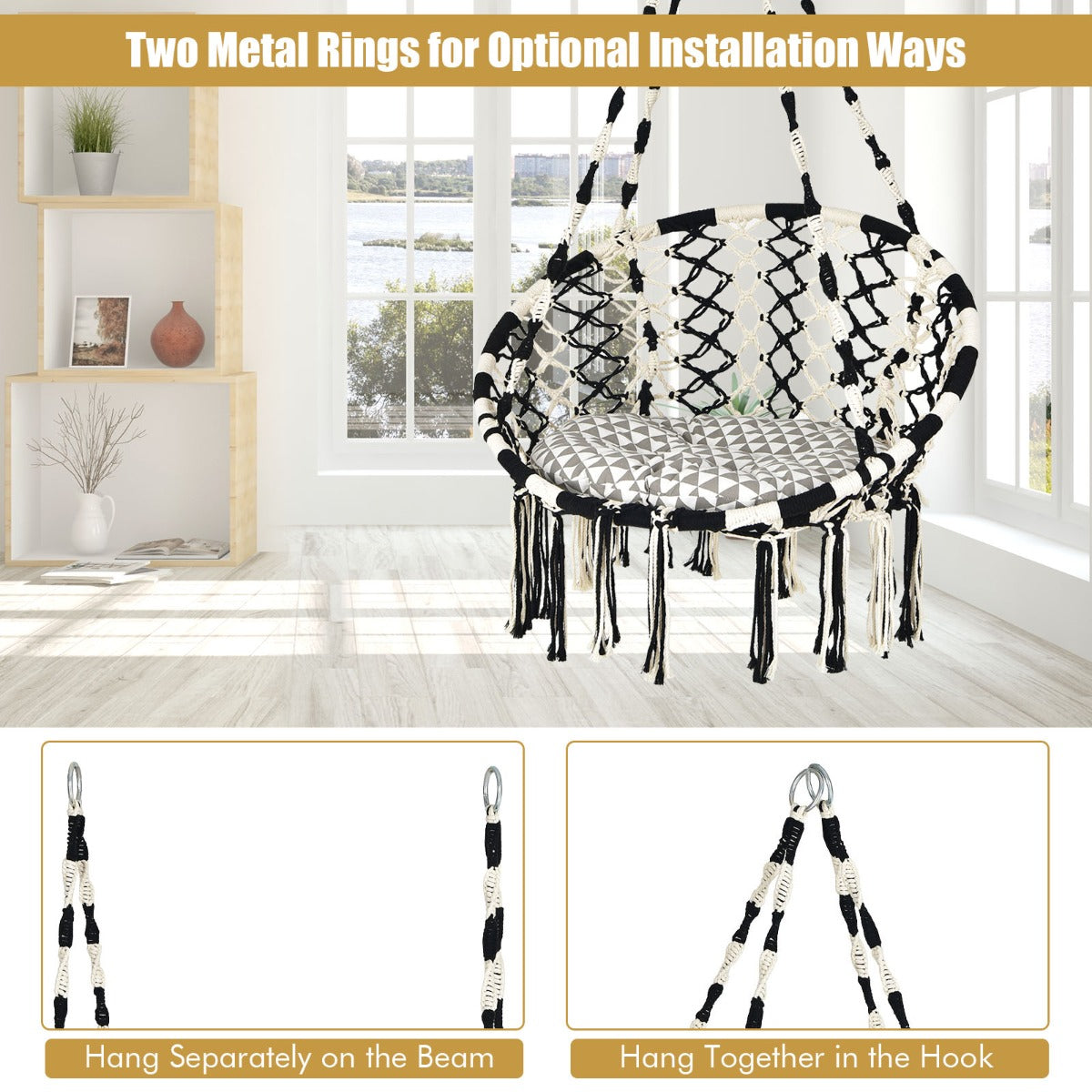 Multiple Hanging Options: This swing chair is designed with two anti-rust metal rings that can be hung separately on the beam or together in the hammock stand. Besides, you can also hang it from ceiling and tree branches with the help of professional hanging kits.