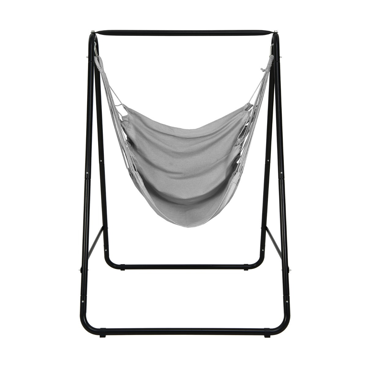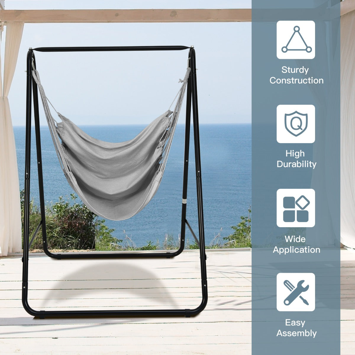 Our hammock chair swing with a stable A-shaped stand and U-shaped base ensures greater stability and higher weight capacity. Plus, the reinforced carabiners and non-slip foot pads for added safety. This swing chair with a stand fits almost anywhere, like a patio, garden, balcony and other indoor places. Besides, the hammock chair swing with a stand is made of weather-resistant fabric and a powder-coated steel frame for long-lasting service. And it can be easily assembled within minutes. So you can spend more time enjoying indoor or outdoor leisure time.
