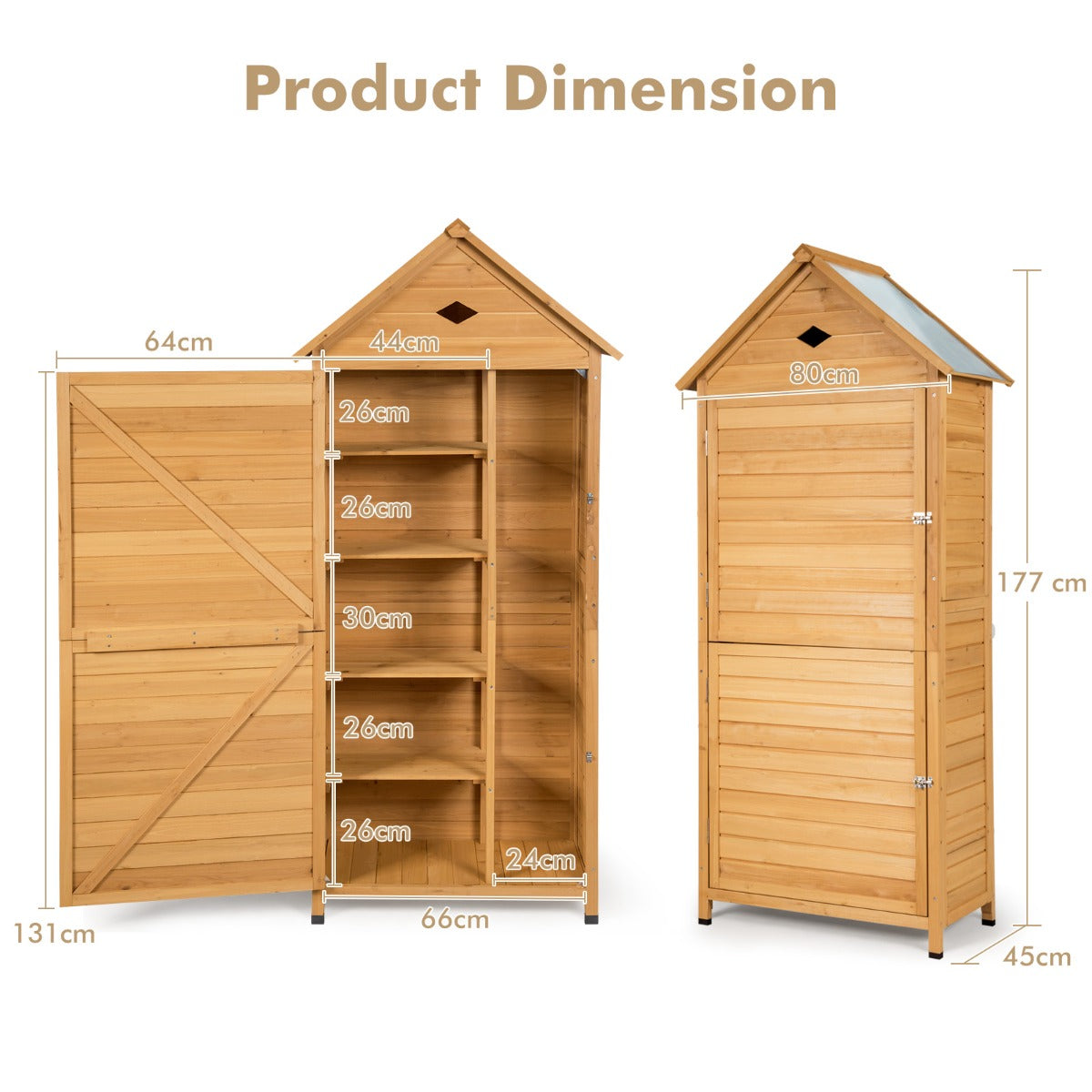 Durable Solid Wood Construction: Combining premium solid fir wood with waterproof paint, this storage shed has a strong and stable structure to provide extremely long service times. Besides, the tilted roof made of galvanized sheet prevents the shed from fading or deforming due to the effects of wind and rain, making it ideal for outdoor use.