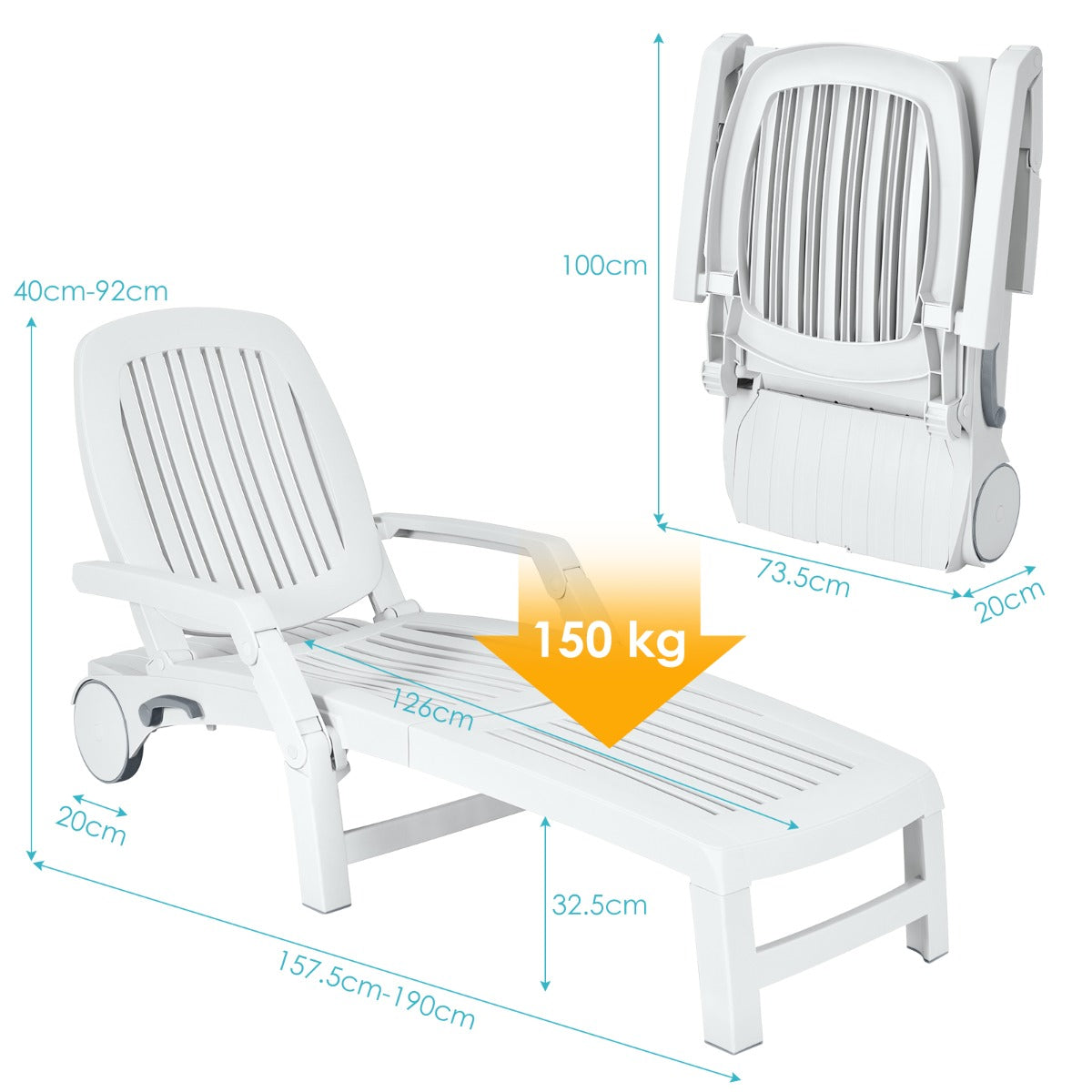 Installation Free: The assembly of this chaise lounge chair is not required, so you can open the box and unfold it for quick usage. Dimension of unfolding: 152.5-190 x 73.5 x 40-92 cm (L x W x H), dimension of folding: 100 x 73.5 x 20 cm (L x W x H), seat height from the ground: 32.5 cm.