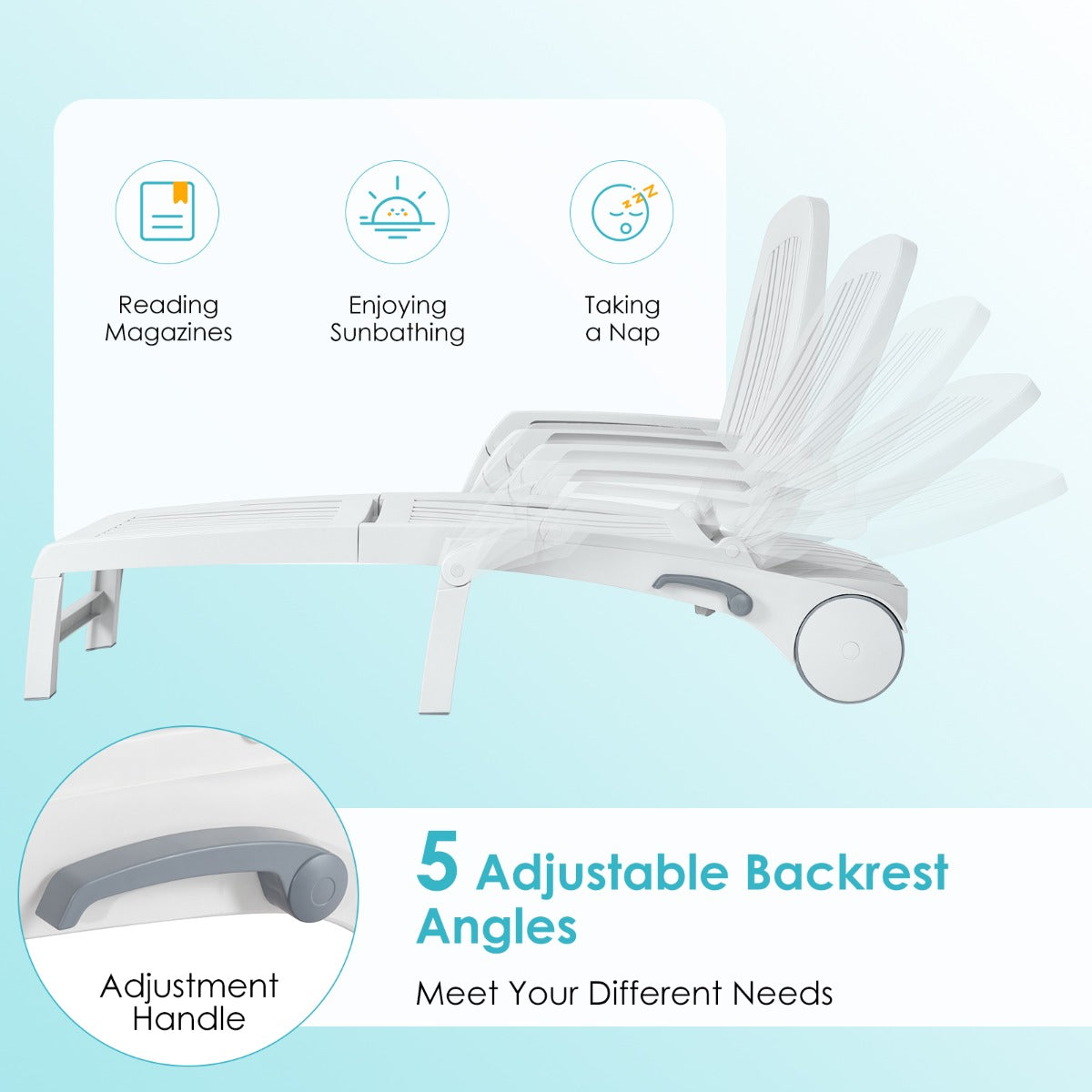 Adjustable Backrest Position: Featuring 5 adjustable backrest positions, this premium chaise lounge chair allows you to adjust from a high upright position to a lying position, greatly satisfying your various requirements, such as reading, and sunbathing, relaxing and taking a nap.