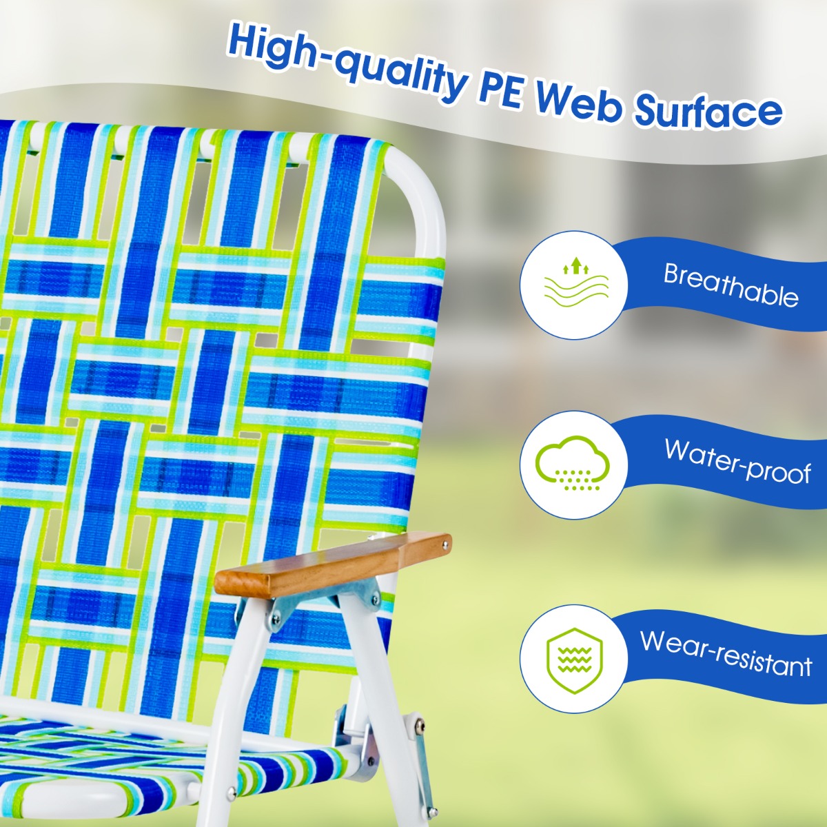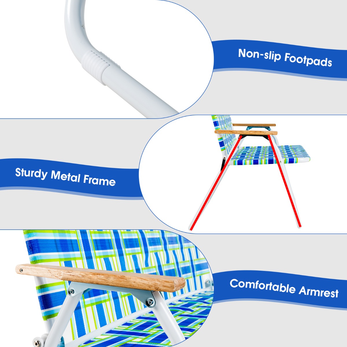 Ultimate Comfortable Experience: With a wider seat and backrest, our beach chairs can bring you a more comfortable experience. The beach chair is woven from PE, which makes it breathable and waterproof, being ideal for every season. In addition, the extra armrests can support your arms and make you more relaxed.
