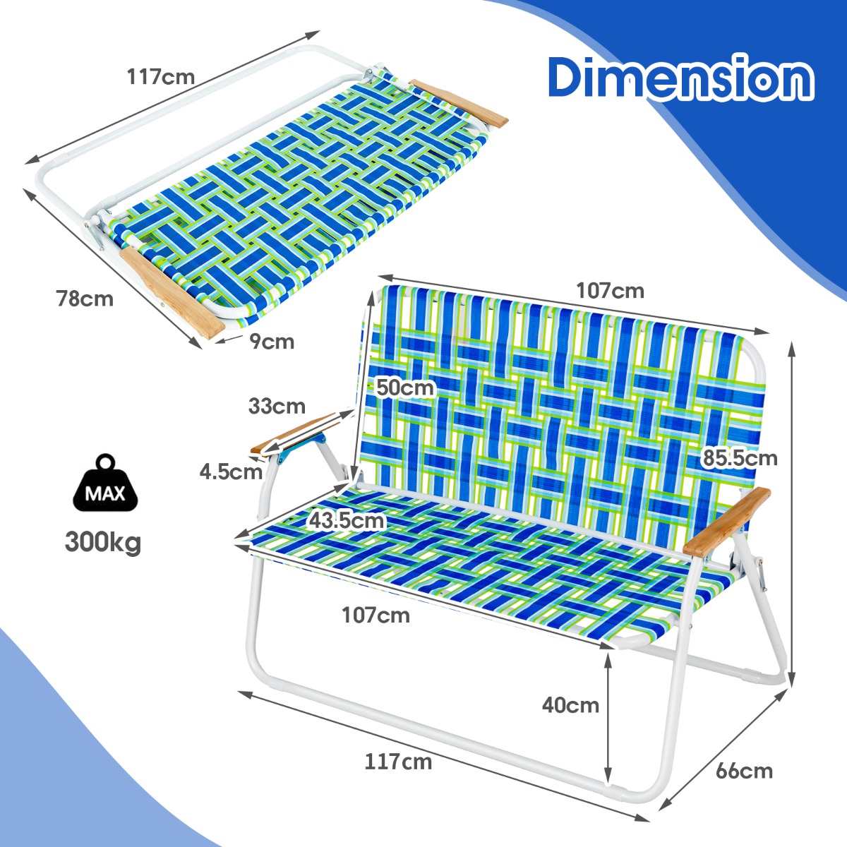 Durable Construction: The frame of the beach chair is made of high-quality metal tubing which provides a sturdy structure. The chair also has non-slip foot pads that prevent it from slipping, thus adding further stability. In addition, the chair is designed for 2 people and has a maximum weight capacity of 300 kg.