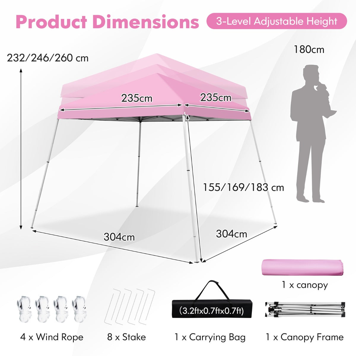 Enjoy Your Outdoor Life! Our instant pop-up canopy features a 304 x 304cm base footprint and a 235 x 235 cm (L x W) canopy top, providing a large shade area for your outdoor leisure time. It is suitable for your outdoor party, sports event, camping trip, farmers market, and more. This pop-up canopy tent is easy and quick to set up and take down by pushing or pulling the central locking system. And when not in use, you can fold it into a compact size and store it in the portable carrying bag, which would not take up much space for storage. You can also put it in the car trunk for your outdoor trip. The canopy is crafted with durable oxford fabric and coated with premium silver, which features excellent UPF 50+ sun protection and rain resistance. And the supporting frame is constructed of high-strength powder-coated metal, which is not easy to rust, peel, or chip. More than that, we also provide extra 4 wind ropes, 8 metal stakes, and 4 plastic footpads with stake holes to firmly fix the canopy on the ground, adding more stability and safety. There also comes 3 heights (232 cm, 246 cm, 260 cm) for you to choose from, allowing you to enjoy sunshades at different times.