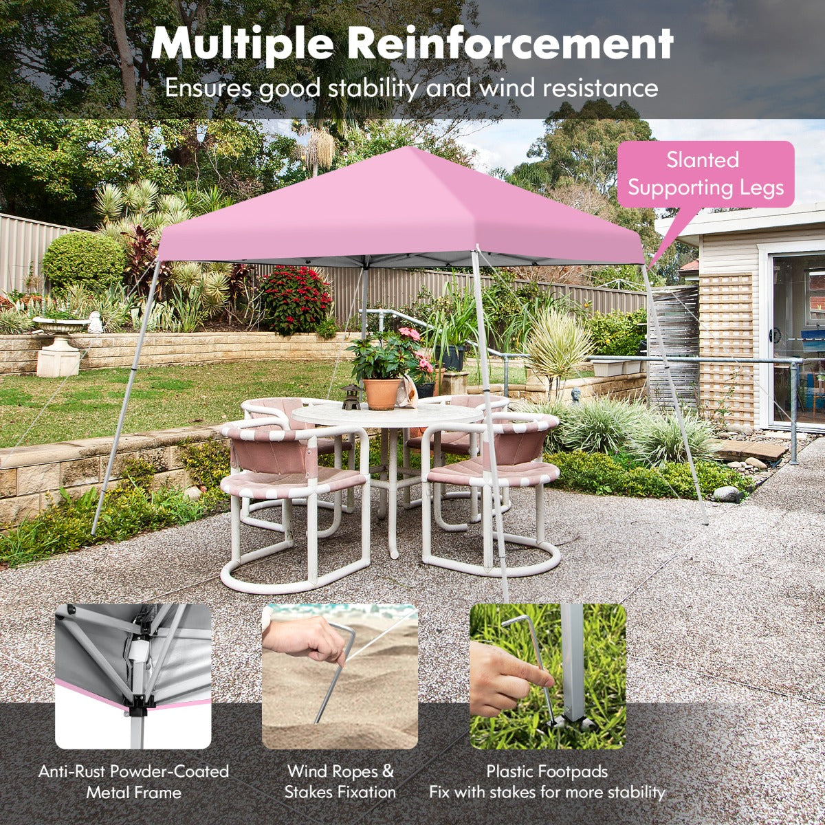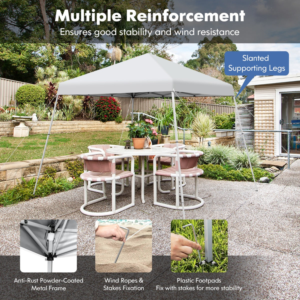 Multiple Reinforcement: The outdoor canopy tent is equipped with 4 wind ropes and 8 metal stakes for fixing the canopy on the ground for better wind resistance. And you can also fix the plastic footpads on the ground with stake holes. Besides, it adopts slanted supporting legs for adding more stability. (Note: We recommend taking the canopy down when coming with bad weather to prolong its service life.)