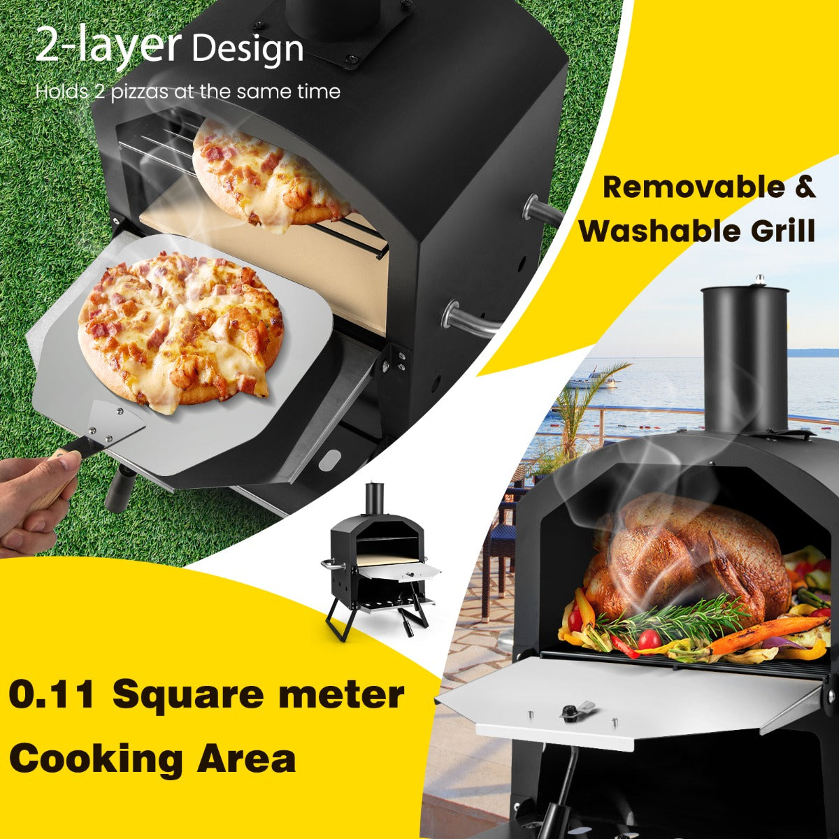 Large Cooking Capacity: Featuring a 2-layer design, the outdoor pizza oven has an internal cooking area of 1860 cm². Hence, you are able to cook 2 pizzas at the same time. Additionally, the middle racks are removable in order that food of larger heights can be accommodated.