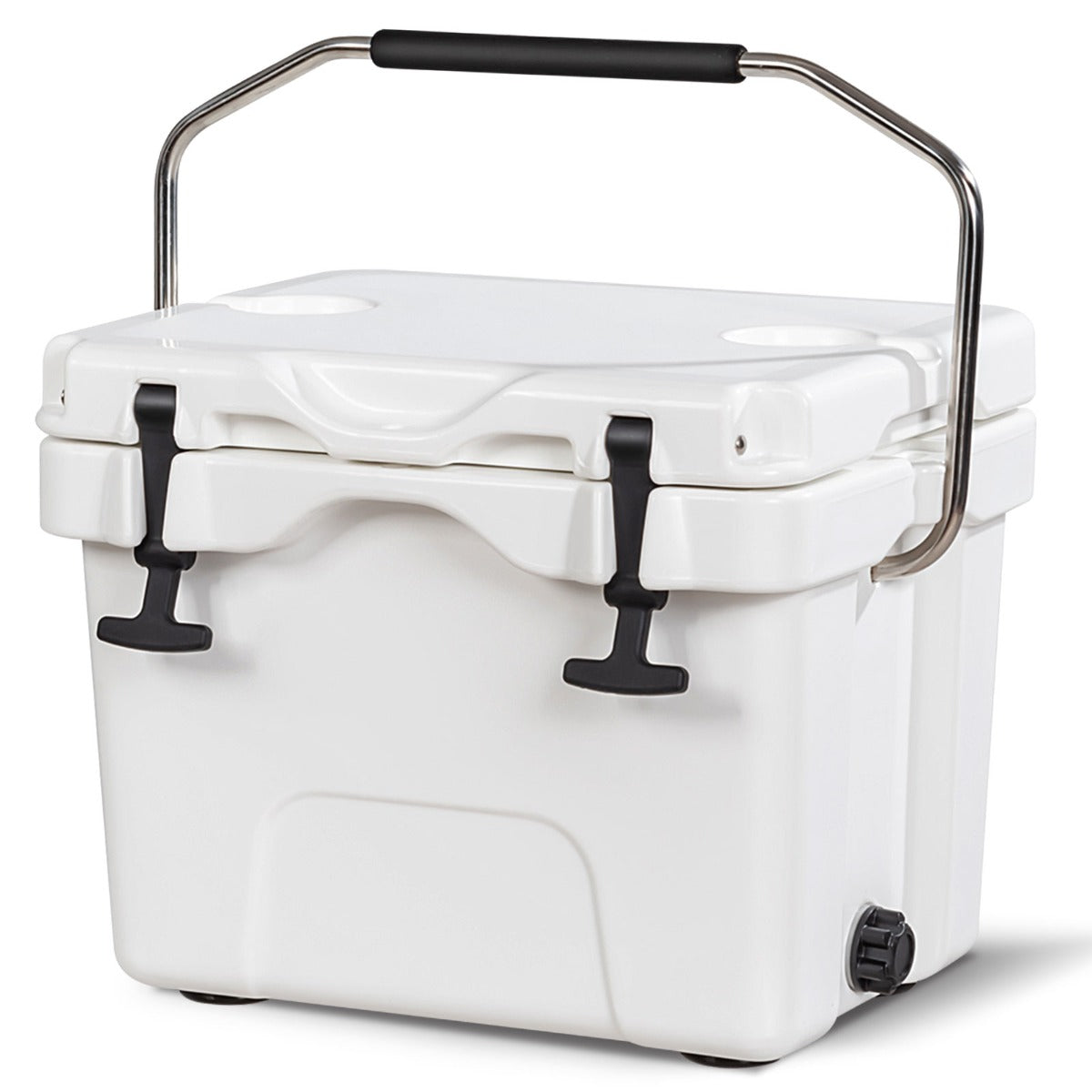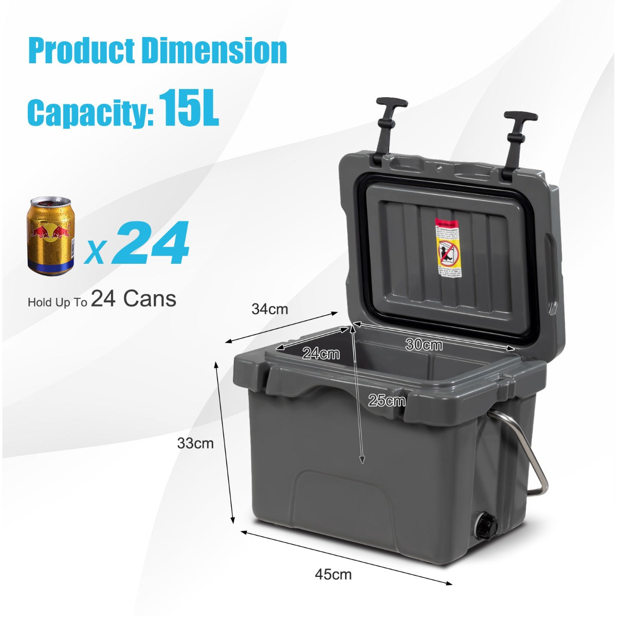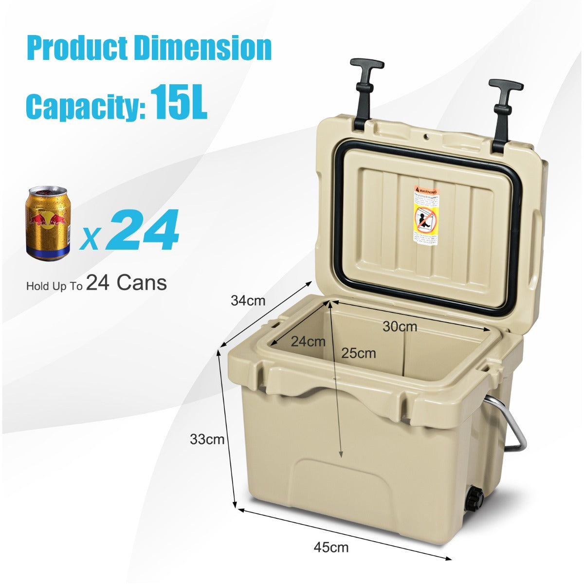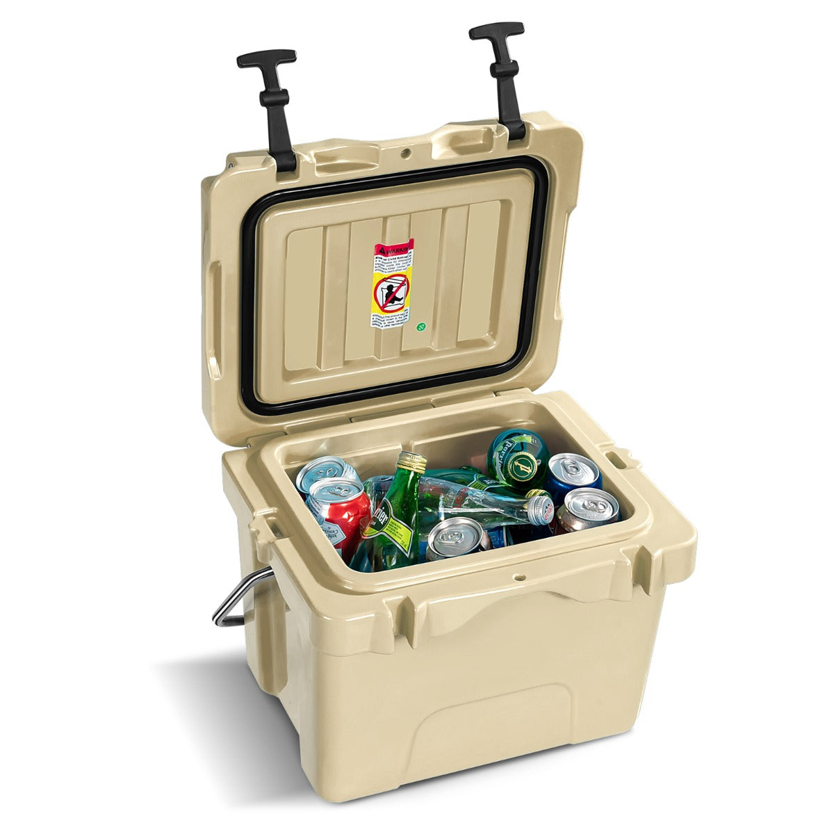 Premium insulation keeps ice cold for four days Integrated structure effectively prevents leakage of water. Reinforce locking latches for added security Lightweight design allows you to take it effortlessly. 24 cans capacity without ice to meet outdoor activity demands A good helper for you when going outside. Wide application for picnic, camping, self-drive travel and finishing. Durable construction is shatter-resistant and stands up to the rigours of the journey. Ant-slip feet at the bottom increase friction with the ground. 2 cup holders in the top Molded hole on the lid & liner by adding a lock (not included) Comes with drain plug to empty out water. Environmentally friendly and energy conservation
