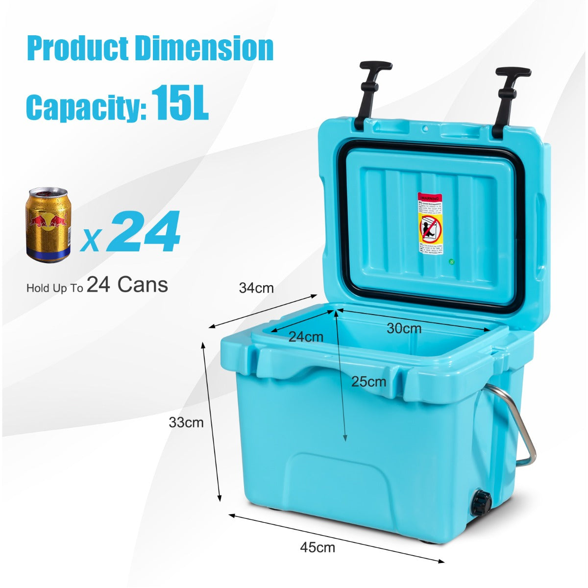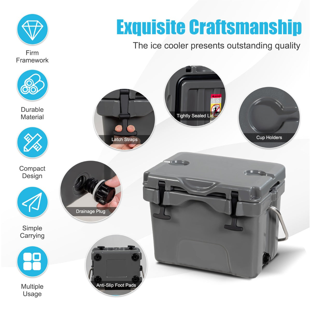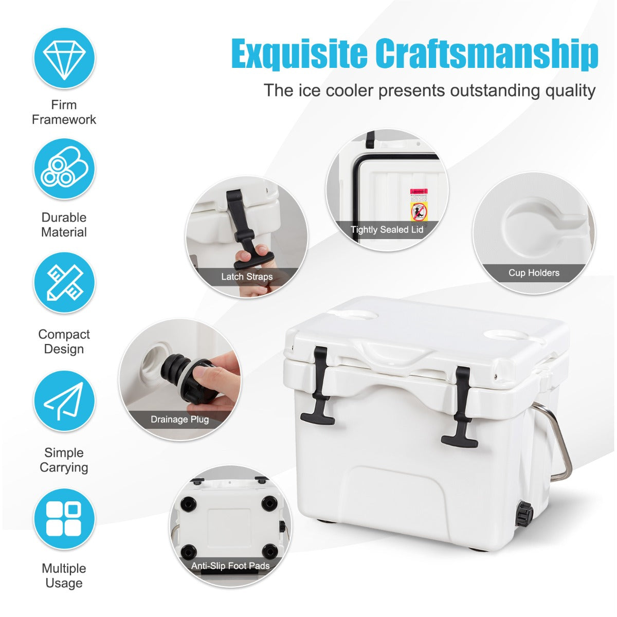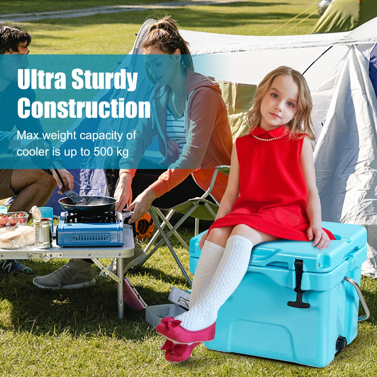 Premium insulation keeps ice cold for four days Integrated structure effectively prevents leakage of water. Reinforce locking latches for added security Lightweight design allows you to take it effortlessly. 24 cans capacity without ice to meet outdoor activity demands A good helper for you when going outside. Wide application for picnic, camping, self-drive travel and finishing. Durable construction is shatter-resistant and stands up to the rigours of the journey. Ant-slip feet at the bottom increase friction with the ground. 2 cup holders in the top Molded hole on the lid & liner by adding a lock (not included) Comes with drain plug to empty out water. Environmentally friendly and energy conservation