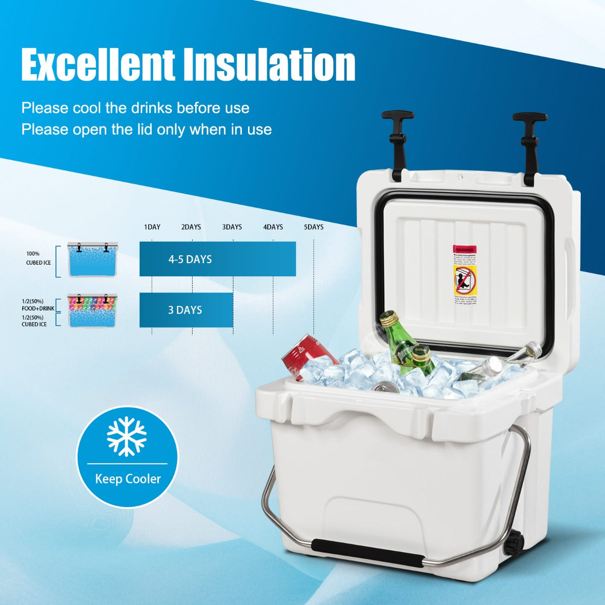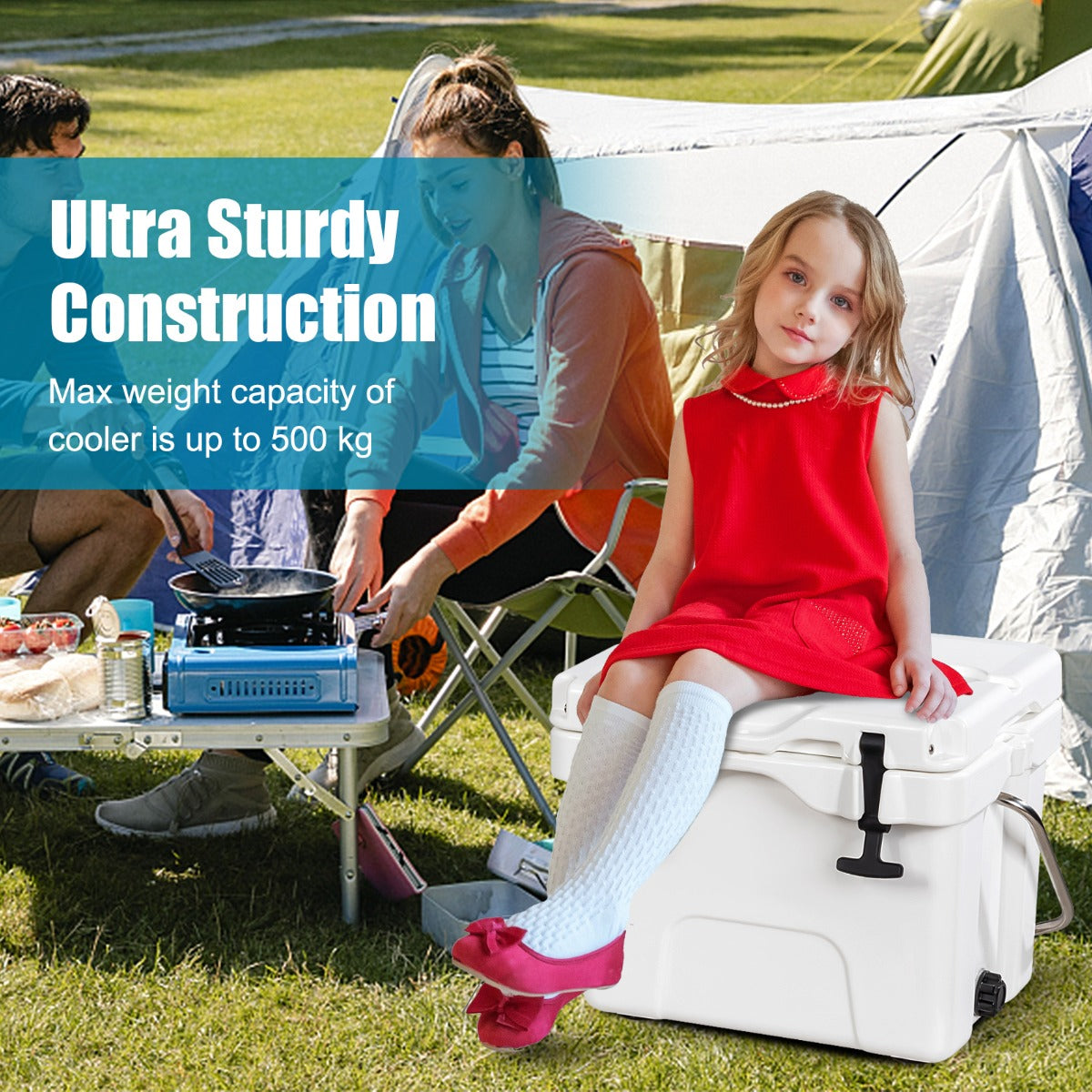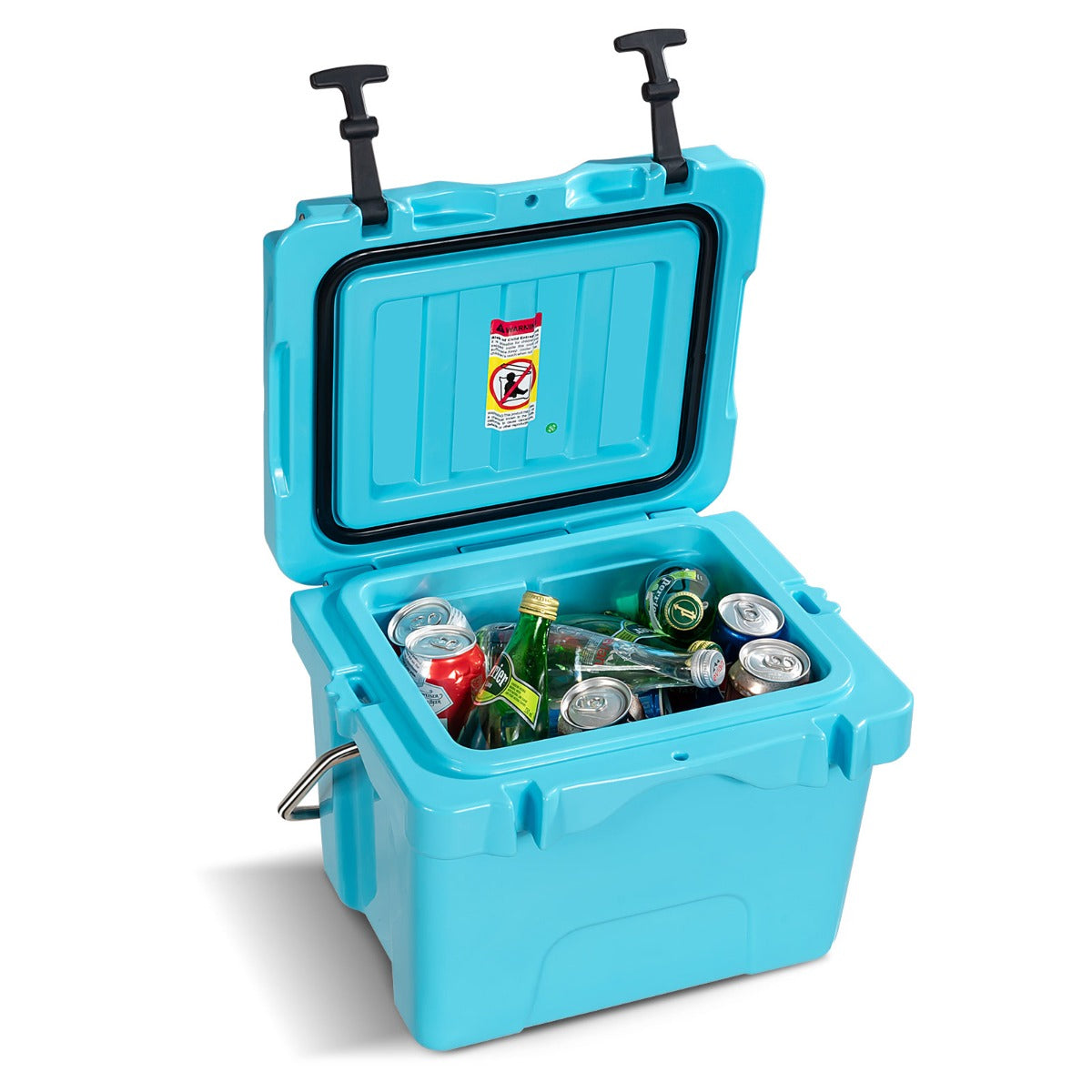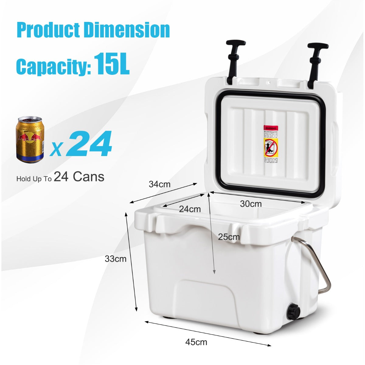 Premium insulation keeps ice cold for four days Integrated structure effectively prevents leakage of water. Reinforce locking latches for added security Lightweight design allows you to take it effortlessly. 24 cans capacity without ice to meet outdoor activity demands A good helper for you when going outside. Wide application for picnic, camping, self-drive travel and finishing. Durable construction is shatter-resistant and stands up to the rigours of the journey. Ant-slip feet at the bottom increase friction with the ground. 2 cup holders in the top Molded hole on the lid & liner by adding a lock (not included) Comes with drain plug to empty out water. Environmentally friendly and energy conservation