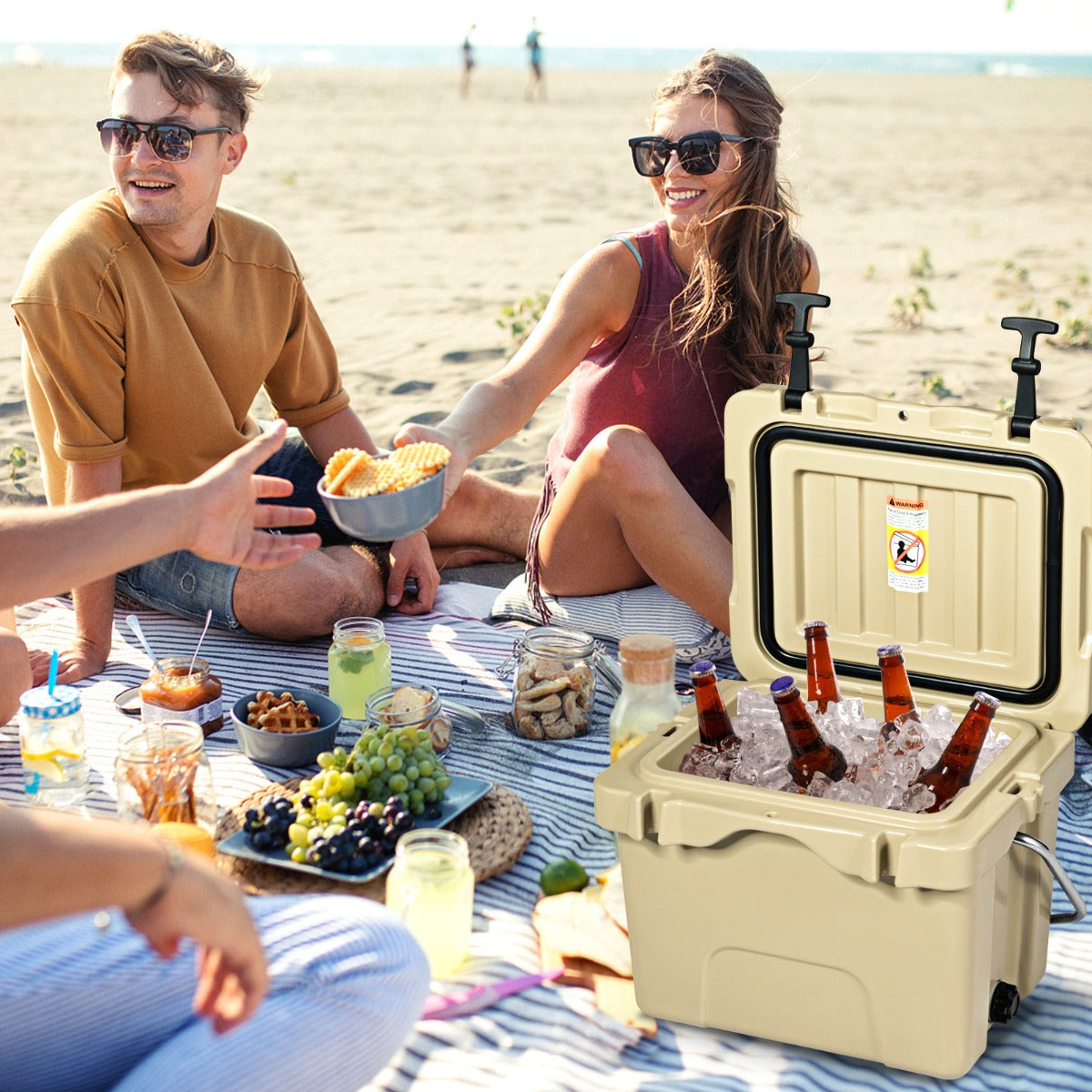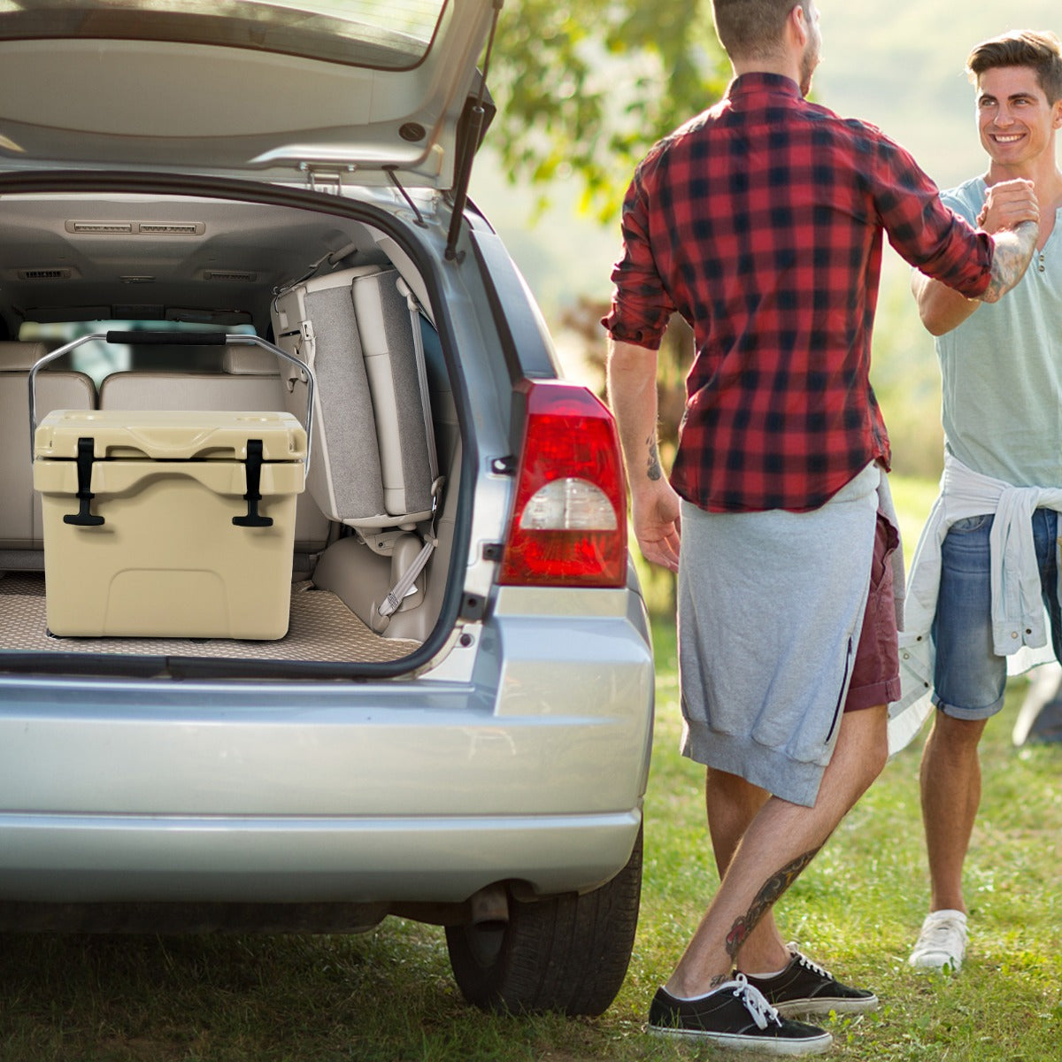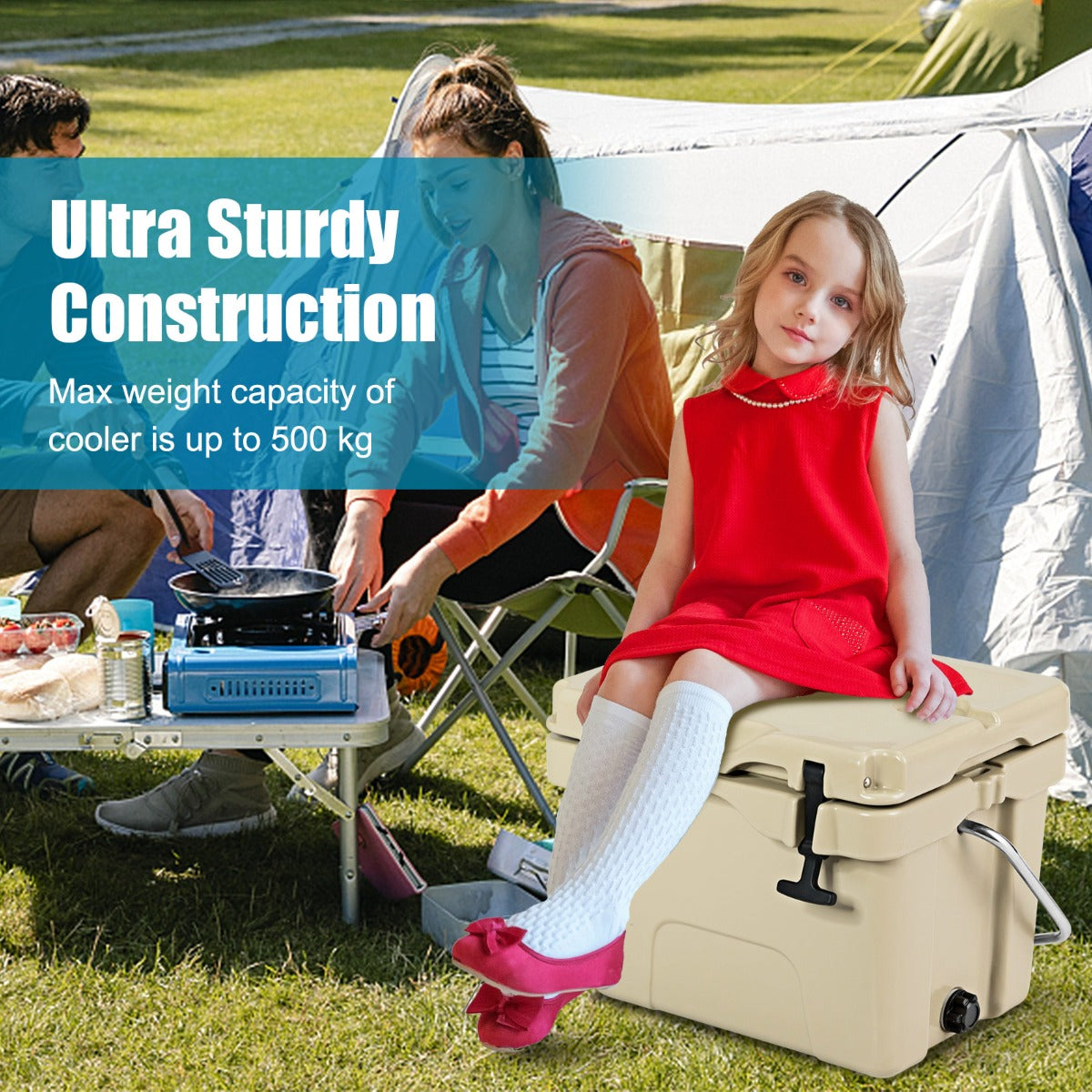 Durable Enough for Outdoor ActivityThis cooler made up with premium PE and PU which is shatter-resistant and provides superior insulation and strength. Besides, integrated khaki body with padded stainless steel handle, our outdoor cooler is aiming to an in-style and practical use. Besides, comes with drain plug to empty out the water.