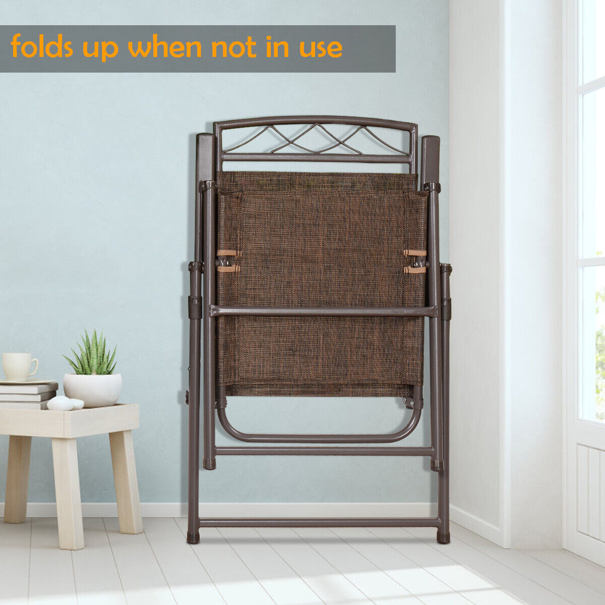Our Costway outdoorsling back chairs are an ideal choice for summer lounging. It can fully playits functional role in your daily life. Durable and rust-resistant steel frame aswell as textilene are beautiful décor of your home, patio or yard. What's more,the folding design is easy for stacking and storage and greatly helps you savestorage space. If you are looking for leisure chair, our chairs will be best choicefor you!