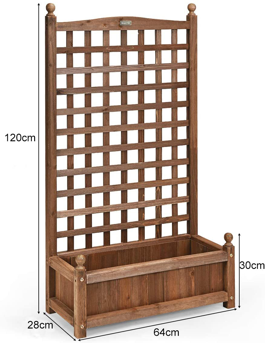 Our planter with trellis can solve your problem. This is our planter with trellis which is made of solid wood and has unique and beautiful appearance. The natural fir is durable which can be used for a long time. You don't have to worry about the wood breaking which is caused by exposure to the sun and wind. This pot has a grid design to support your climbing plants. The water outlet can be easily drained, allowing the plant to grow better. Our planter with trellis has a very large flower box that can hold a variety of plants you like. Of course, you can also grow crops. The exterior design is simple and easy to match and it is ideal to place in yard, garden, patio or balcony to be a perfect décor with many of your favorite plants. Our planter is definitely superior in quality.