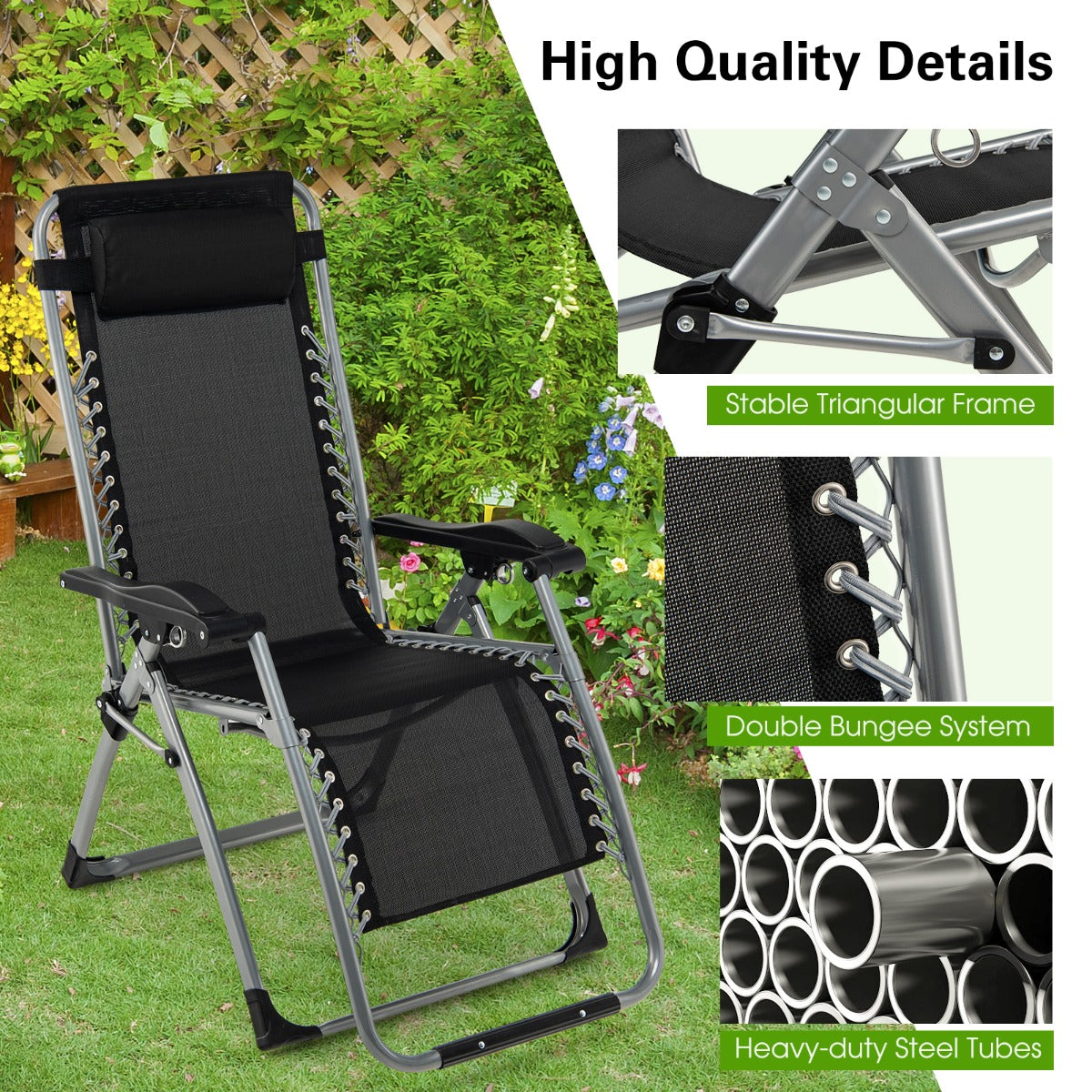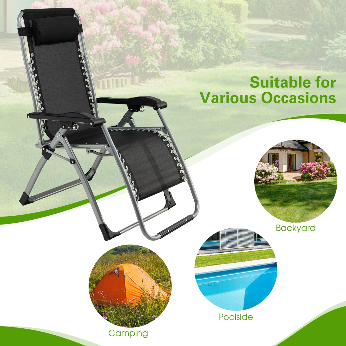Well-selected Materials: Our zero gravity recliner with heavy-duty steel frame and strong double bungee ropes is sturdy enough to hold up to 300kg. And the powder-coated finish are durable for outdoor use. Besides, the breathable and quick-drying fabric offers a cool experience in hot summers.