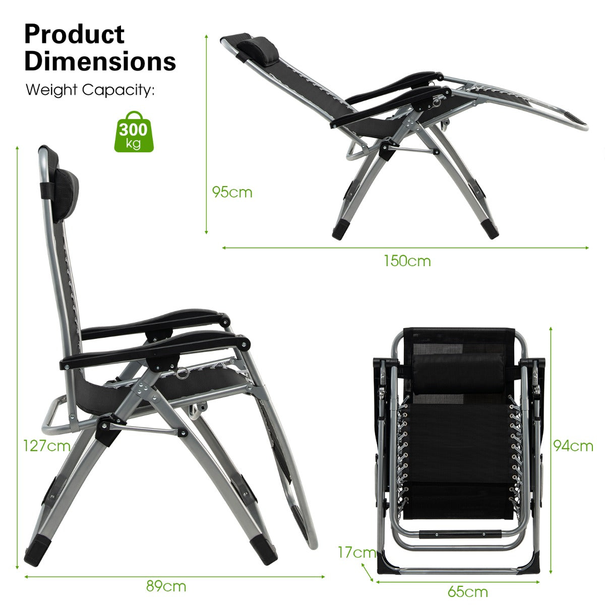 No Assembly Required: This zero gravity chair is fully assembled, you just need to take it out of the package and unfold it to use in seconds. Moreover, thanks to the superior performance of the fabric, our adjustable chaise lounge chair is easy to clean and maintain. Overall Dimension: 89-150 x 65 x 127-95cm(L x W x H).