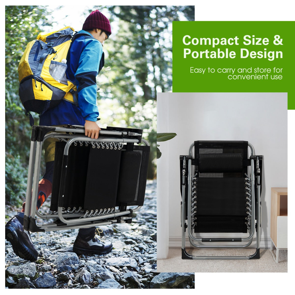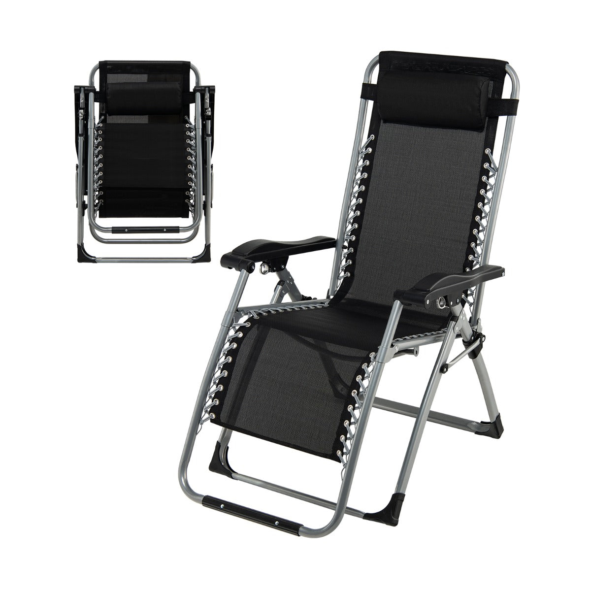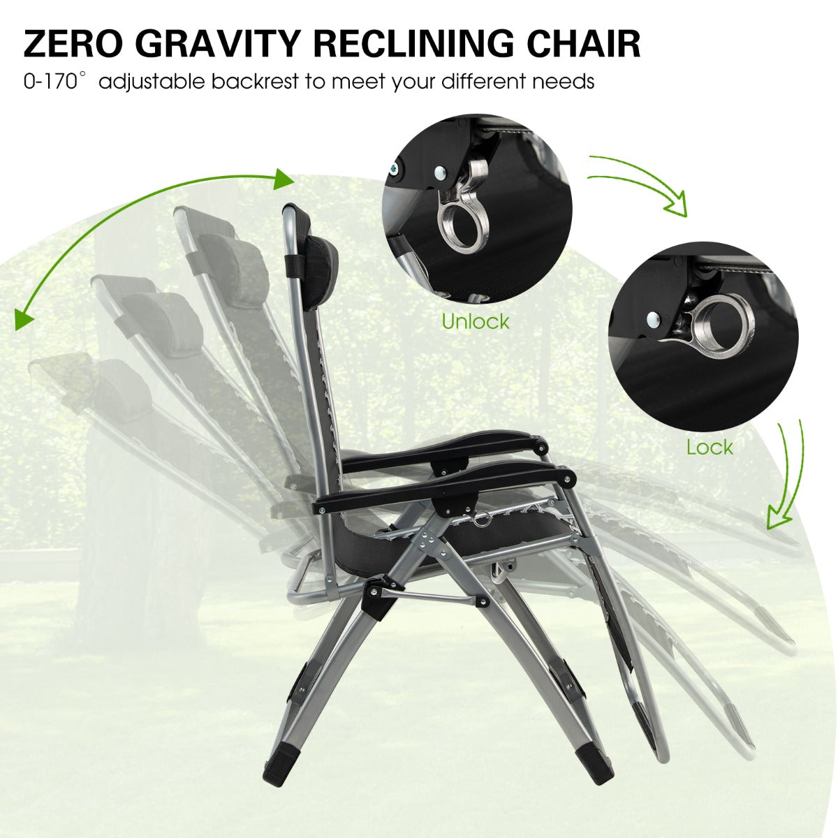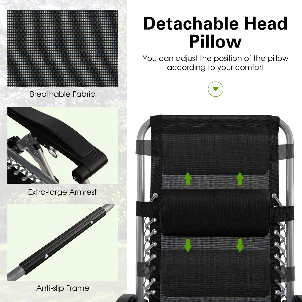 Folding & Considerate Design: The lightweight zero-gravity chair can be folded into a compact size to take up less space when not in use. What's more, the U-shaped leg with non-slip foot pads enhances overall stability. And the padded pillow is detachable and adjustable for convenient use.