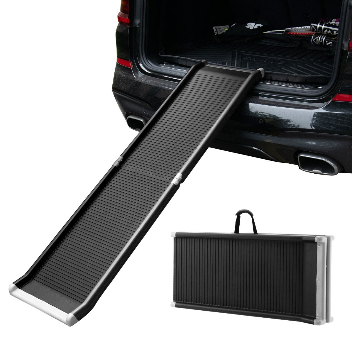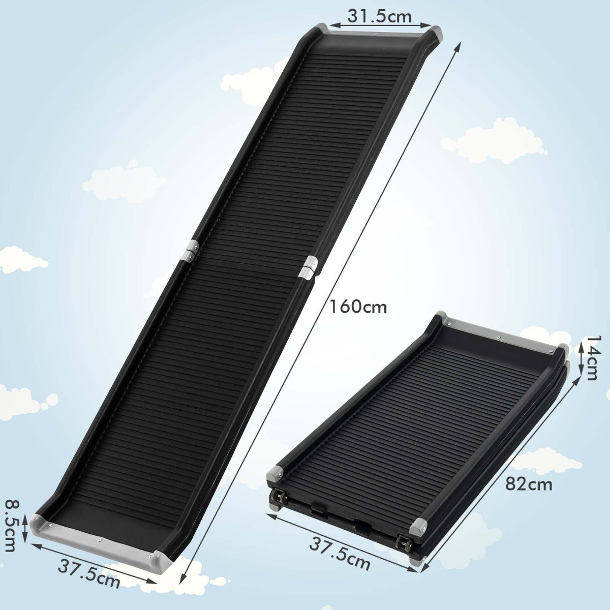 Our 160 cm large pet ramp is the perfect gift for small dogs, the elder, and injured pets, allowing your dogs or cats to jump in or out of the vehicle trunks easily to avoid injuries. It is made of durable PE material and supported by a sturdy powder-coated steel frame, ensuring great rust resistance and long-lasting durability. Moreover, the non-slip strip surface and raised side rails provide your furry friends with optimal traction and secure footing when walking on the ramp, ensuring great stability and safety. More than that, it can also be folded and the folding ramp measures 82 cm x 37.5 cm x 14 cm (L x W x H), which would not take up much space for transportation and storage. And there exist convenient straps for easy movement. Whether helps pets climb stairs, boost up into vehicles, or help climb into high couches or beds, it can meet your needs!