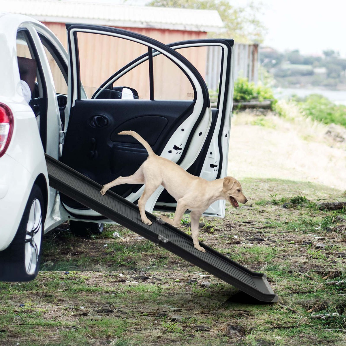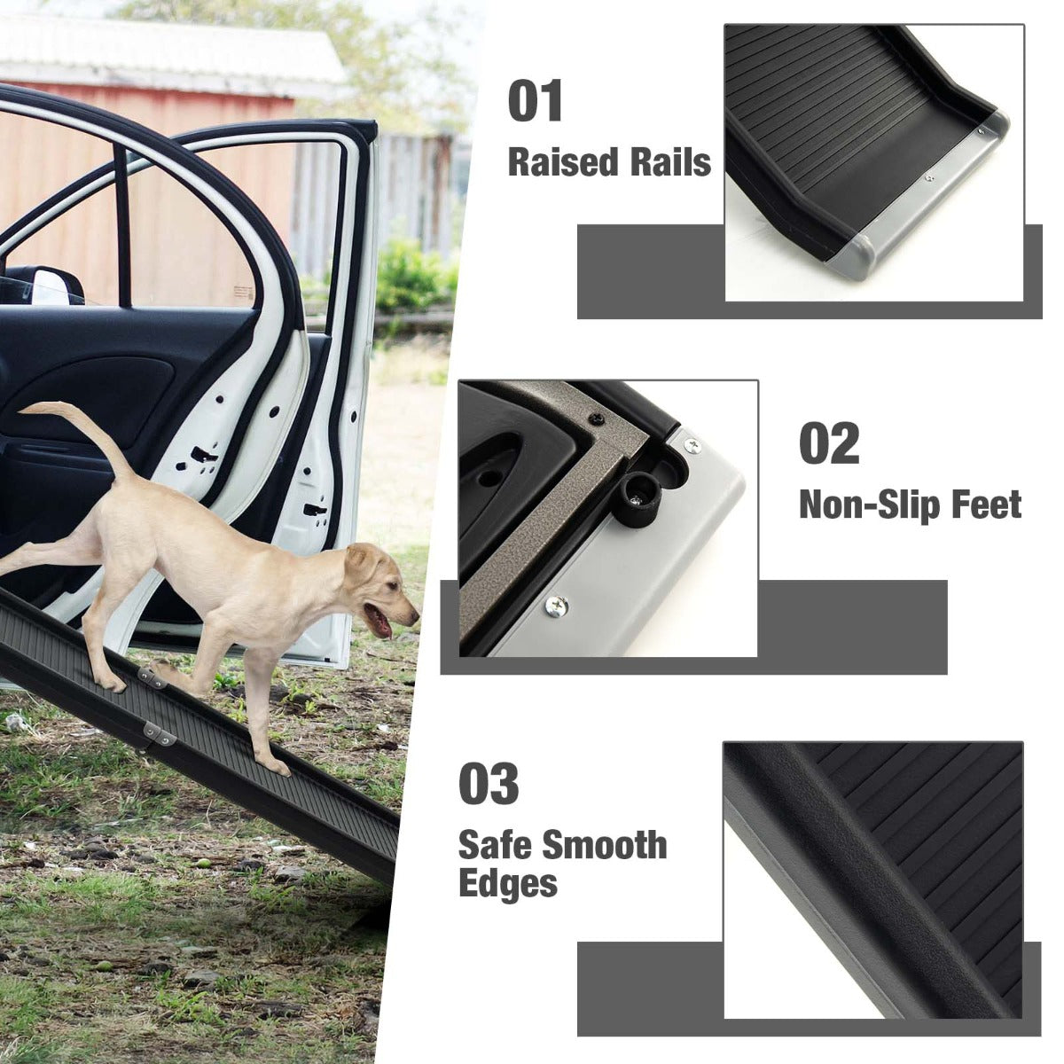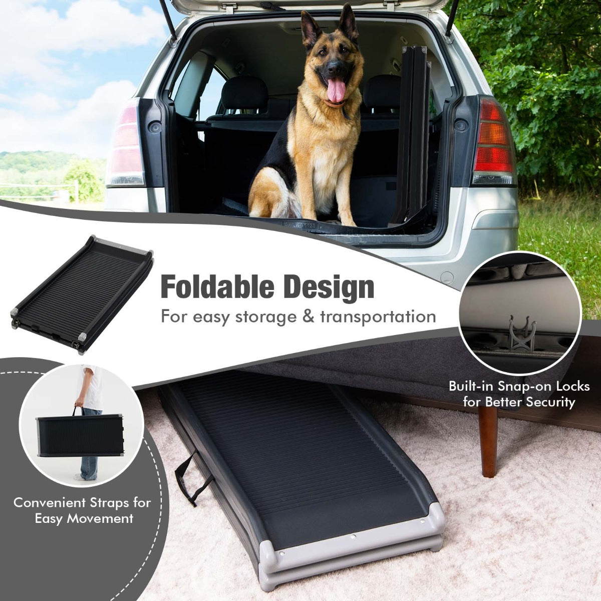 Foldable & Compact Design: The car ramp for pets is convenient to fold into a compact size and there exist built-in snap-on locks making it closed, which are easy to transport for travel and easy to store when not in use. In addition, it features straps for easy movement.