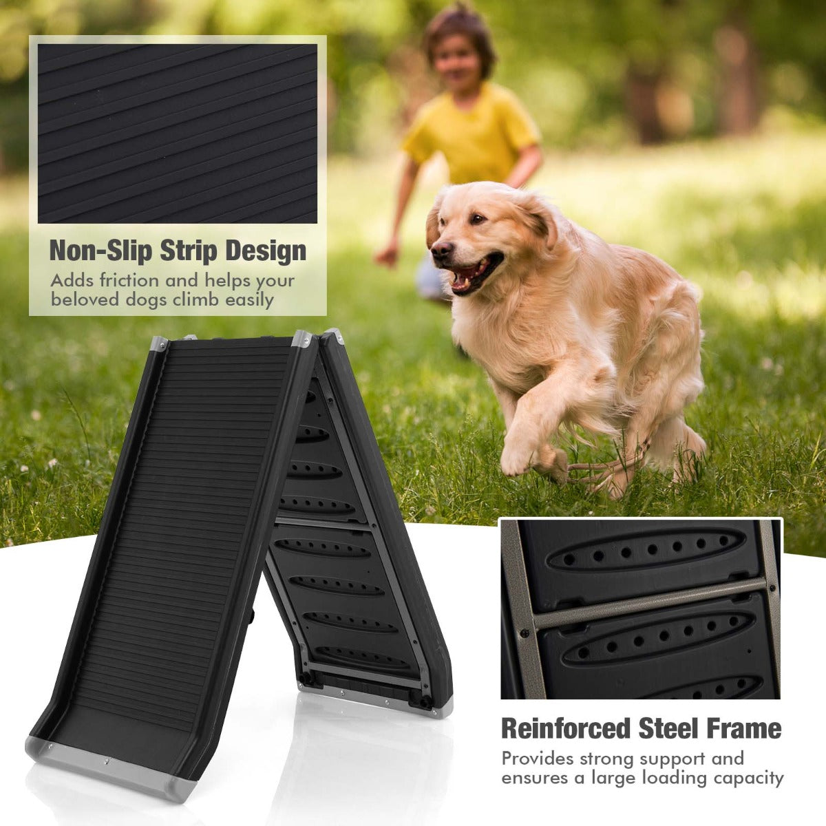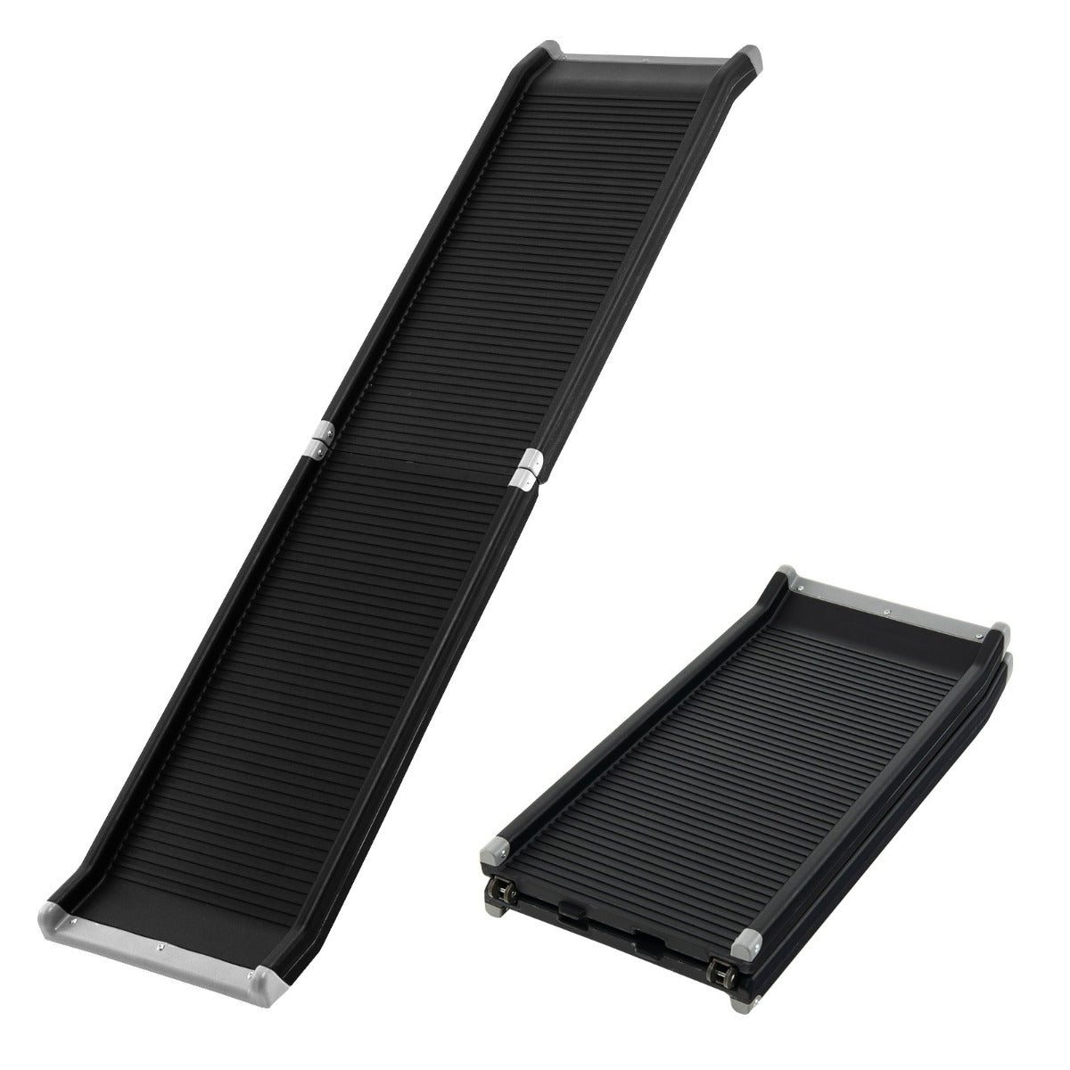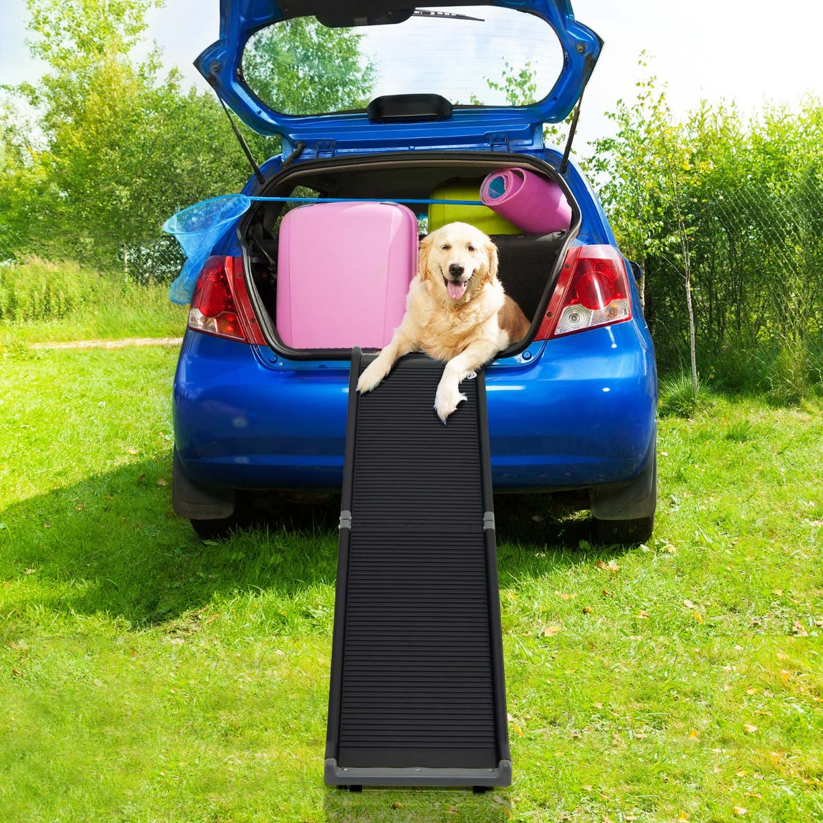 Foldable & Compact Design: The car ramp for pets is convenient to fold into a compact size and there exist built-in snap-on locks making it closed, which are easy to transport for travel and easy to store when not in use. In addition, it features straps for easy movement.