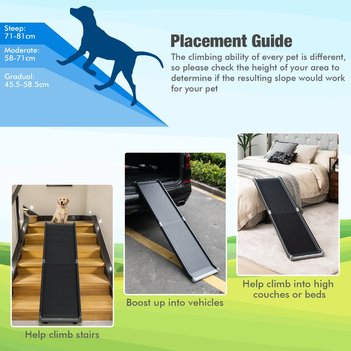 No Installation Required & Placement Guide: The compact pet ramp requires no assembly so you can use it immediately after receiving the package, and all you need to do is unfold it and set it in place. In addition, the climbing ability of every pet is different, so please check the height of your area to determine if the resulting slope would work for your pet.