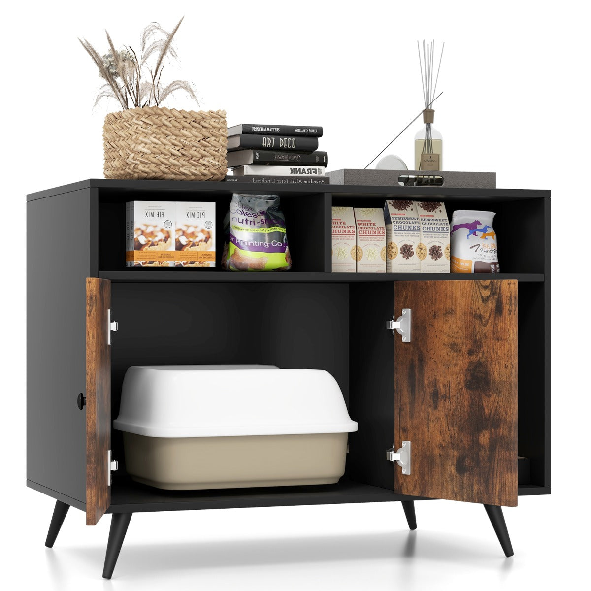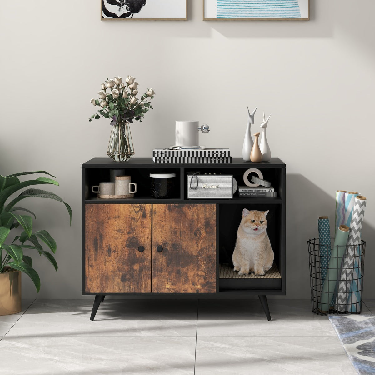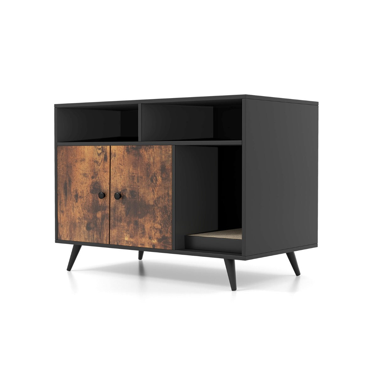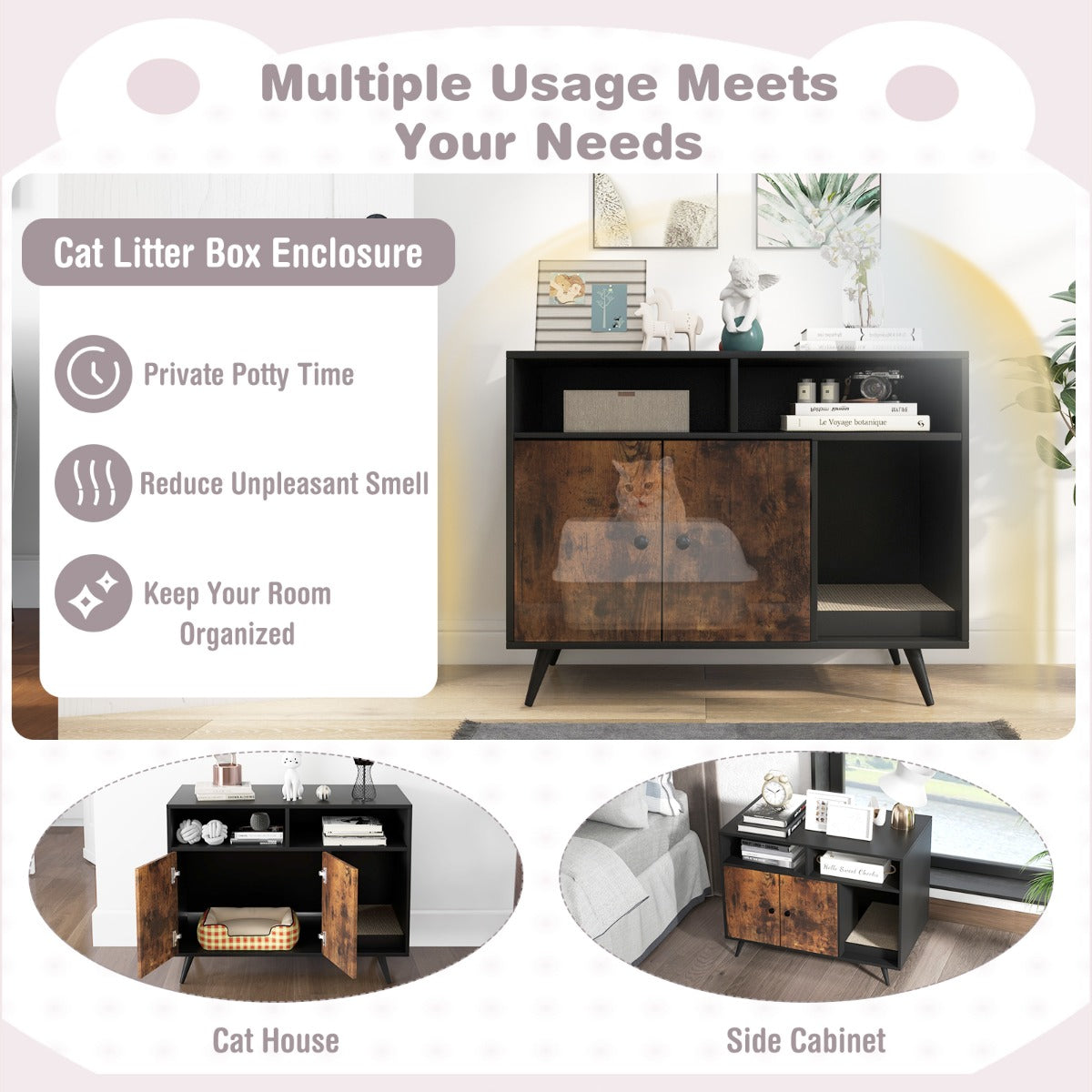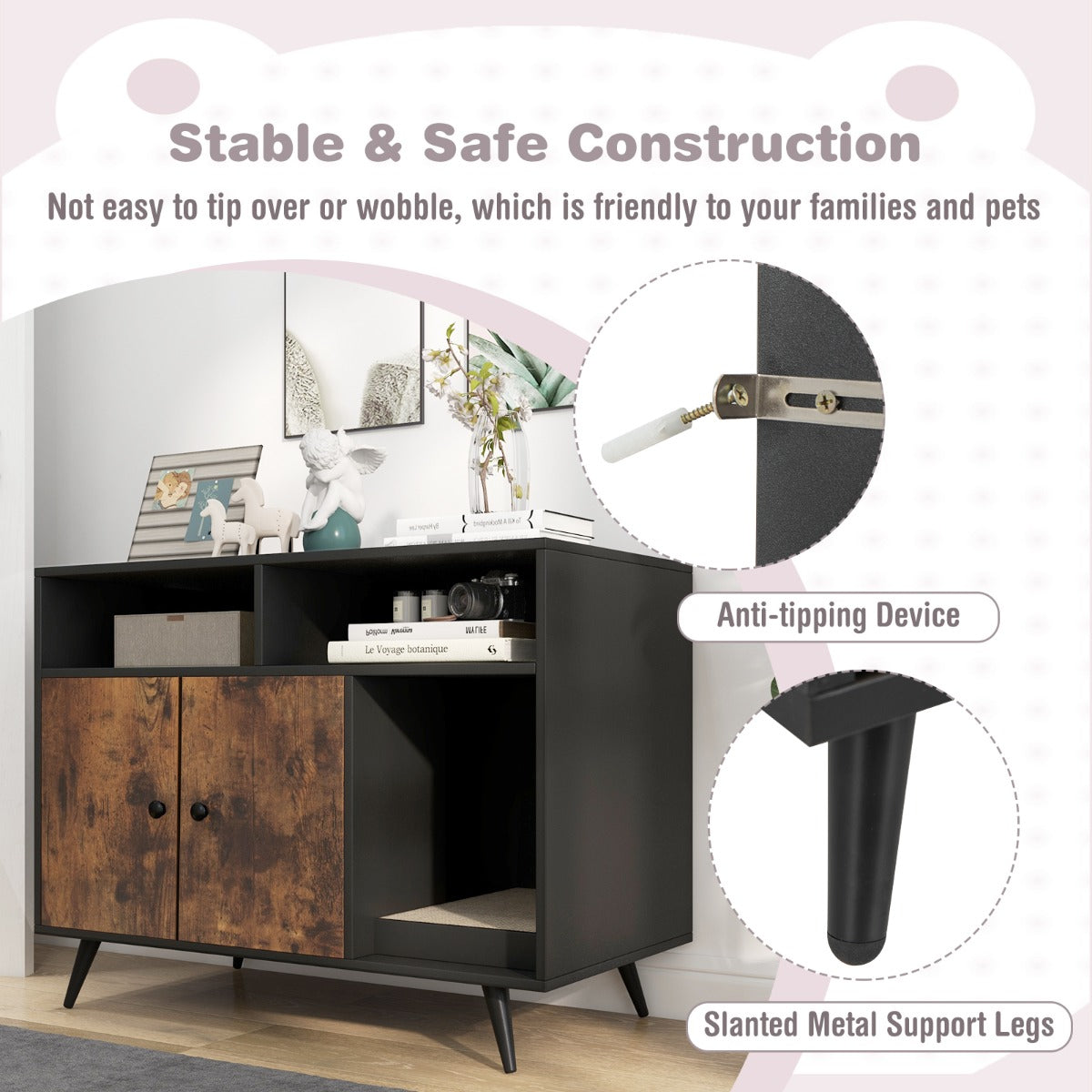 Our wooden cat litter box enclosure measures 90 x 50 x 70 cm (L x W x H) and the interior measuring 53 x 48 x 38.5 cm (L x W x H) is perfect for holding various types of cat litter boxes (Notice: Please measure the size of your cat litter box before purchase). It is designed with a large countertop, 2 open compartments, and a double-door cabinet to hold cat supplies, cat litter box, cat bed, ornament, books, and more, keeping items well organized. Our cat furniture is equipped with flexible hinges to make it easy to open and close the door, and anti-toppling devices to secure the cabinet on the wall, keeping your lovely kitten in a safe environment. More than that, we also provide a cat scratching pad and a winding entry, giving your furry friend more fun. And it can not only be used as a cat litter box enclosure, but as a side table, as a cat house, and storage cabinet, end table, nightstand, or coffee table, meeting your different needs.