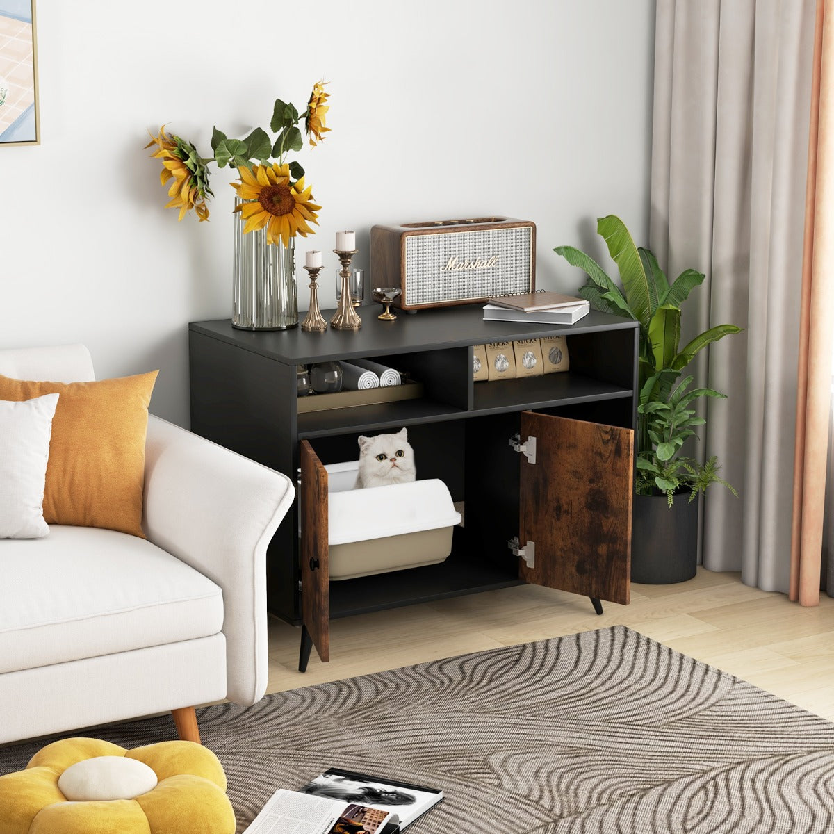 Spacious Storage Space: The hidden cat litter box enclosure is designed with 2 open compartments to place cat supplies, cat litter, or daily necessities. And there exists a large countertop for putting some decorations or a cat bed. Besides, the interior measures 53cm x 48cm x 38.5cm (L x W x H), which is suitable for most cat litter boxes.