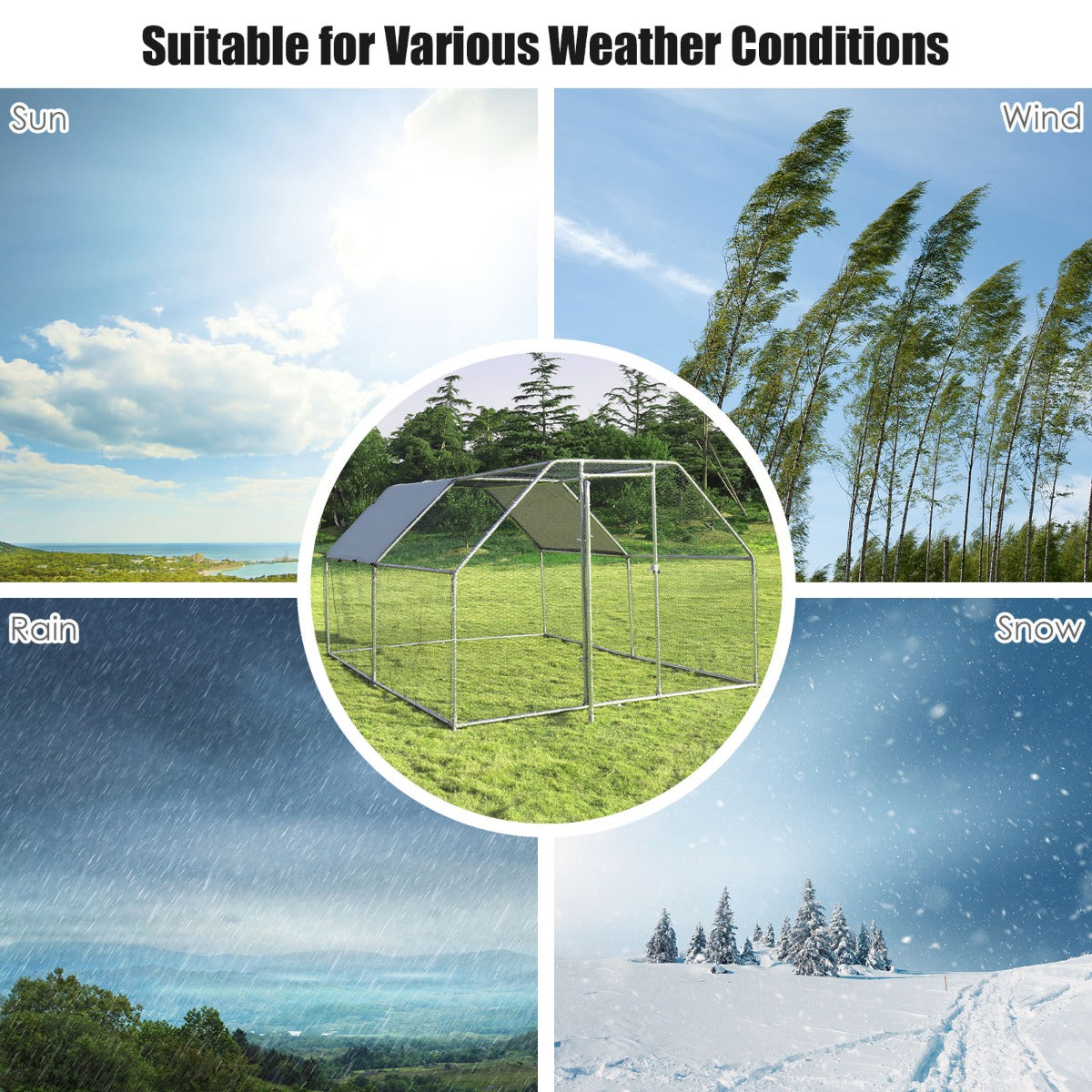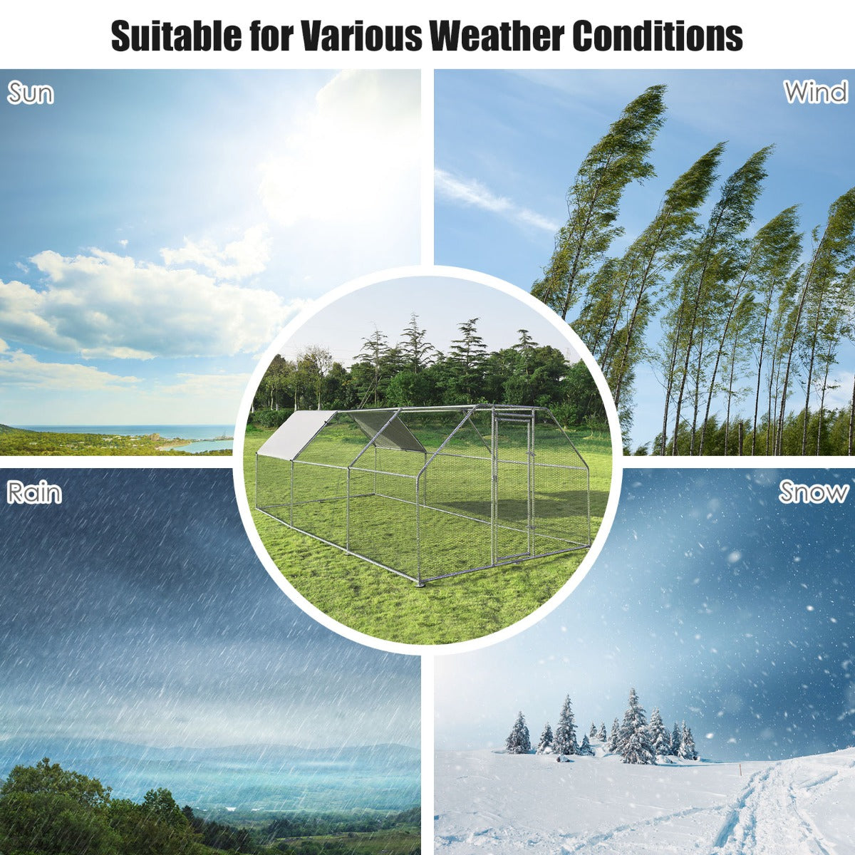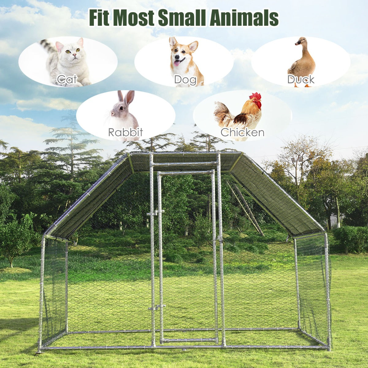 Solid Steel Construction: The heavy-duty chicken coop with premium steel frame is rust-resistant and sturdy, which is suitable for outdoor use. Besides, the firm connection among each galvanized tubes ensures extra stability. Thus, our chicken cage can well protect your pets in different climates.