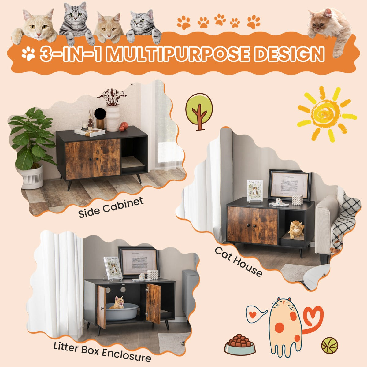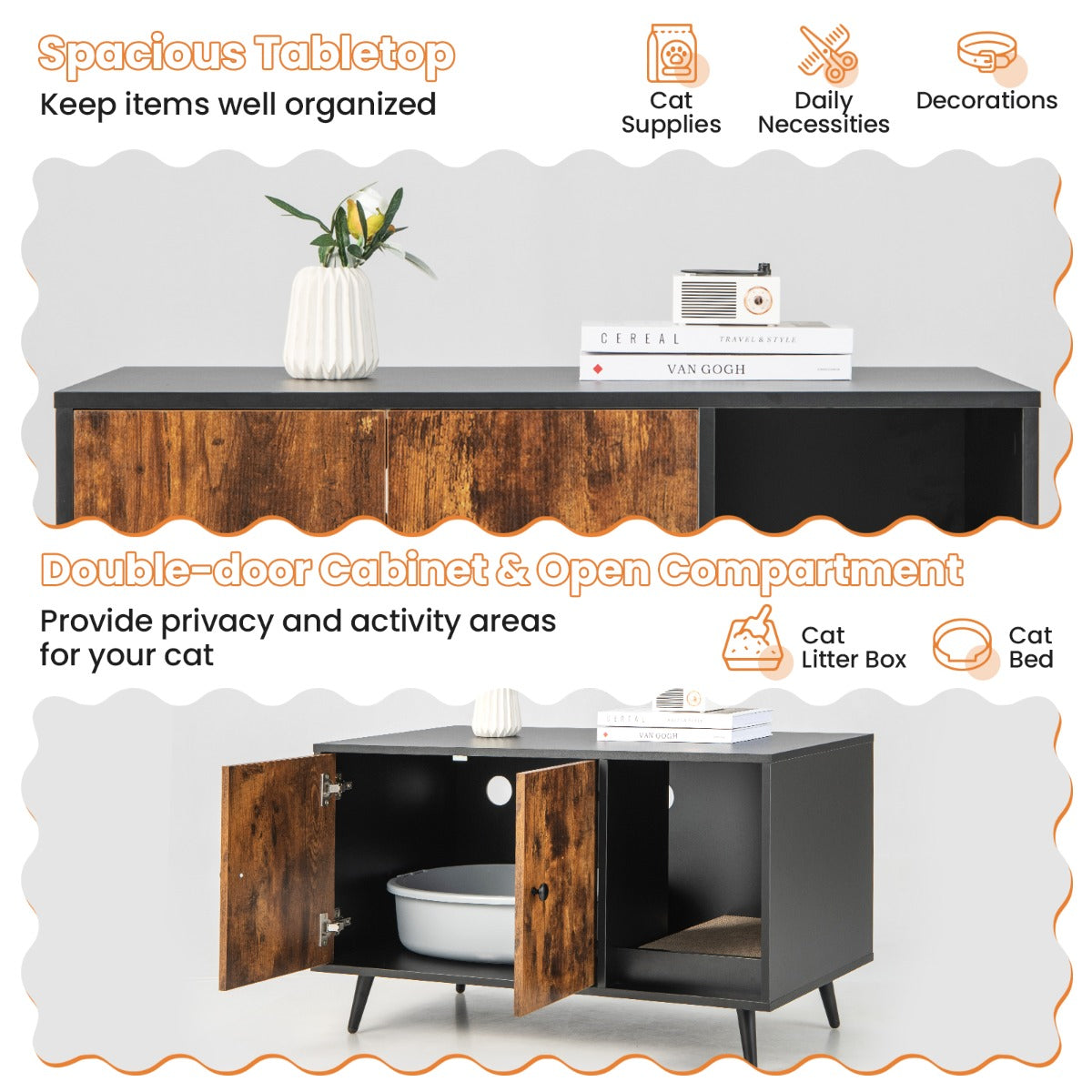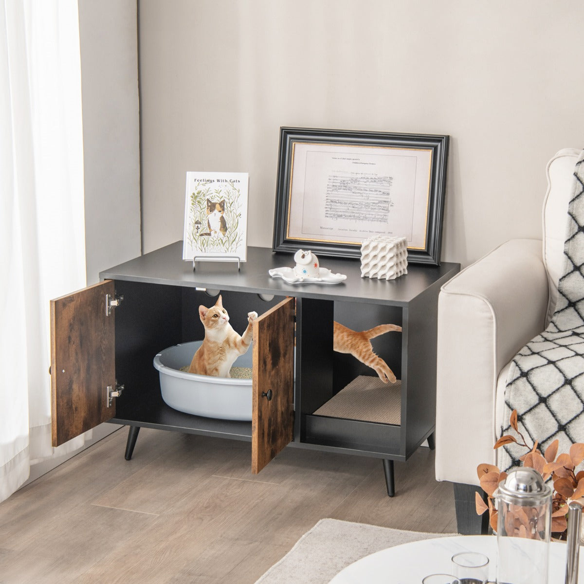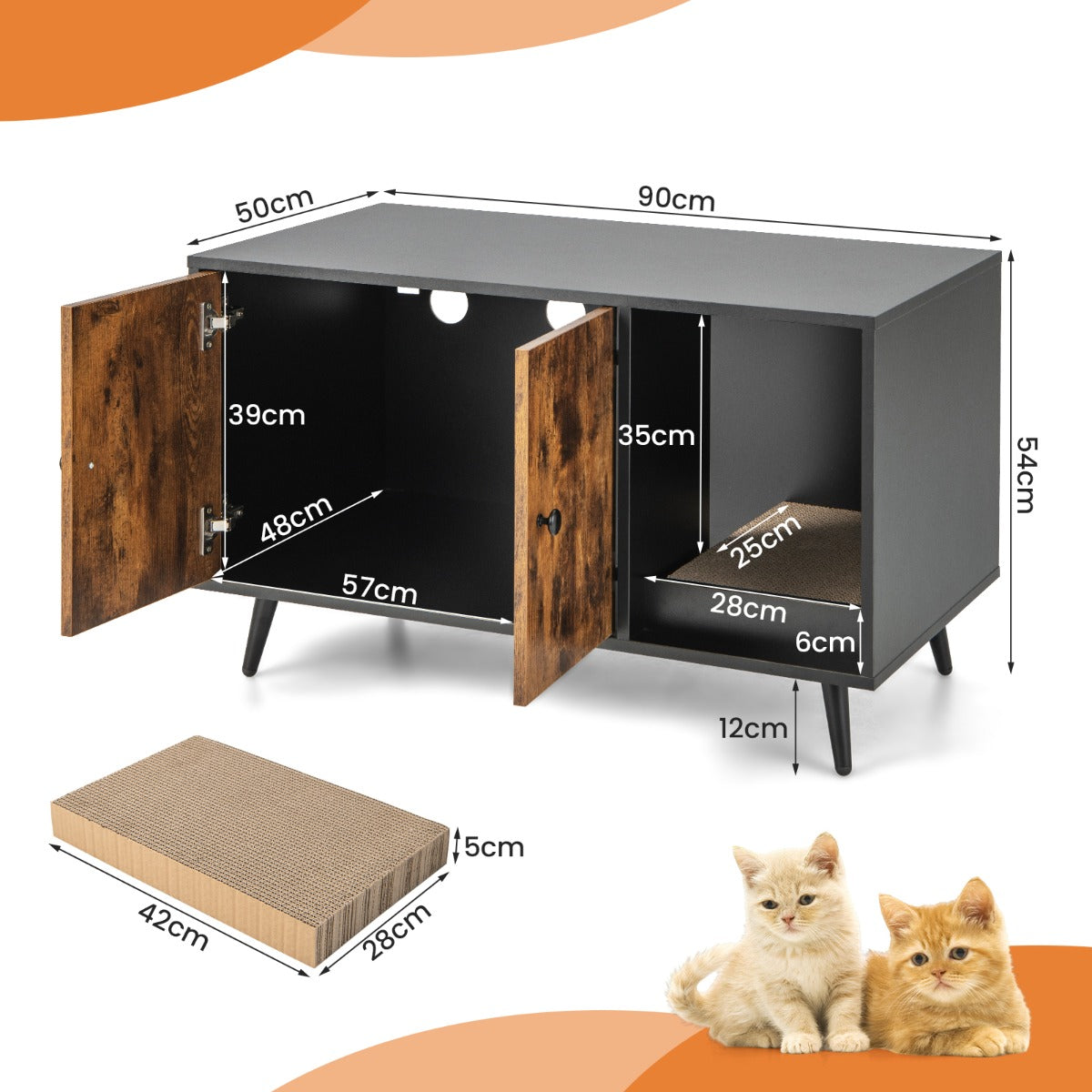 Let your furry friends enjoy potty time with our cat litter box enclosure! Bothered by your cat leaving litter everywhere? Our versatile cat litter box enclosure will provide you with the perfect solution. A private double door cabinet is perfect for hiding the litter box and avoiding odors. And the vent at the back of the cabinet facilitates air circulation. In addition, a winding walkway allows cats to access the cat scratch compartment and grind their claws, so you don't have to worry about the delicate furniture being destroyed! Due to its sleek design and a spacious desktop, you can also use it as a storage or side cabinet. Made from grade E0 engineered wood and supported by metal diagonal legs, this cat house ensures superior durability and stability. Besides, it is equipped with anti-tipping device, let you rest assured to use! So don't hesitate to bring it home as a gift for you furry friends!
