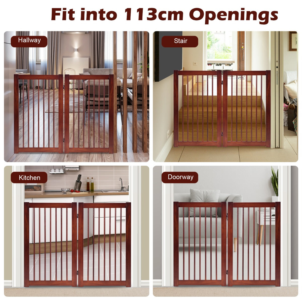 Come and take a look at our 4 panel configurable freestanding pet gate! Made of natural pine wood, the dog date is sturdy and durable for long service life. It creates a safe playing space for your pets. In this way, you can safely keep your pet in an enclosed environment without worries. And foldable design makes it easy to store in any corner. Besides, hinge door gate makes you easy to open the door and non-slip foot mats greatly increase friction and allow the whole fence to stand firmly on the floor.