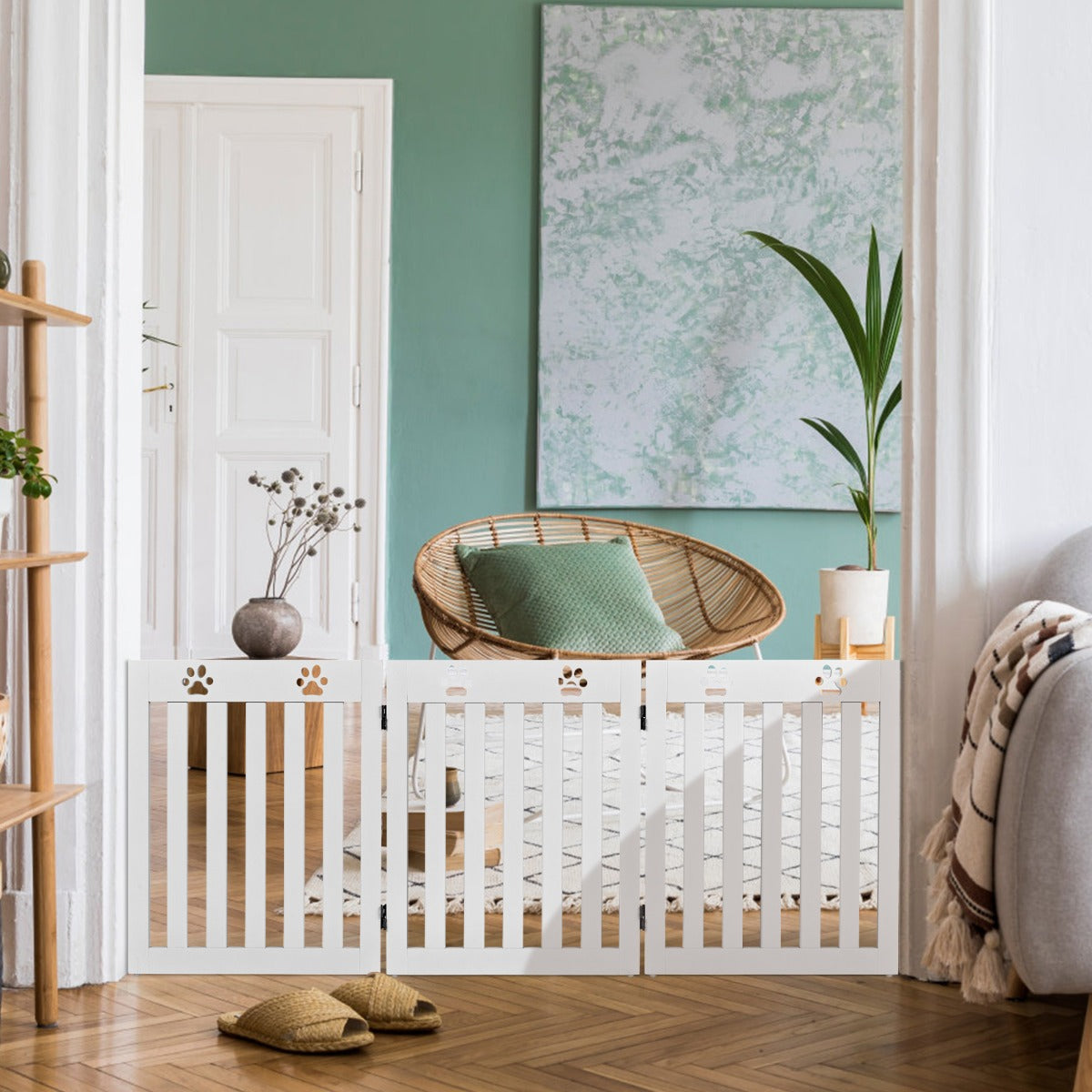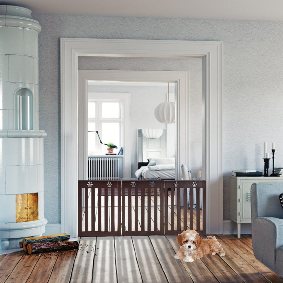 Considering the safety of your four-legged friend, we prepared this wooden freestanding pet gate for your puppy!