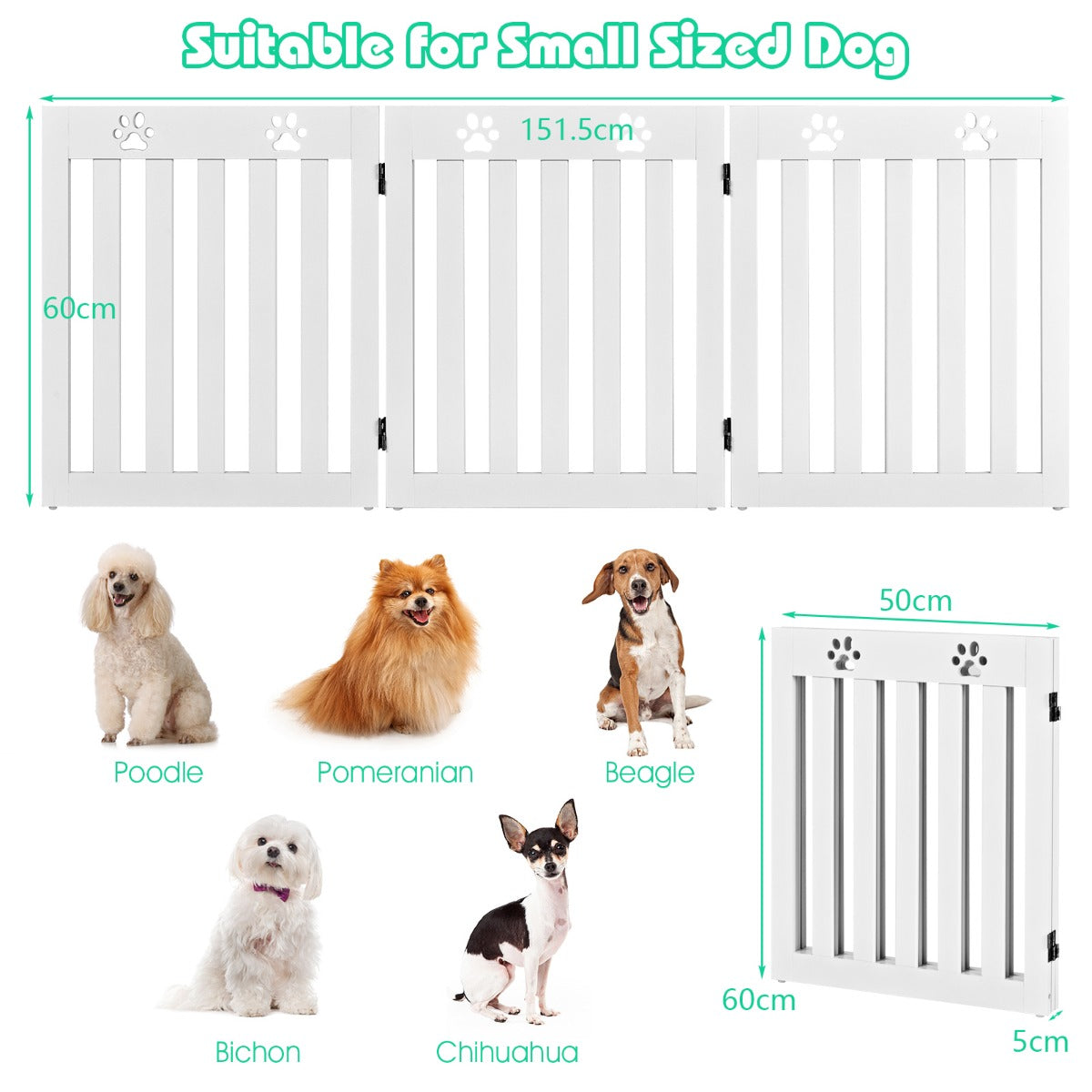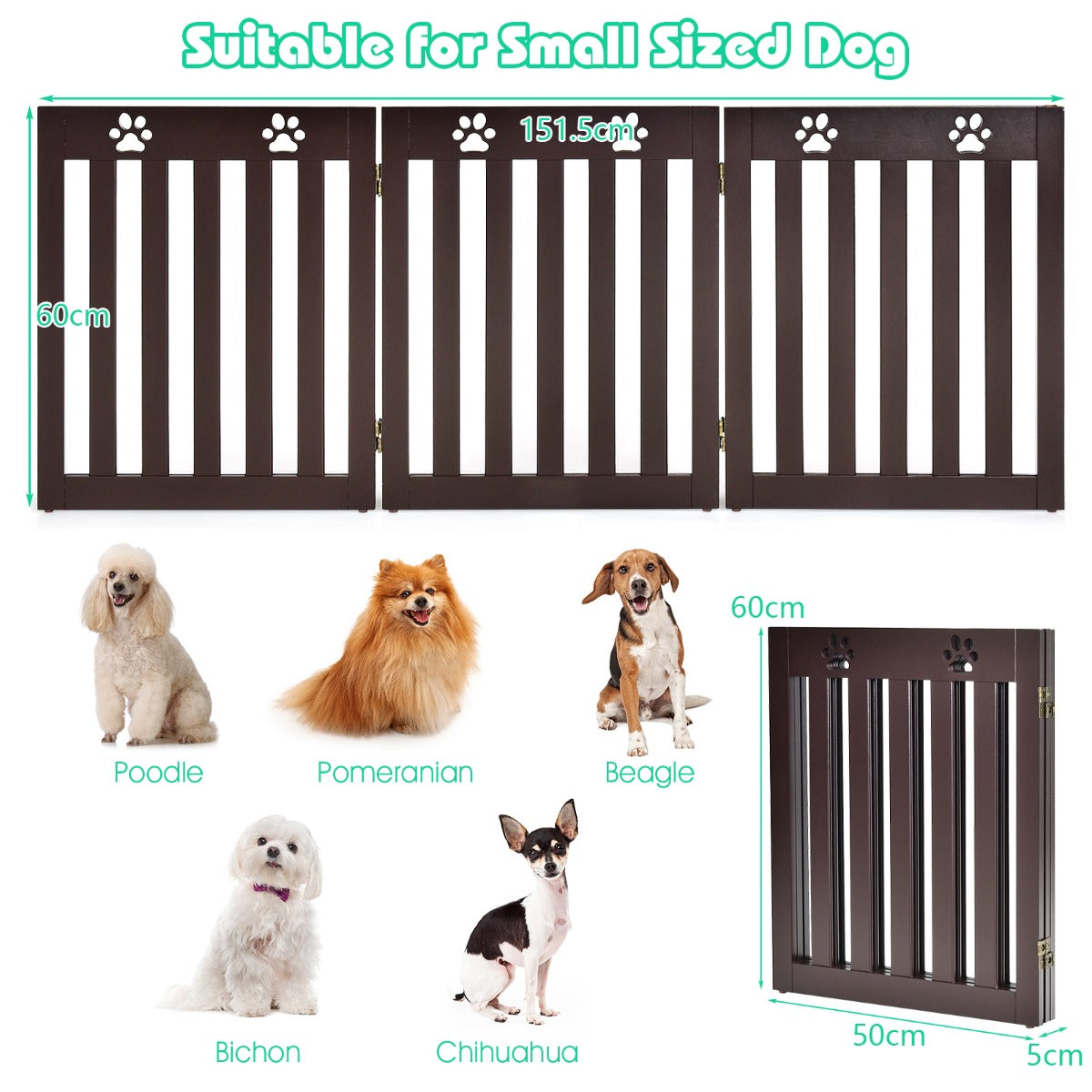 Extra Wide and Tall: Dimension of unfolding: 151.5 x 60 x 1.5 cm (W x H x D), Dimension of folding: 50 x 60 x 5 cm (W x H x D), Dimension of single panel: 50 x 60 x 1.5 cm (W x H x D), Spacing between slat: 3.5 cm. It is perfect for small sized dog.